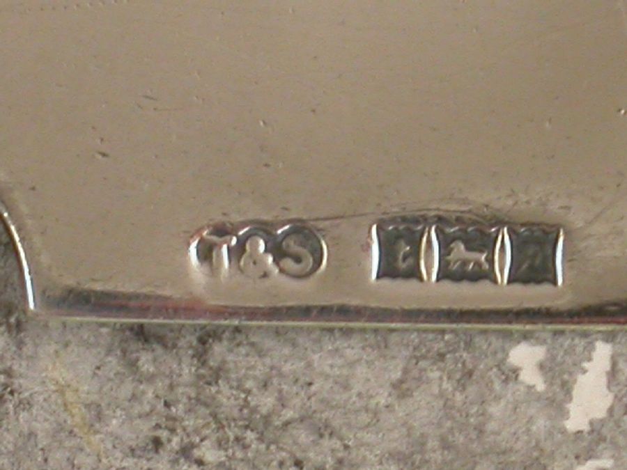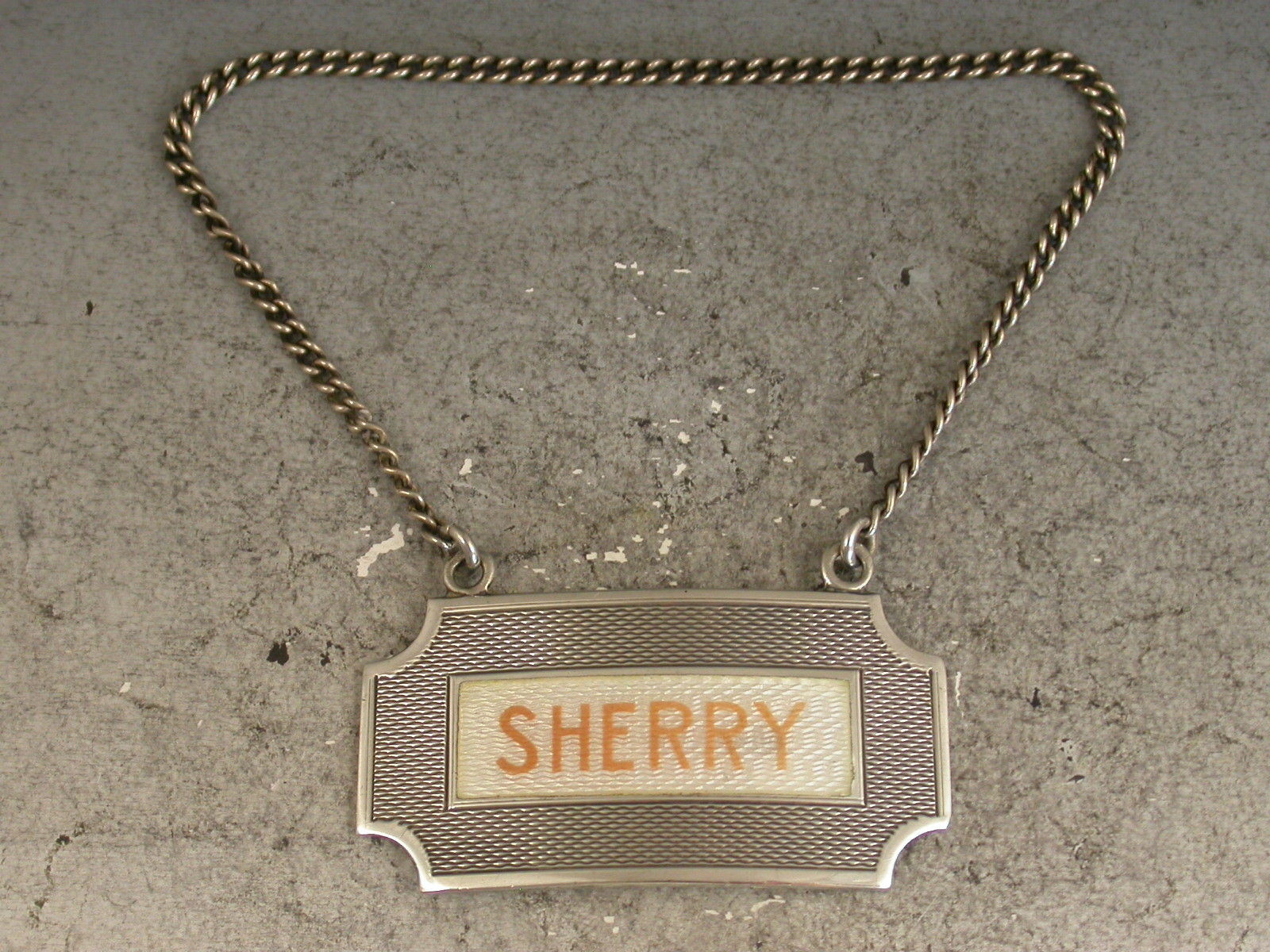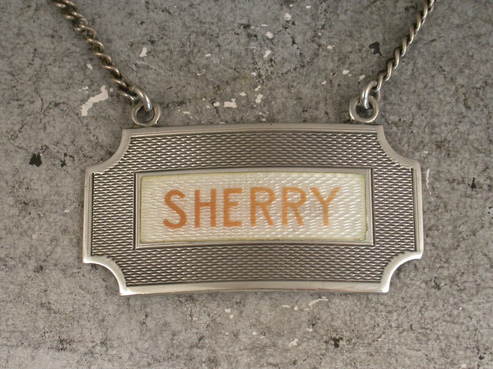 A good mid 20th century silver and enamel Wine Label in the Art Deco style, of rectangular form with raised eyelets and concave cut-corners, engine turned background and guilloche enamel panel with the name Sherry in orange enamel (an unusual colour).