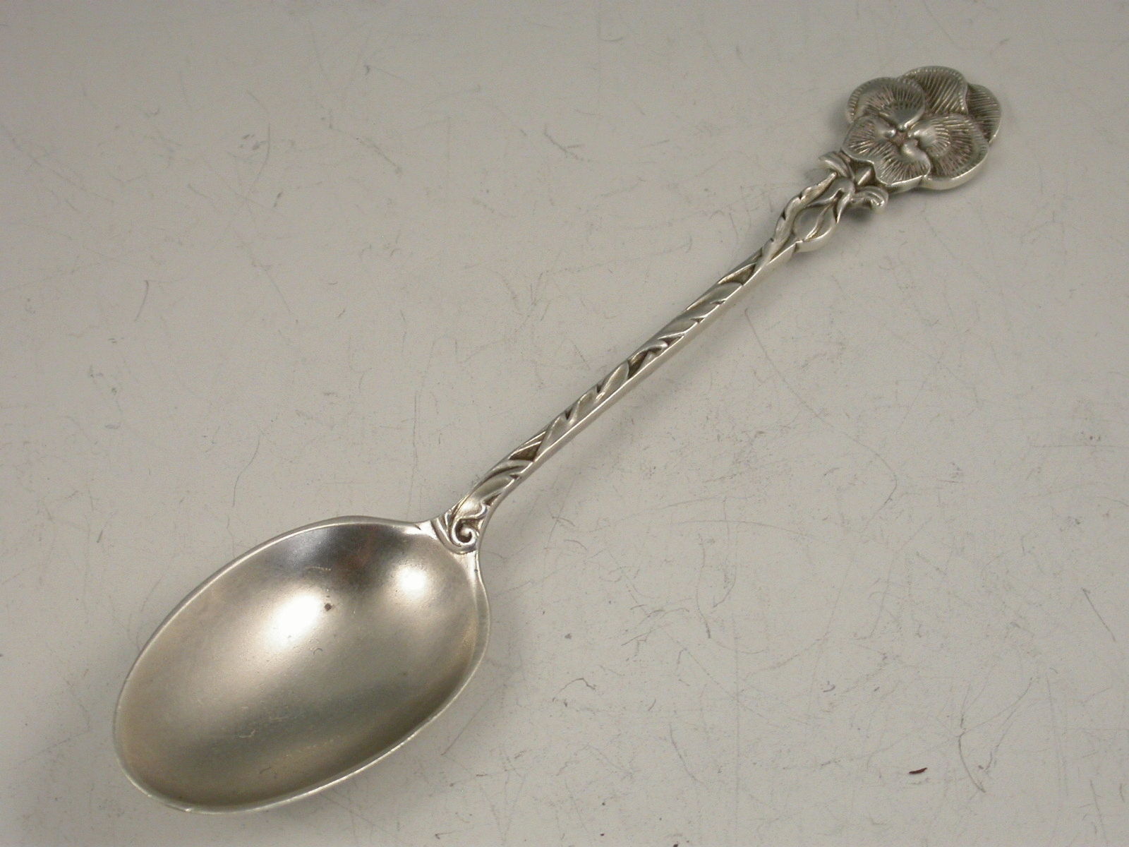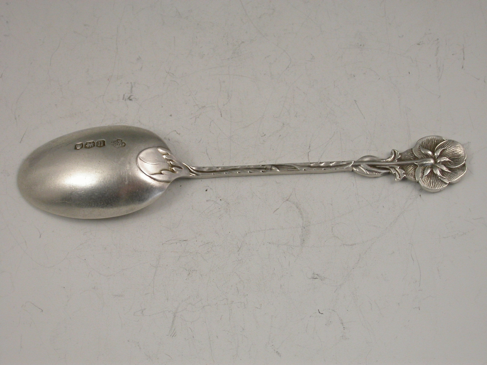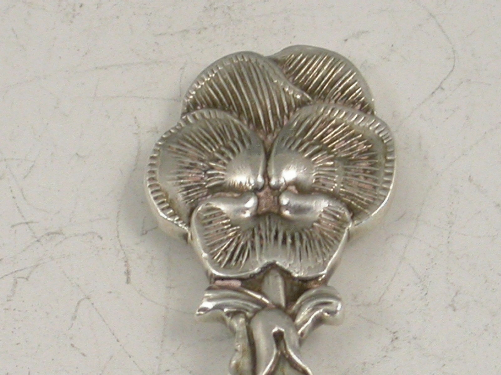 A fine early 20th century silver Tea Spoon, the handle cast as a Pansy in an Art Nouveau style, the terminal depicting both the back and the front of the flower head.