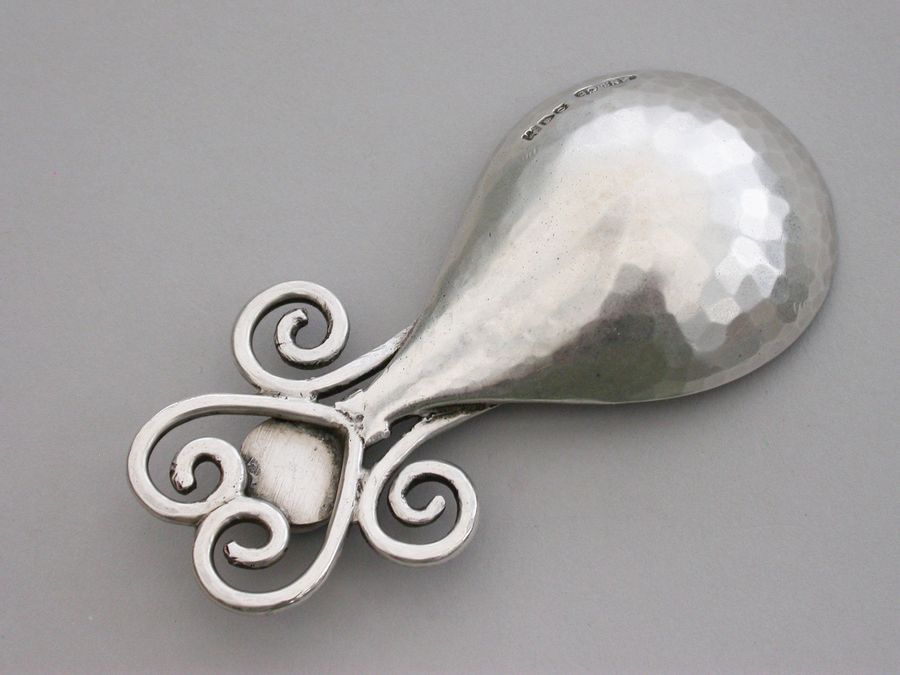 A fine quality rare Arts & Crafts cast silver Caddy Spoon with hammered fig shaped bowl, the handle set with turquoise blue and green enamel boss between four coiled and linked wires.