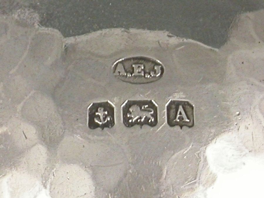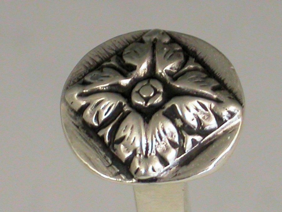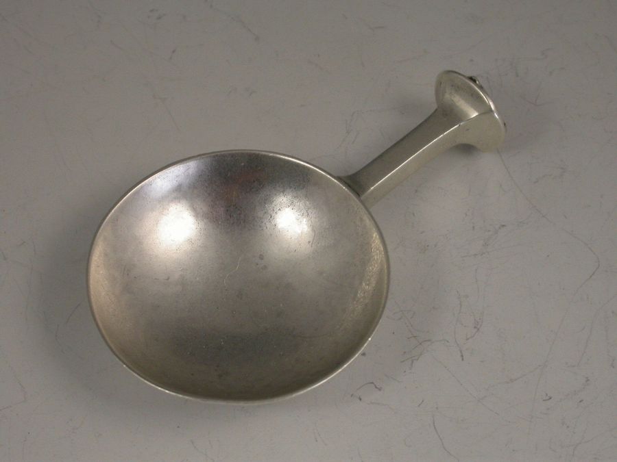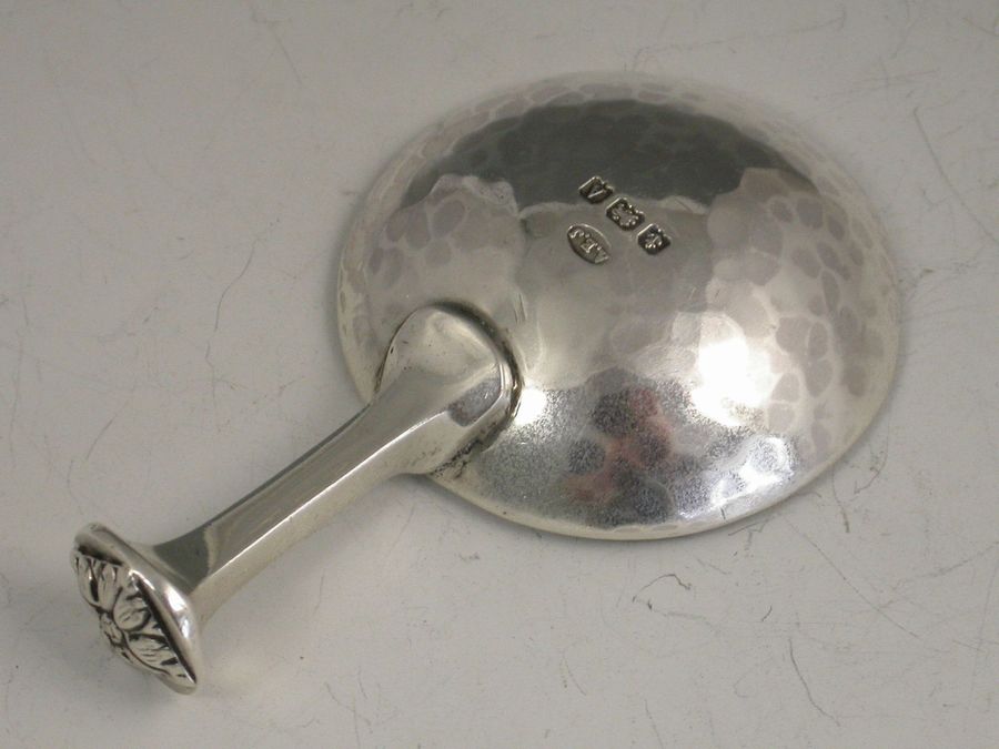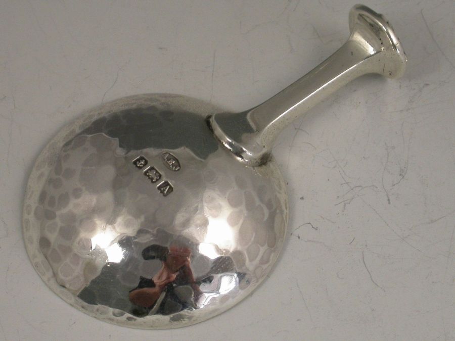 An early 20th century silver Caddy Spoon in the Arts & Crafts style with circular hammered silver bowl, the square seal type handle with acanthus leaf finial.