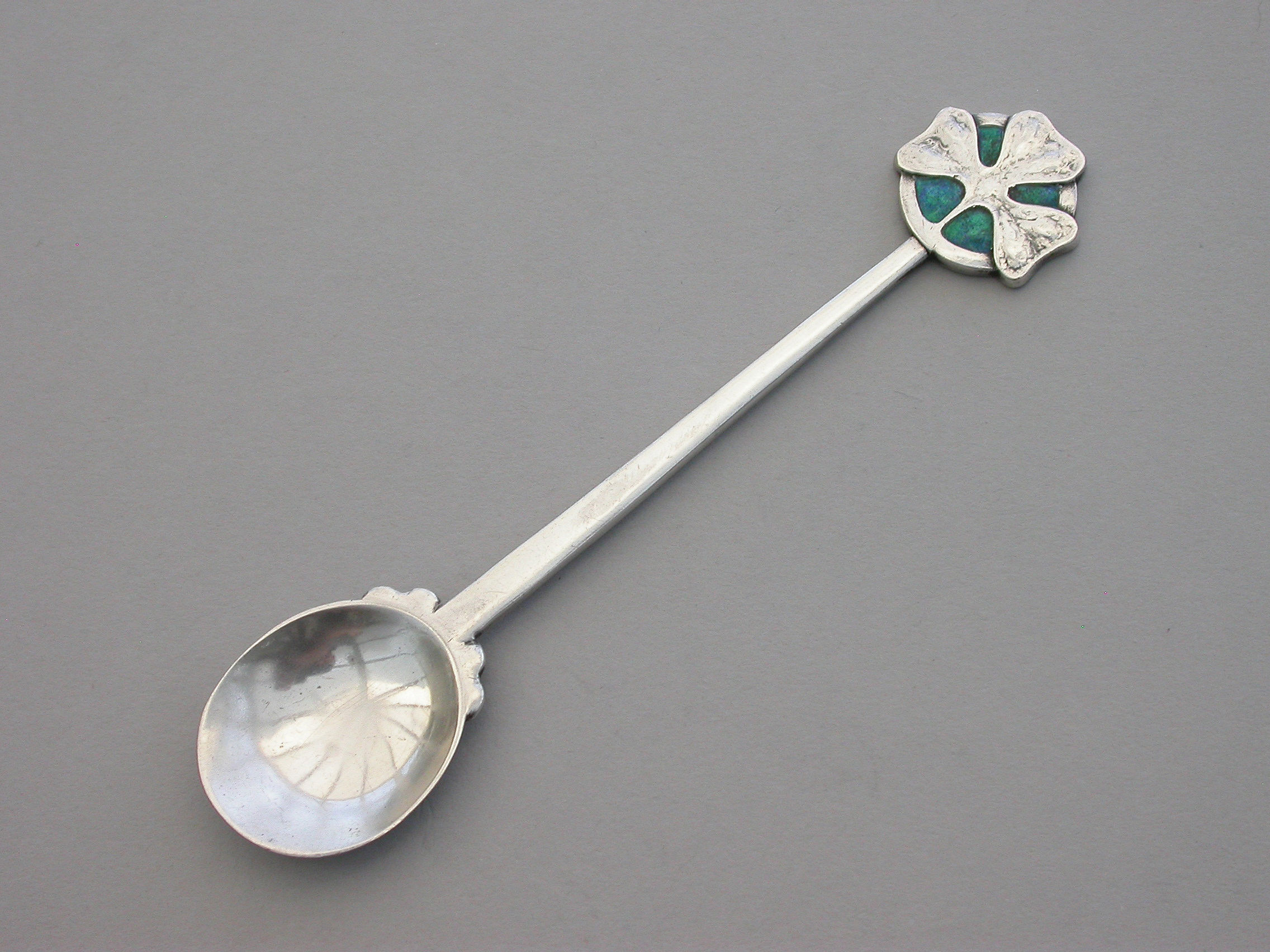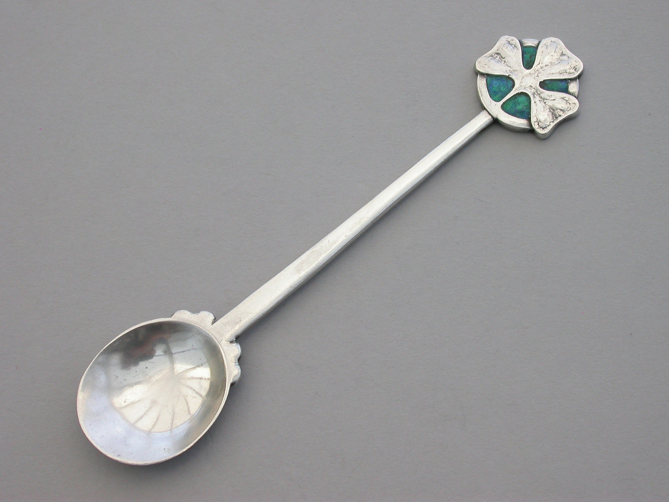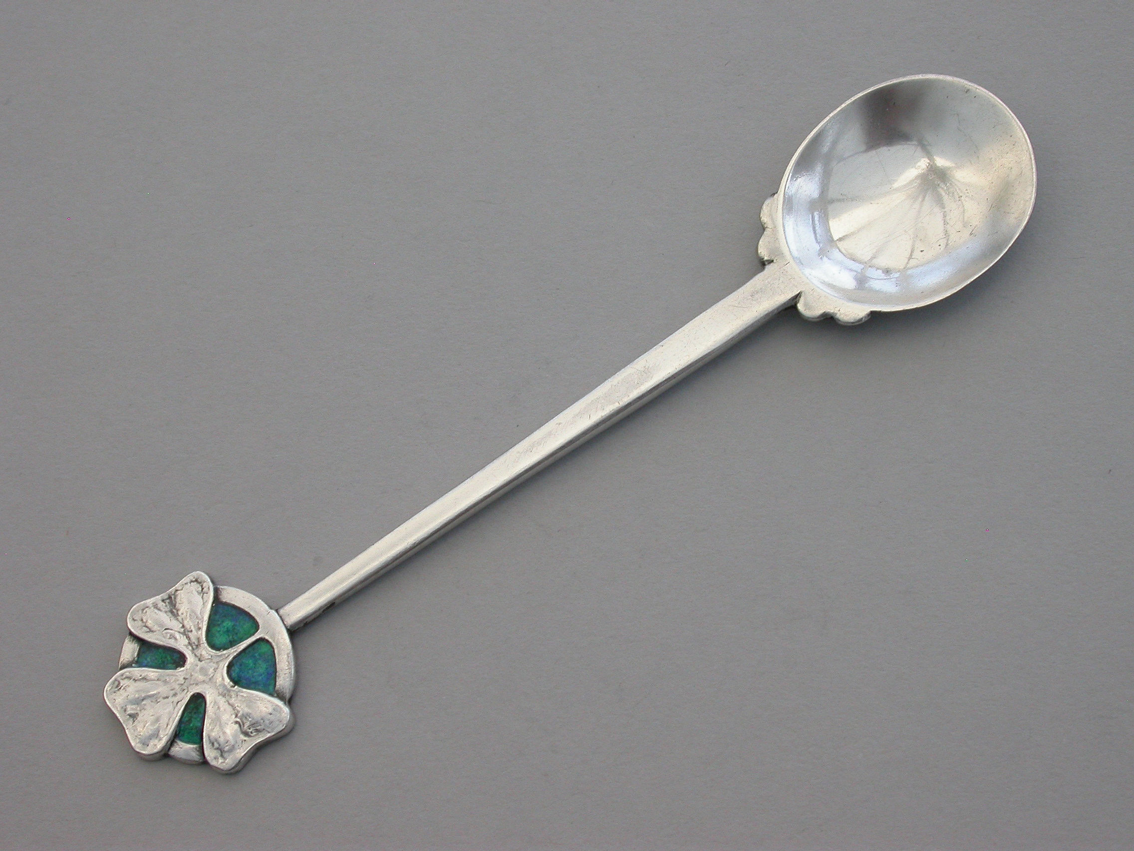 A rare early 20th century Arts & Crafts silver and enamel Teaspoon with a trefoil terminal (pattern number 395), probably designed by Archibald Knox for Liberty & Co, and manufactured by William Hair Haseler.