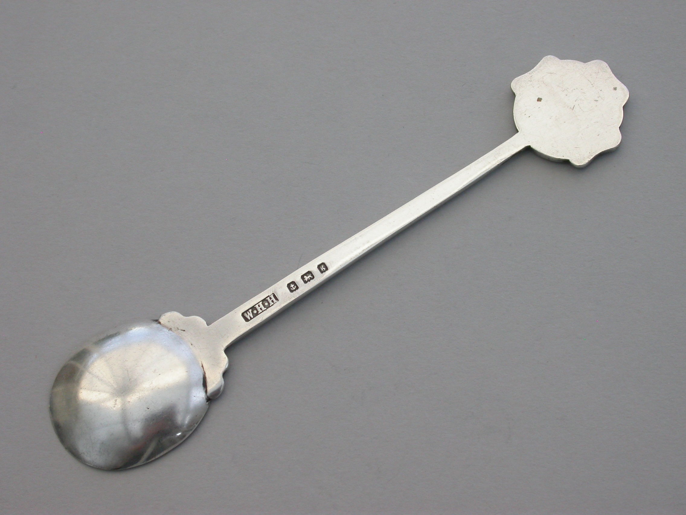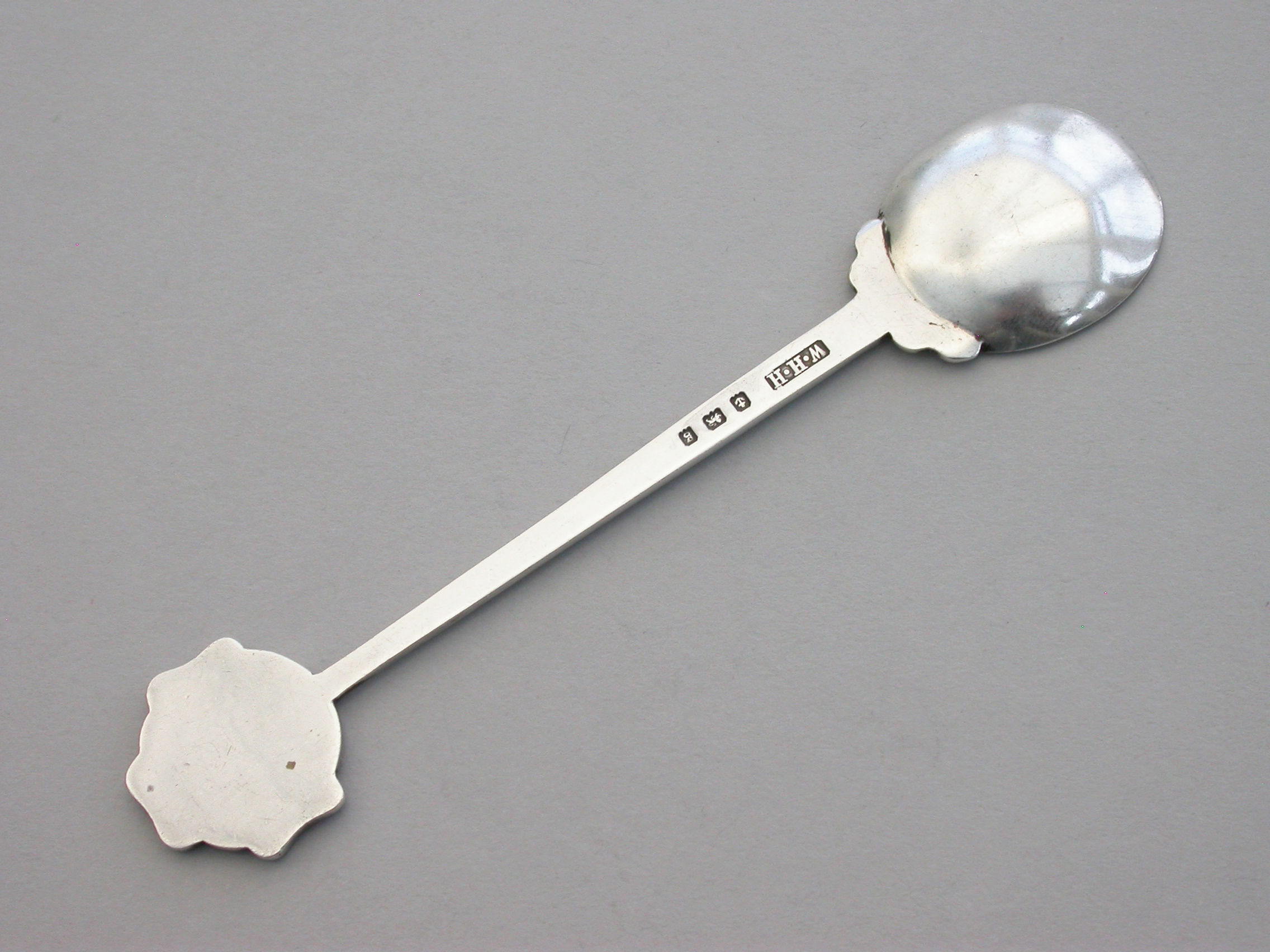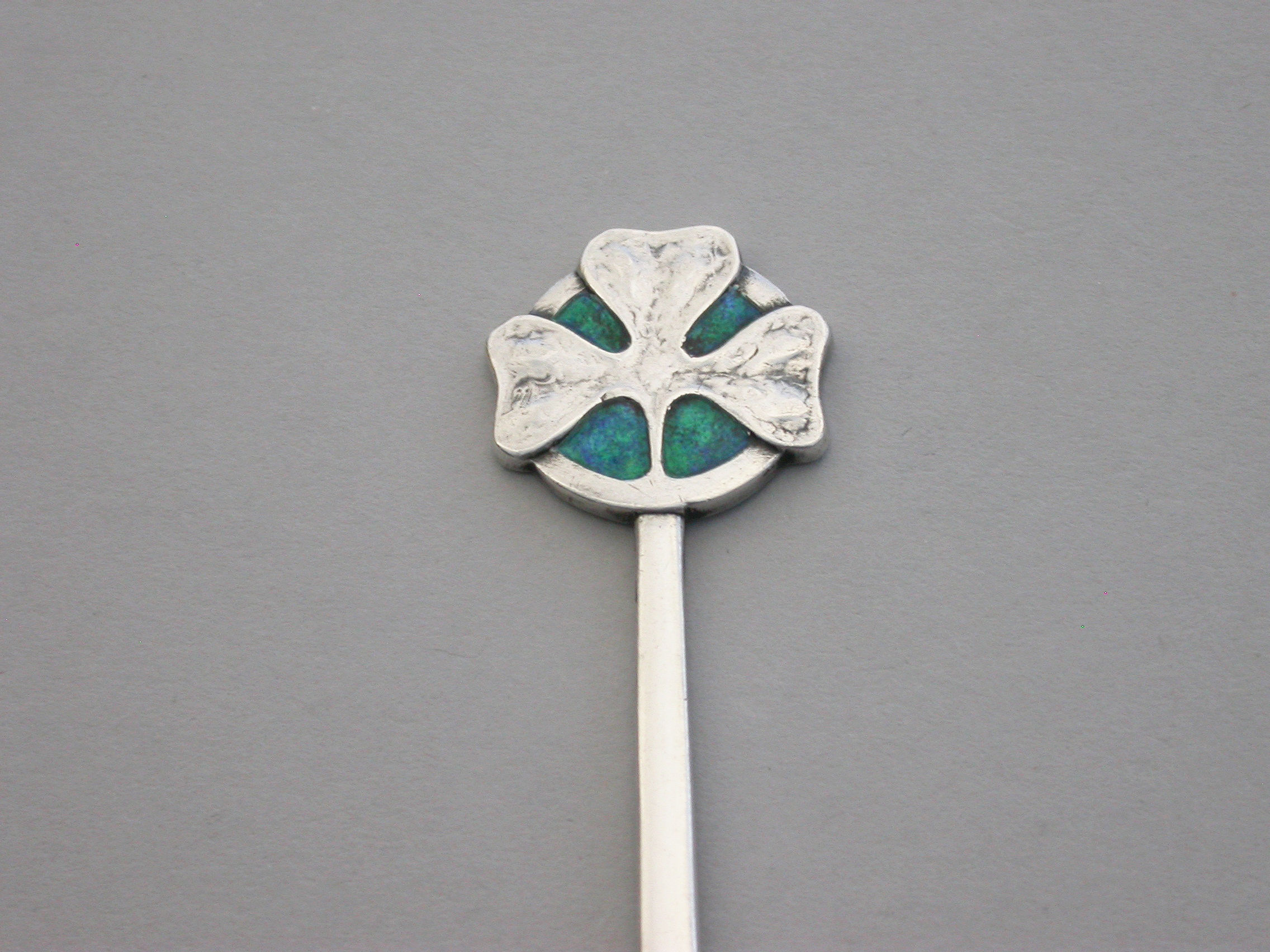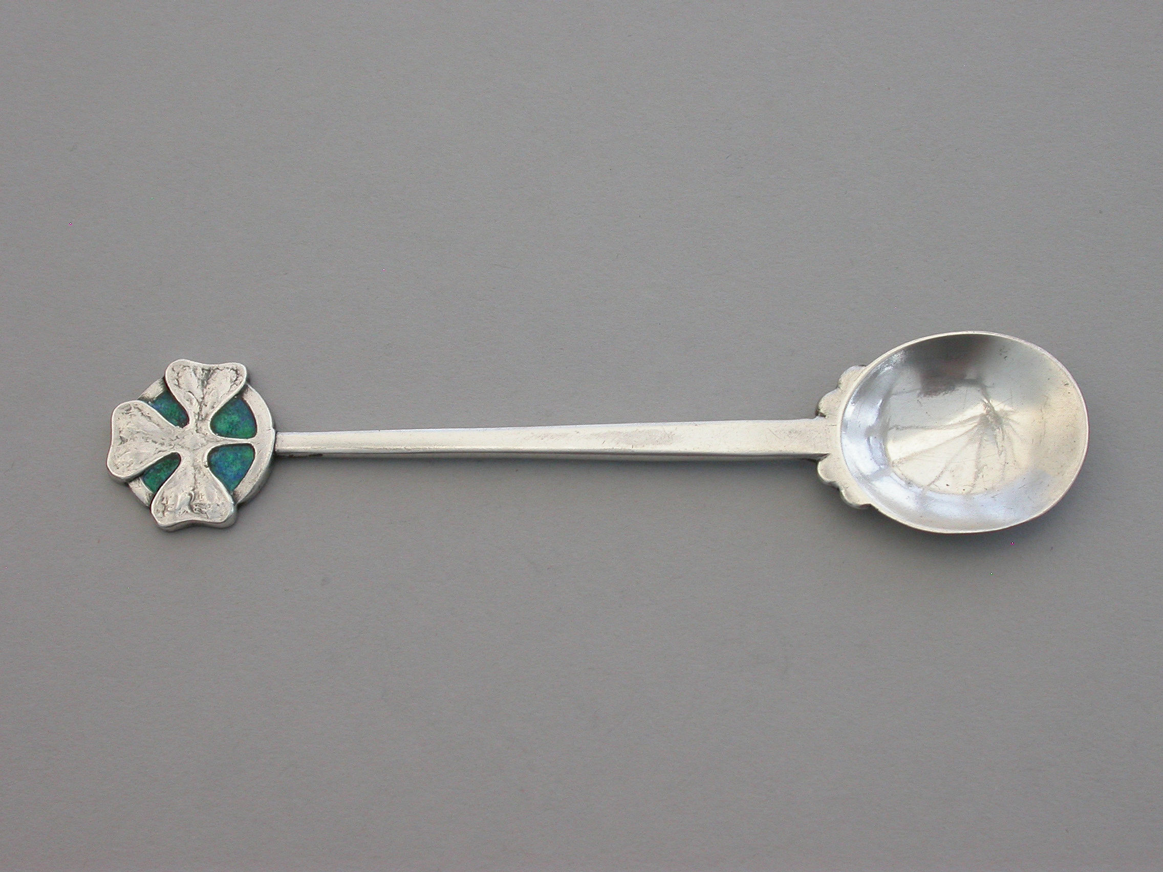 A rare early 20th century Arts & Crafts silver and enamel Teaspoon with a trefoil terminal (pattern number 395), probably designed by Archibald Knox for Liberty & Co, and manufactured by William Hair Haseler.