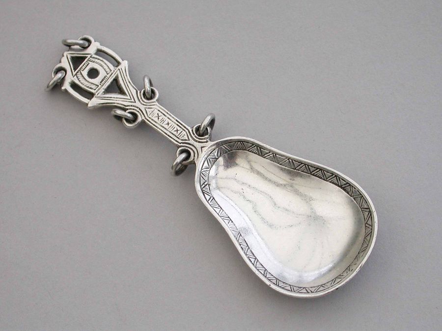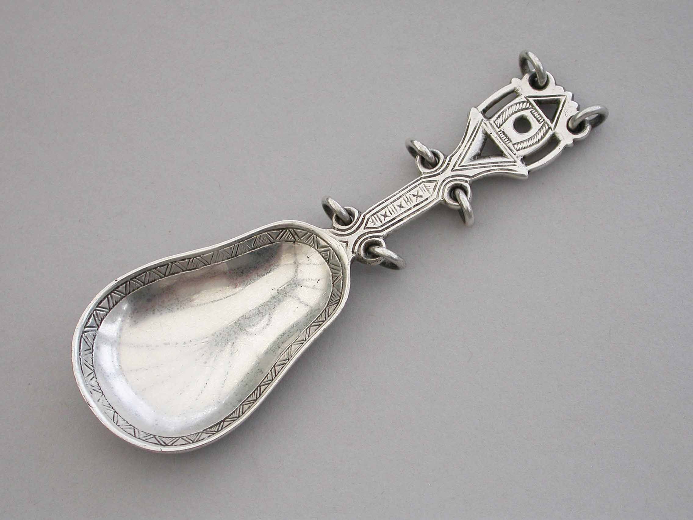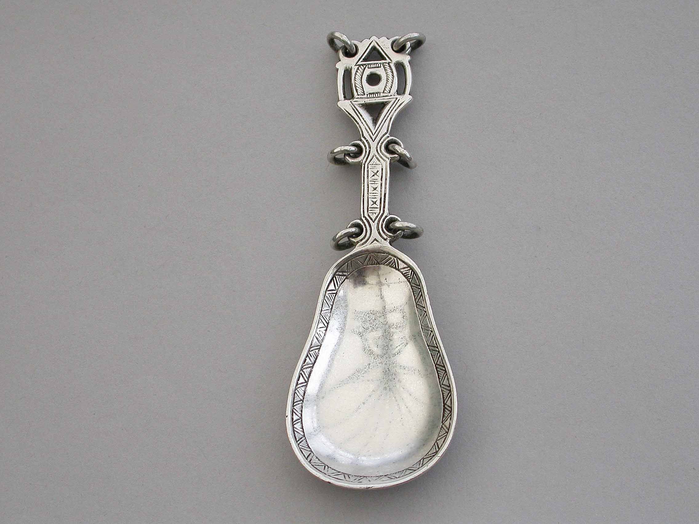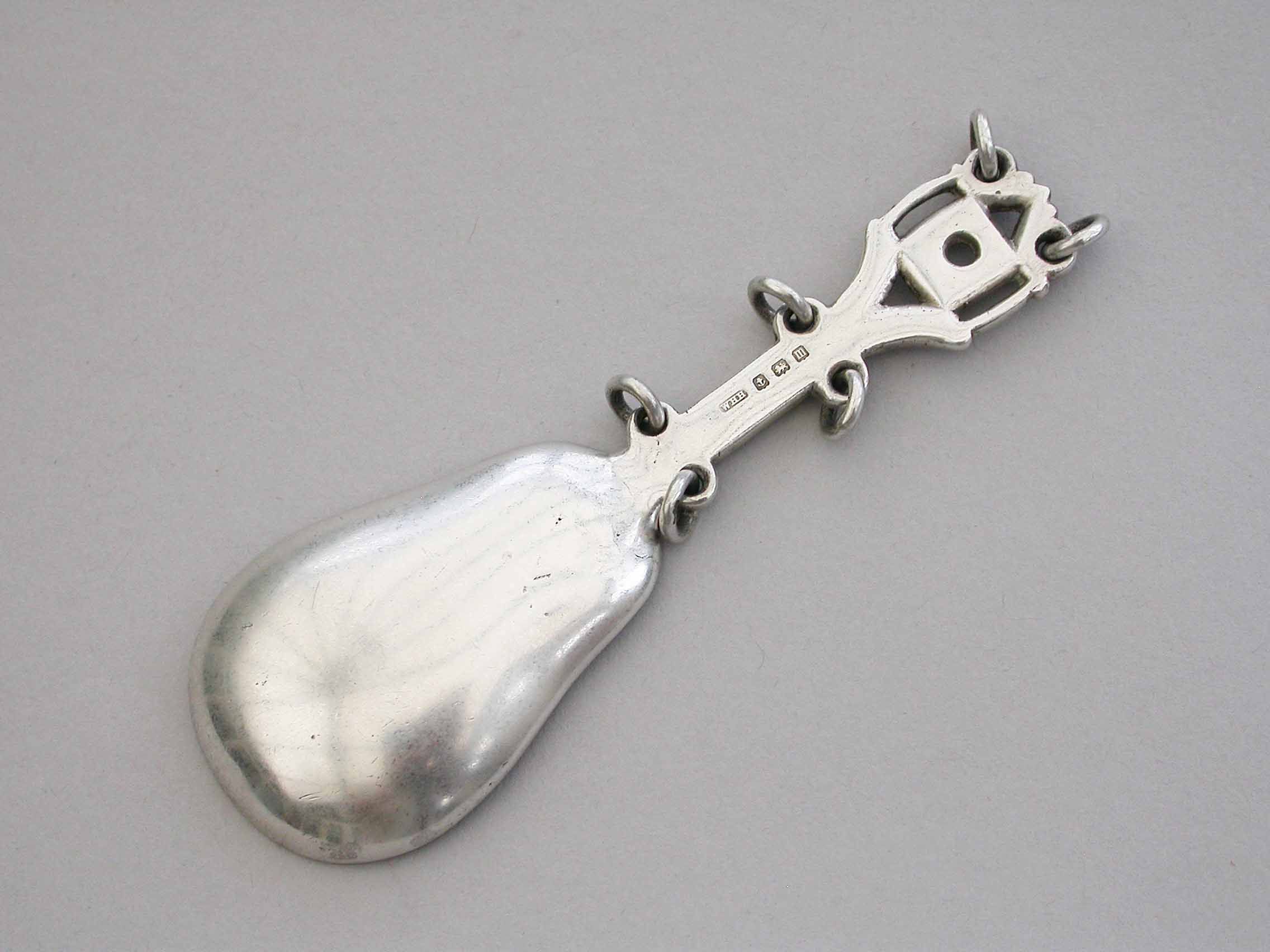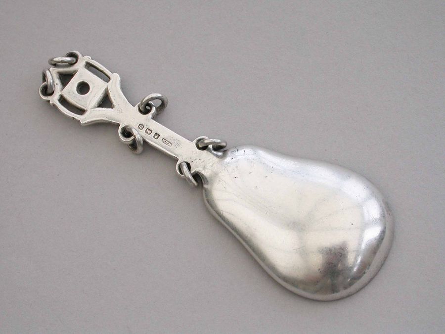 A good quality early 20th century Arts & Crafts cast silver Caddy Spoon, with pear shaped bowl and Scandinavian style pierced handle with six attached rings.