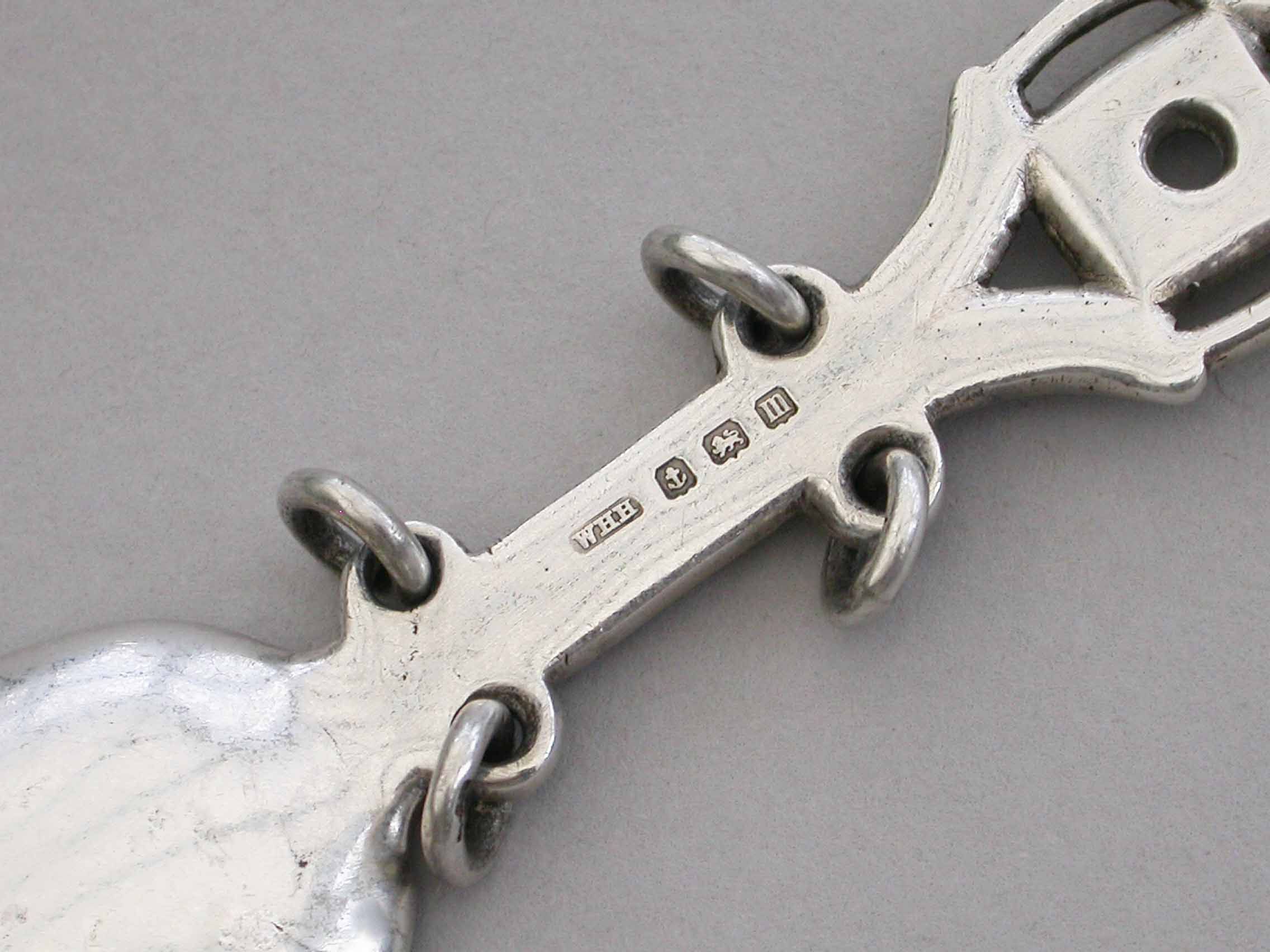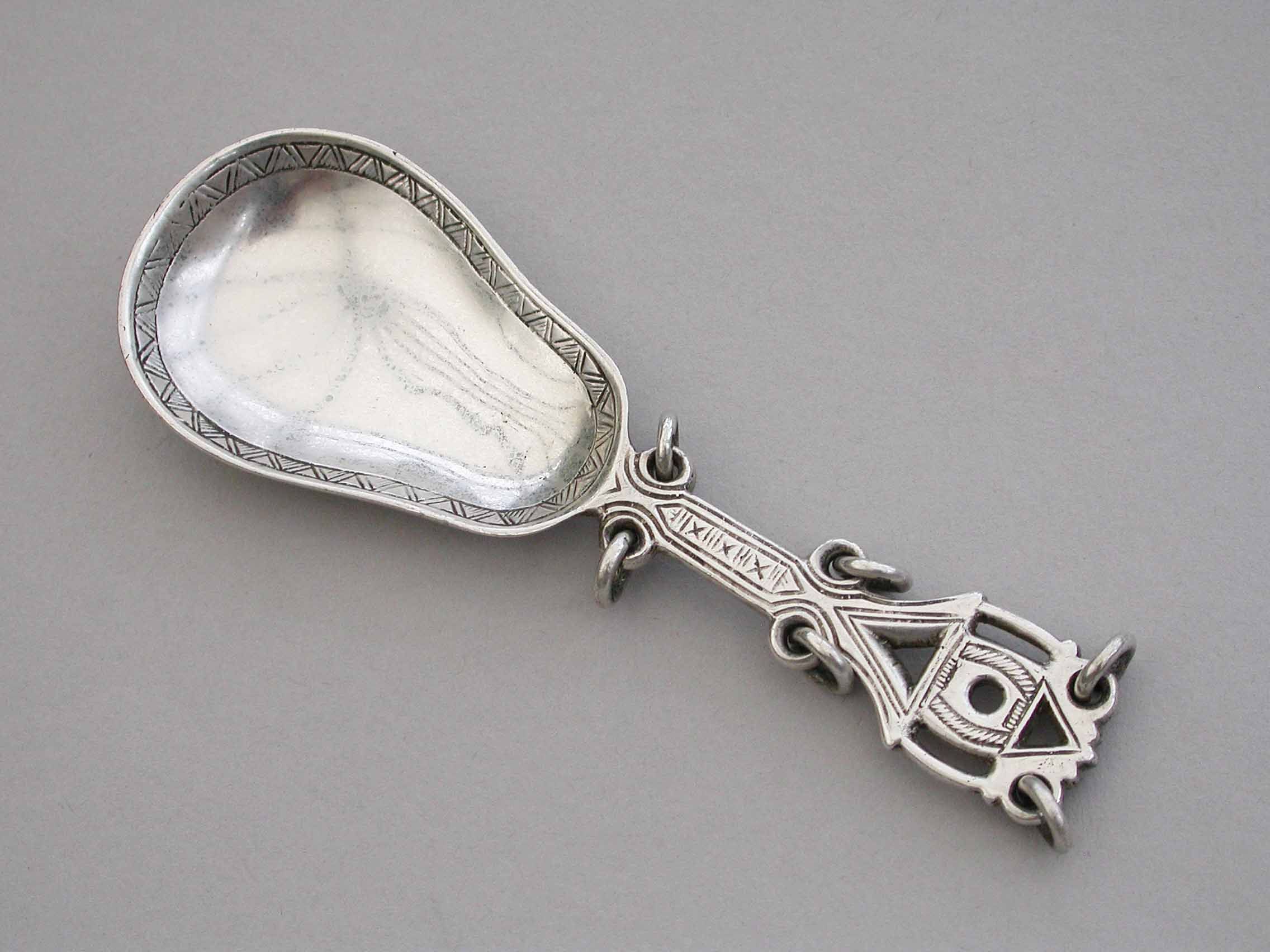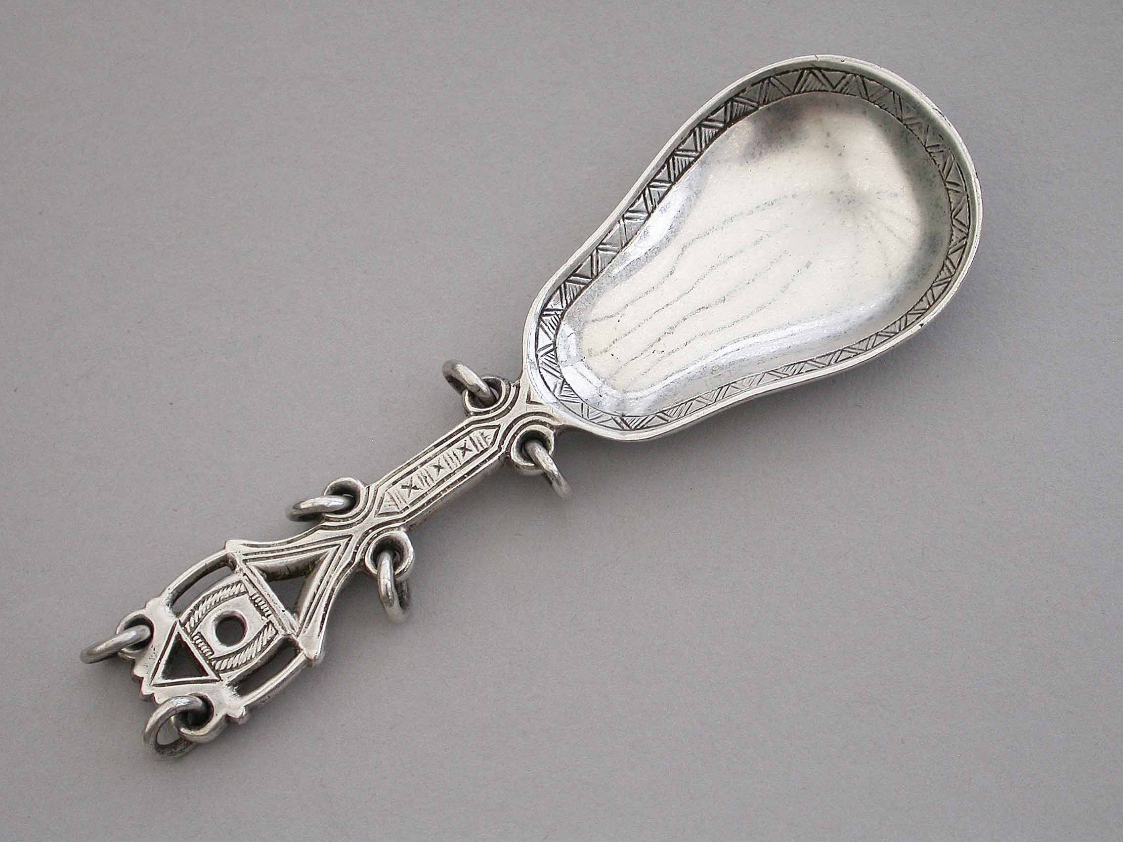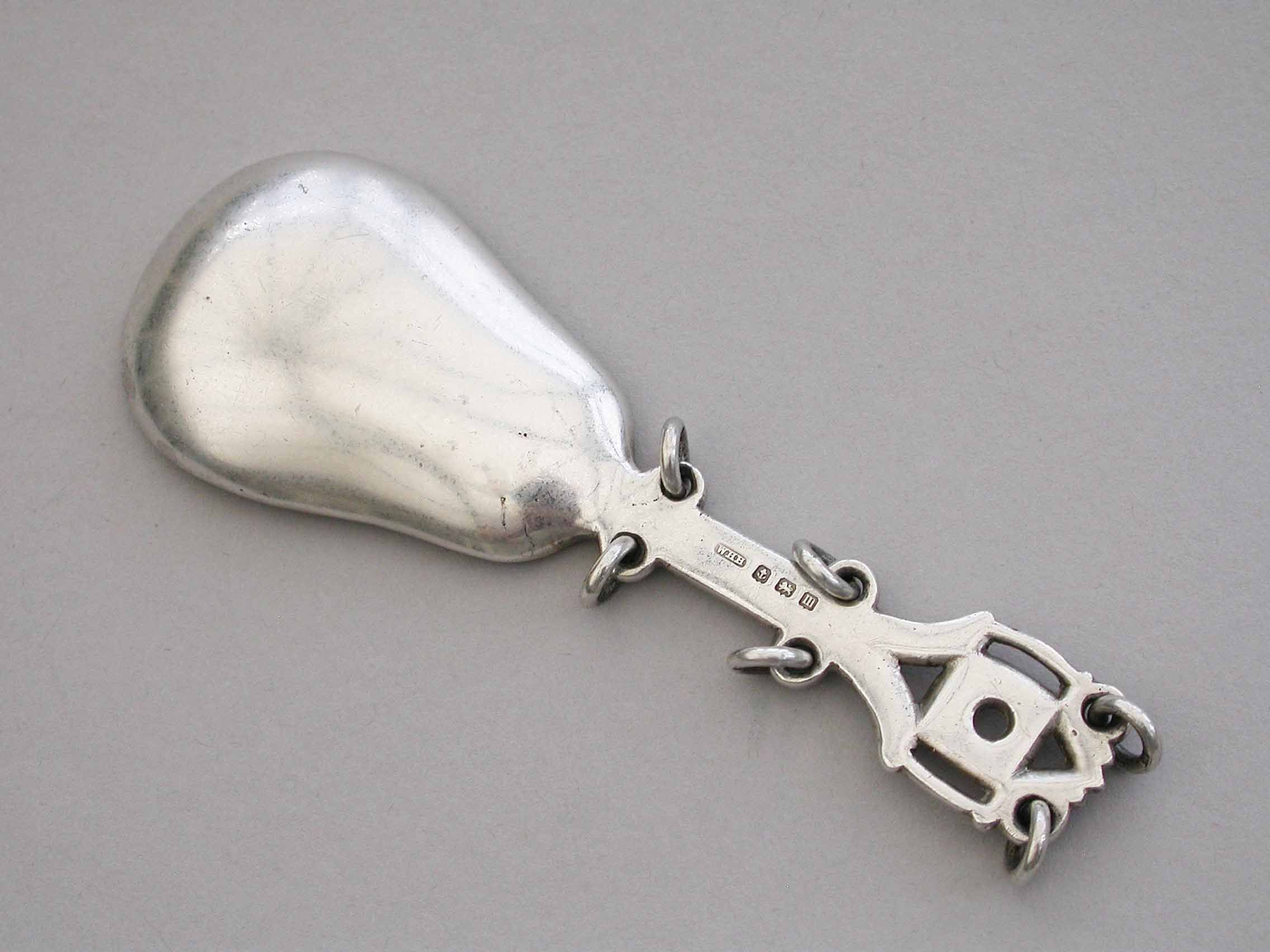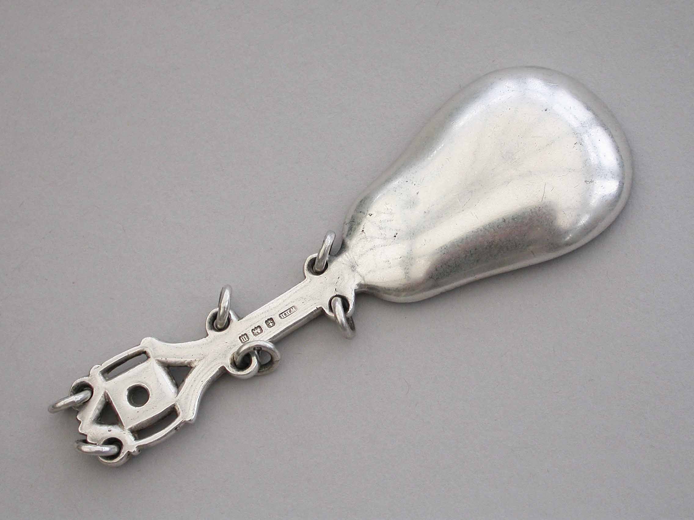 A good quality early 20th century Arts & Crafts cast silver Caddy Spoon, with pear shaped bowl and Scandinavian style pierced handle with six attached rings.