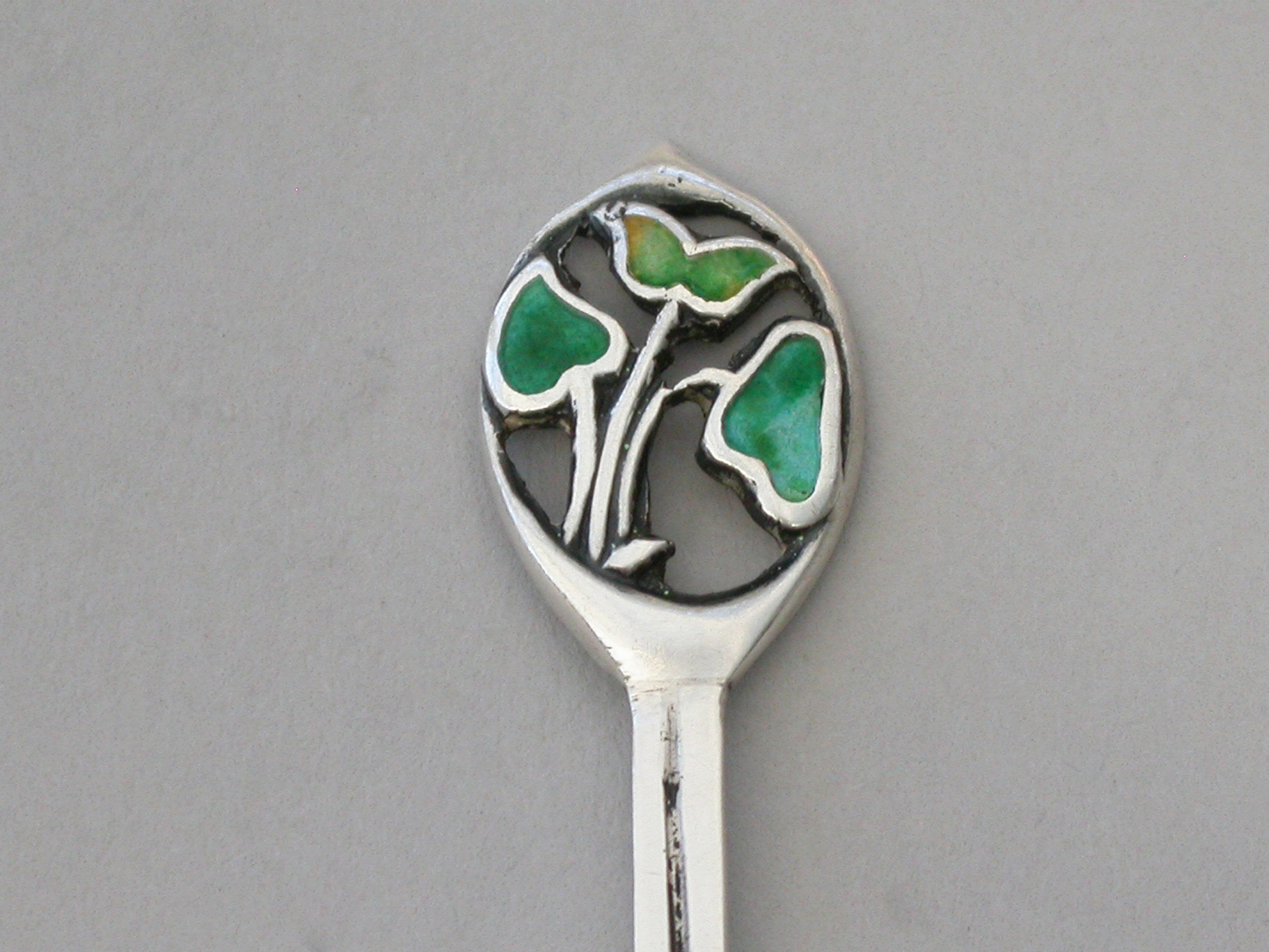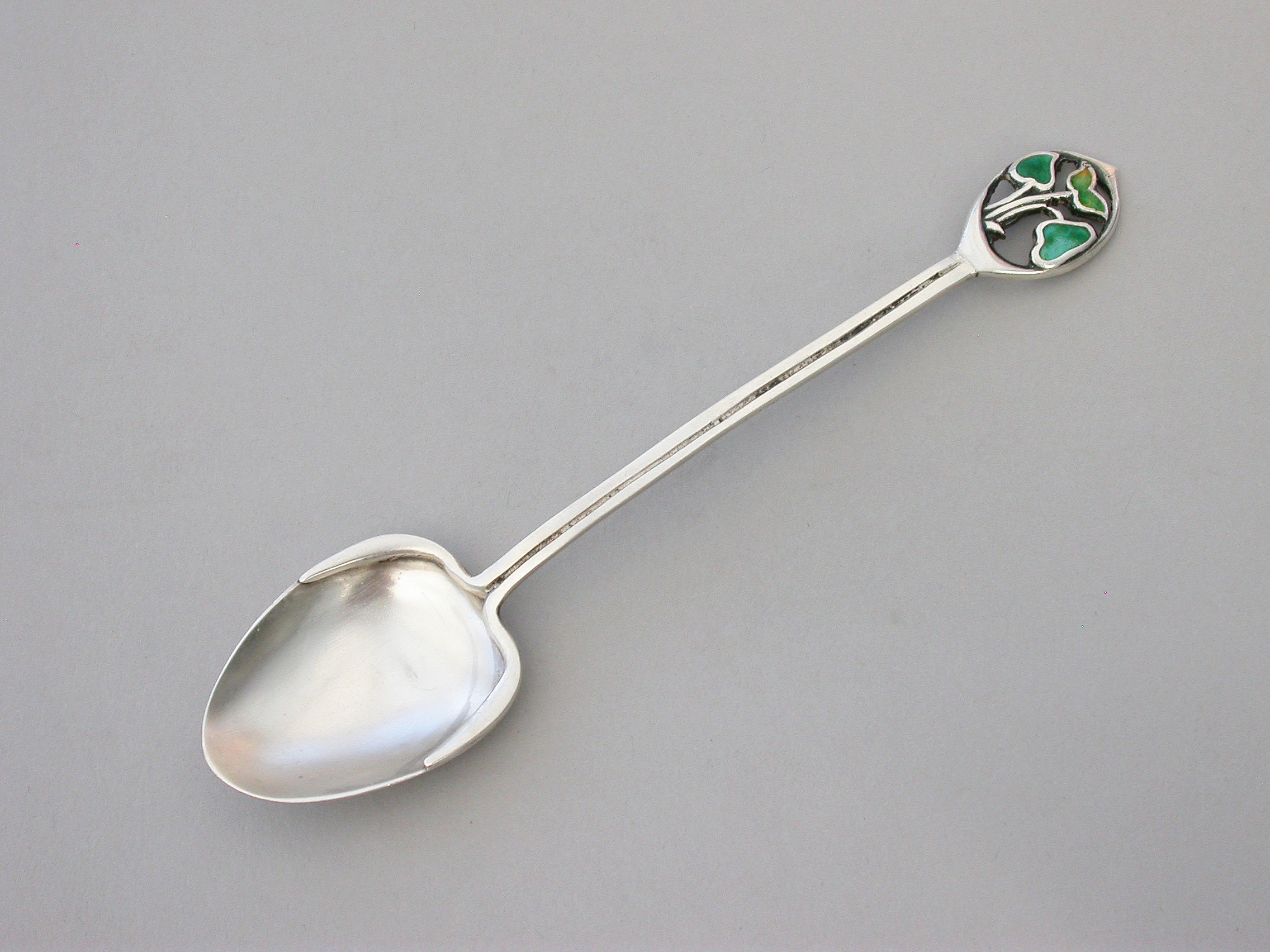 An early 20th century Arts & Crafts silver and enamel ""triple leaf"" Teaspoon, probably designed by Archibald Knox, the stem stamped - CYMRIC.