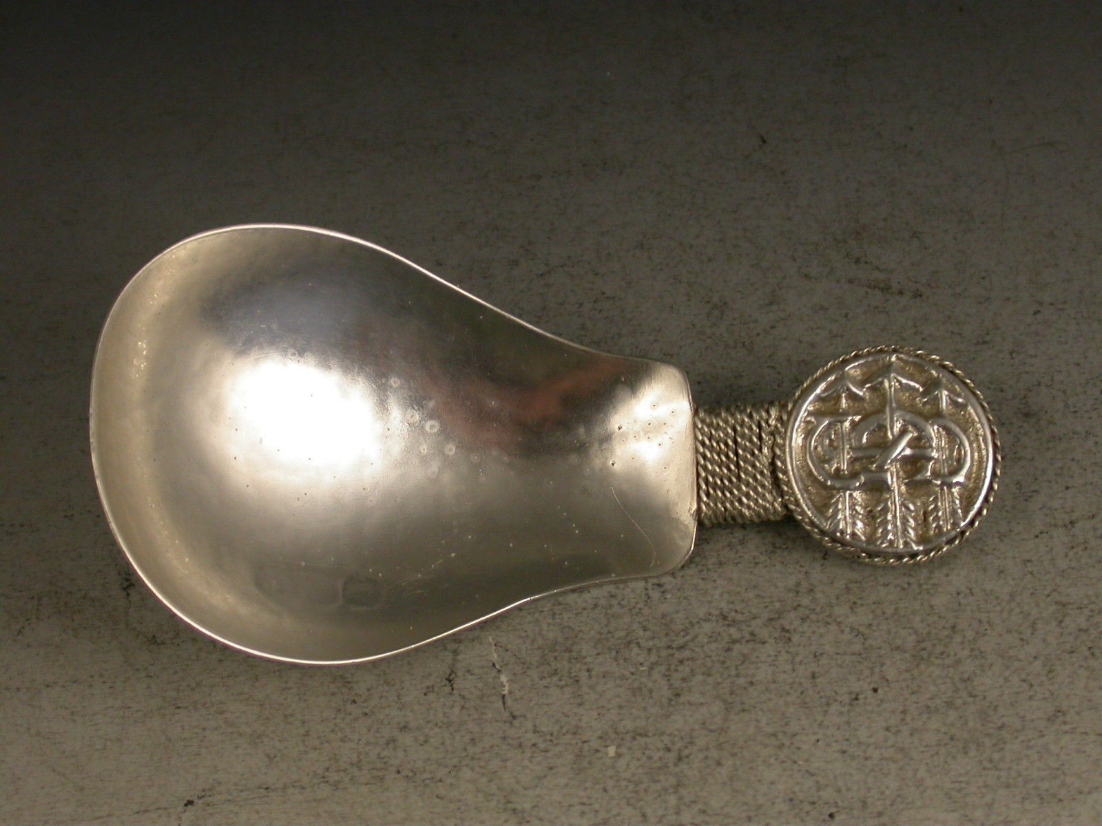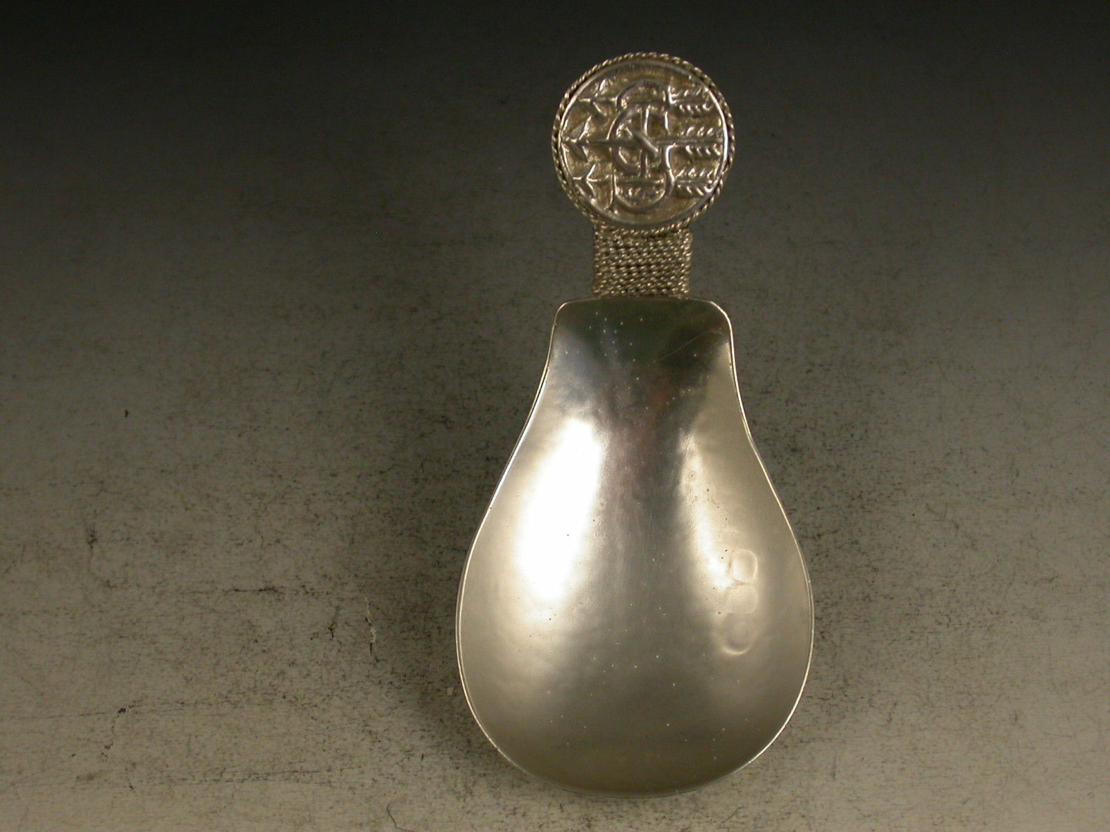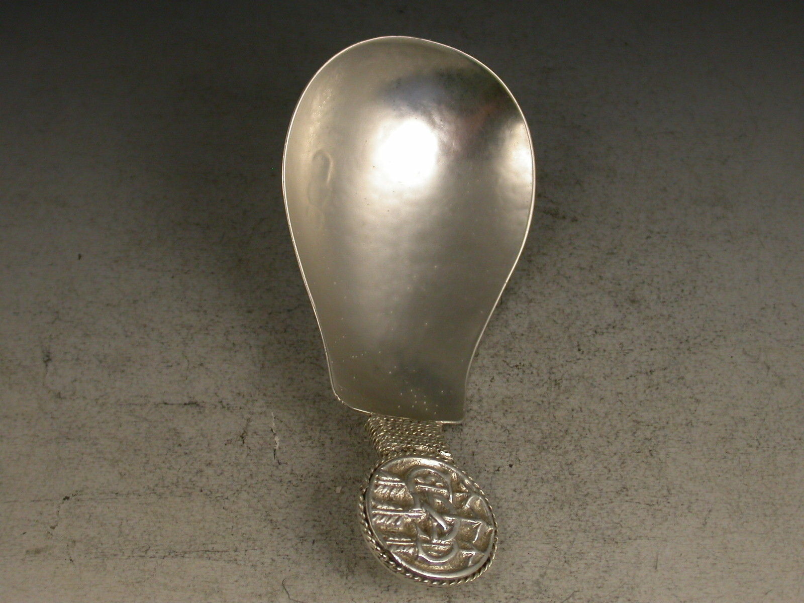 A fine early 20th century 'Arts & Crafts' cast silver caddy Spoon with hammered pear shaped bowl, the disc shaped terminal with rope twist border chased with inter-twinned initials 'GS' pierced by three arrows.