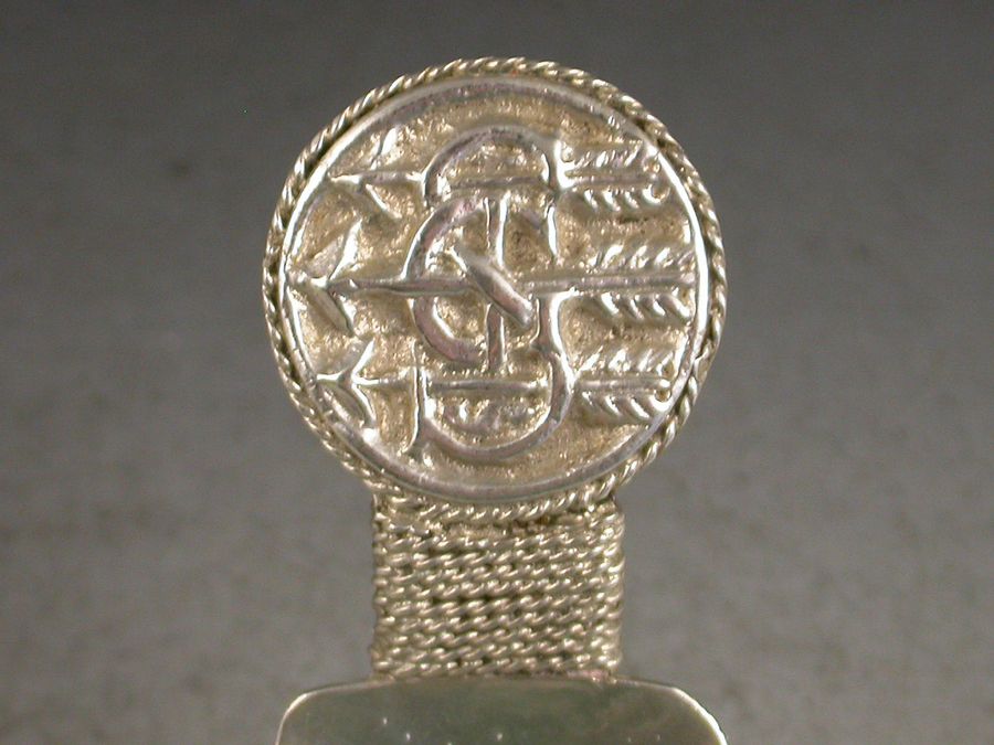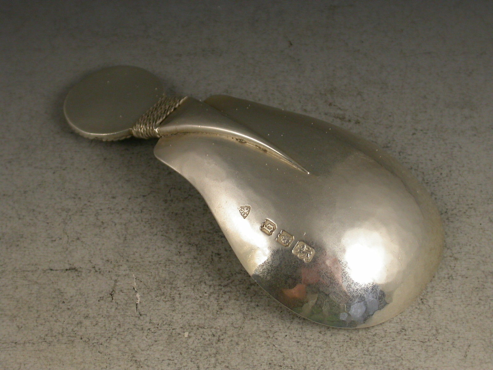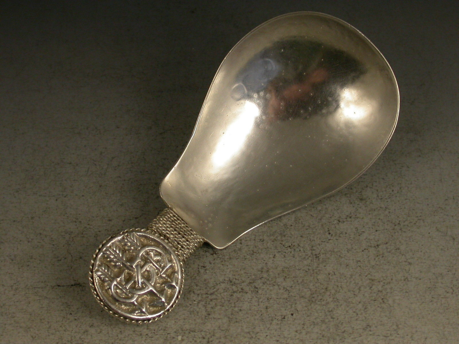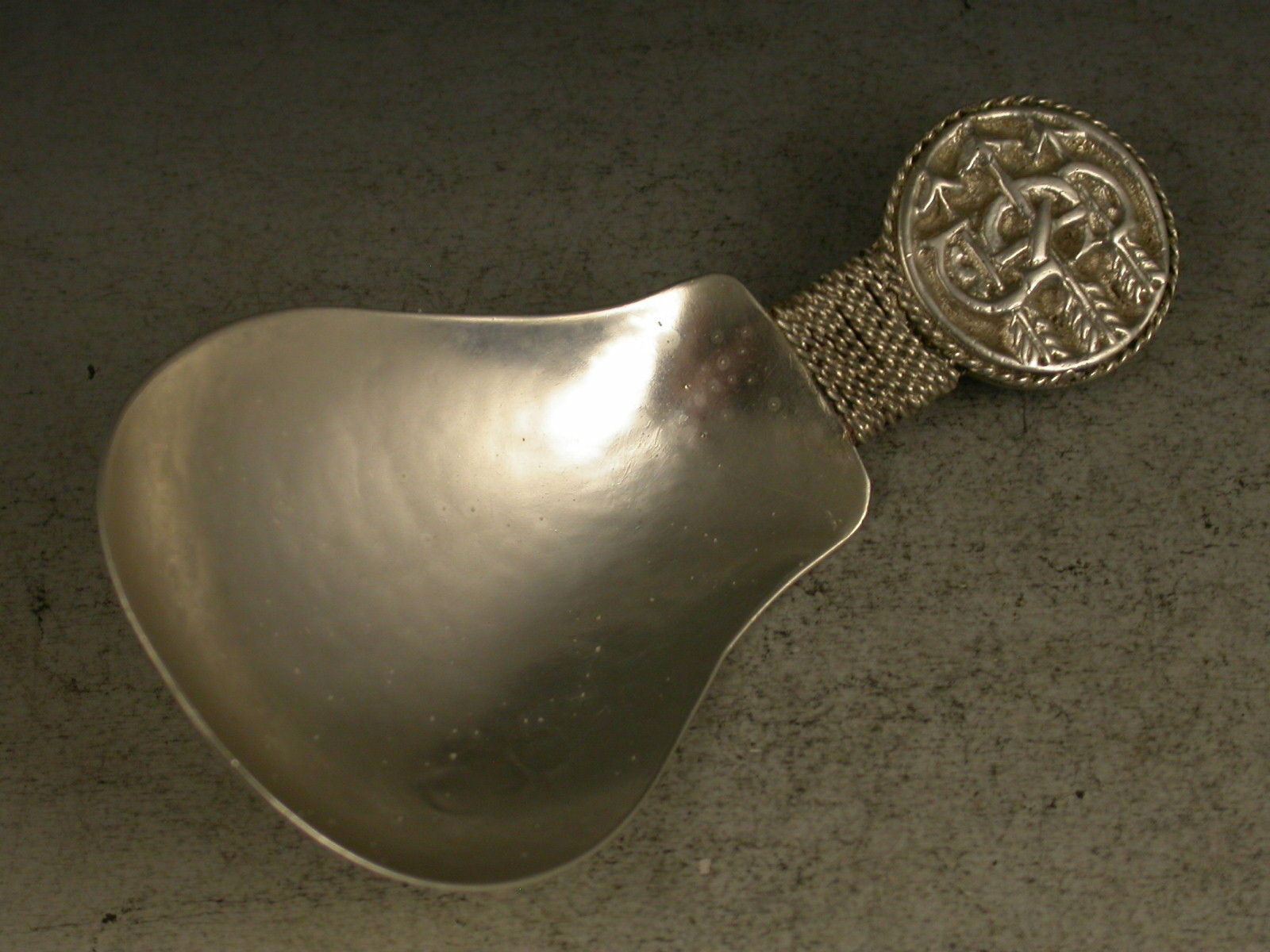 A fine early 20th century 'Arts & Crafts' cast silver caddy Spoon with hammered pear shaped bowl, the disc shaped terminal with rope twist border chased with inter-twinned initials 'GS' pierced by three arrows.