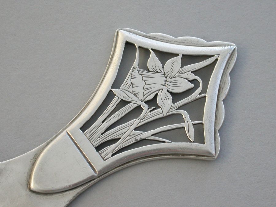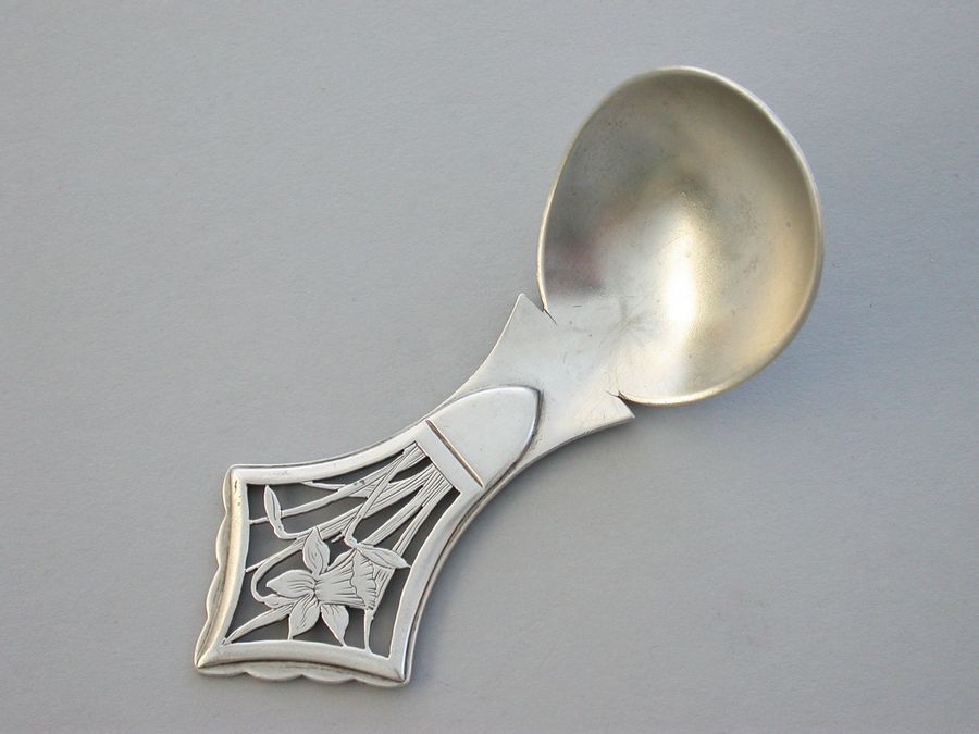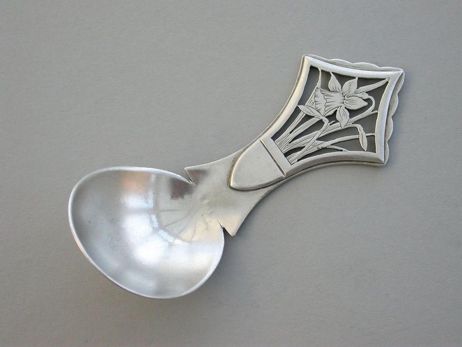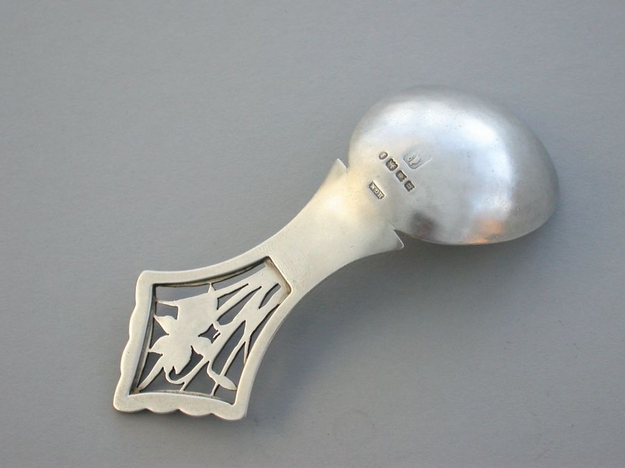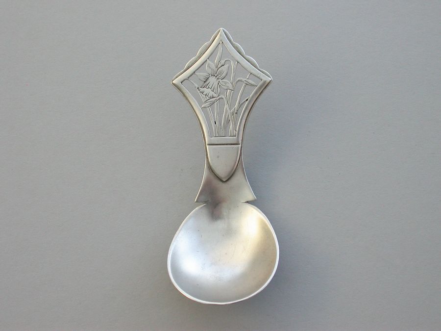 An extremely rare early 20th century Arts & Crafts silver Caddy Spoon, the angular handle pierced and engraved with daffodils. Very similar in design to the well known ""Tree of Life"" Caddy Spoon by the same maker.