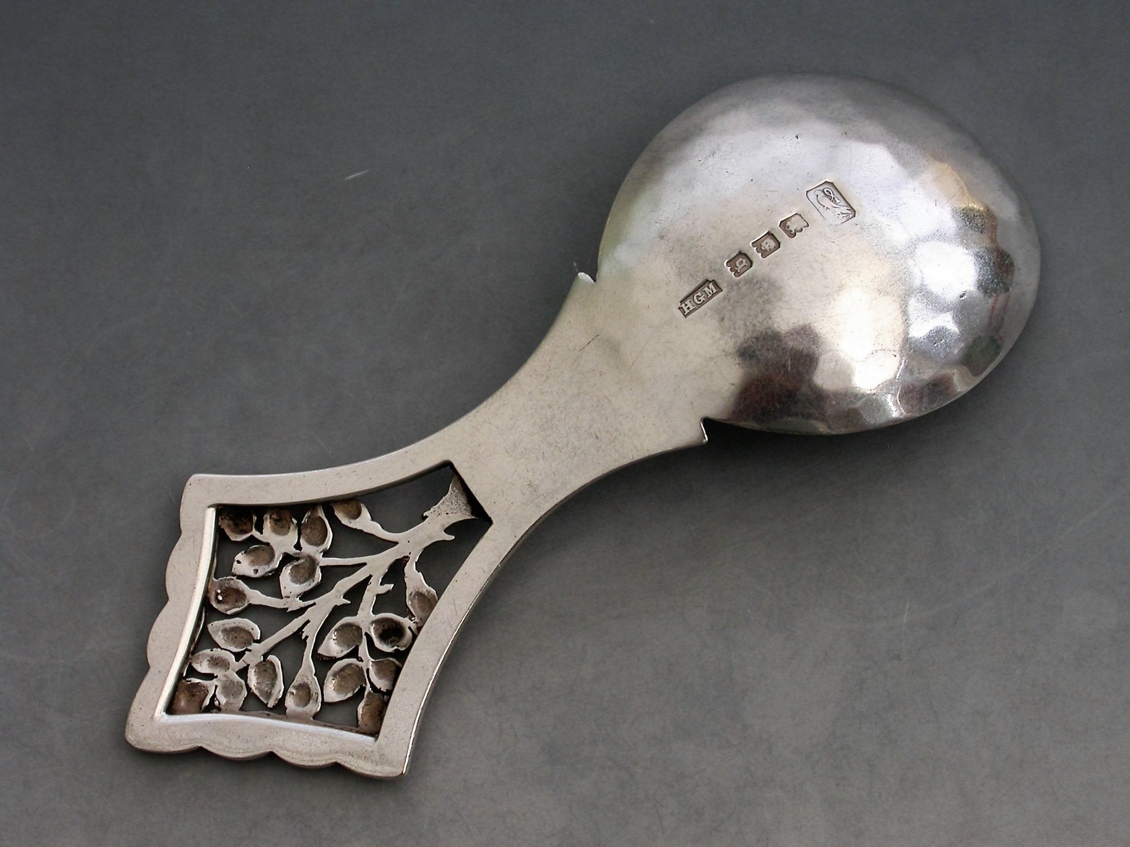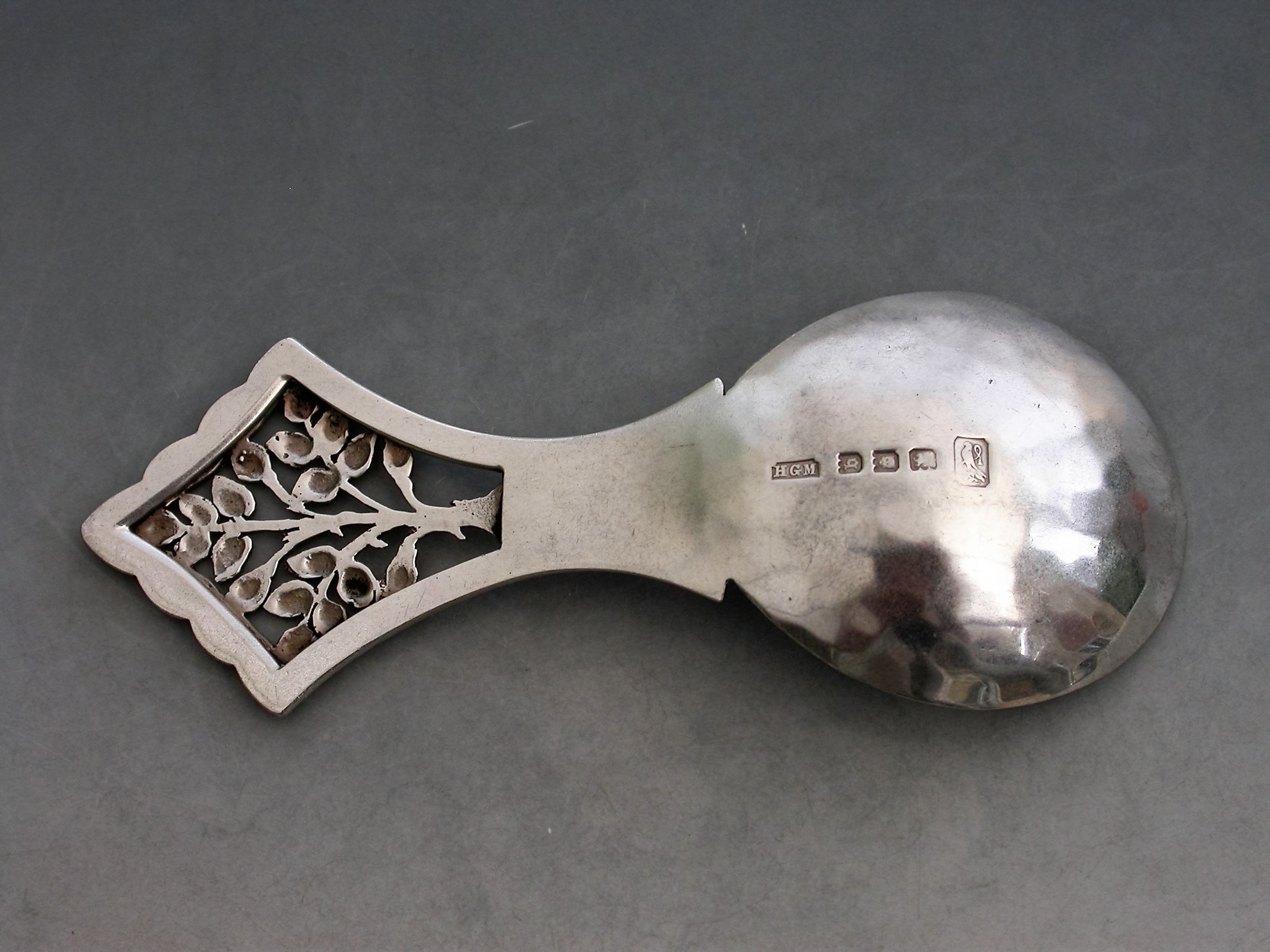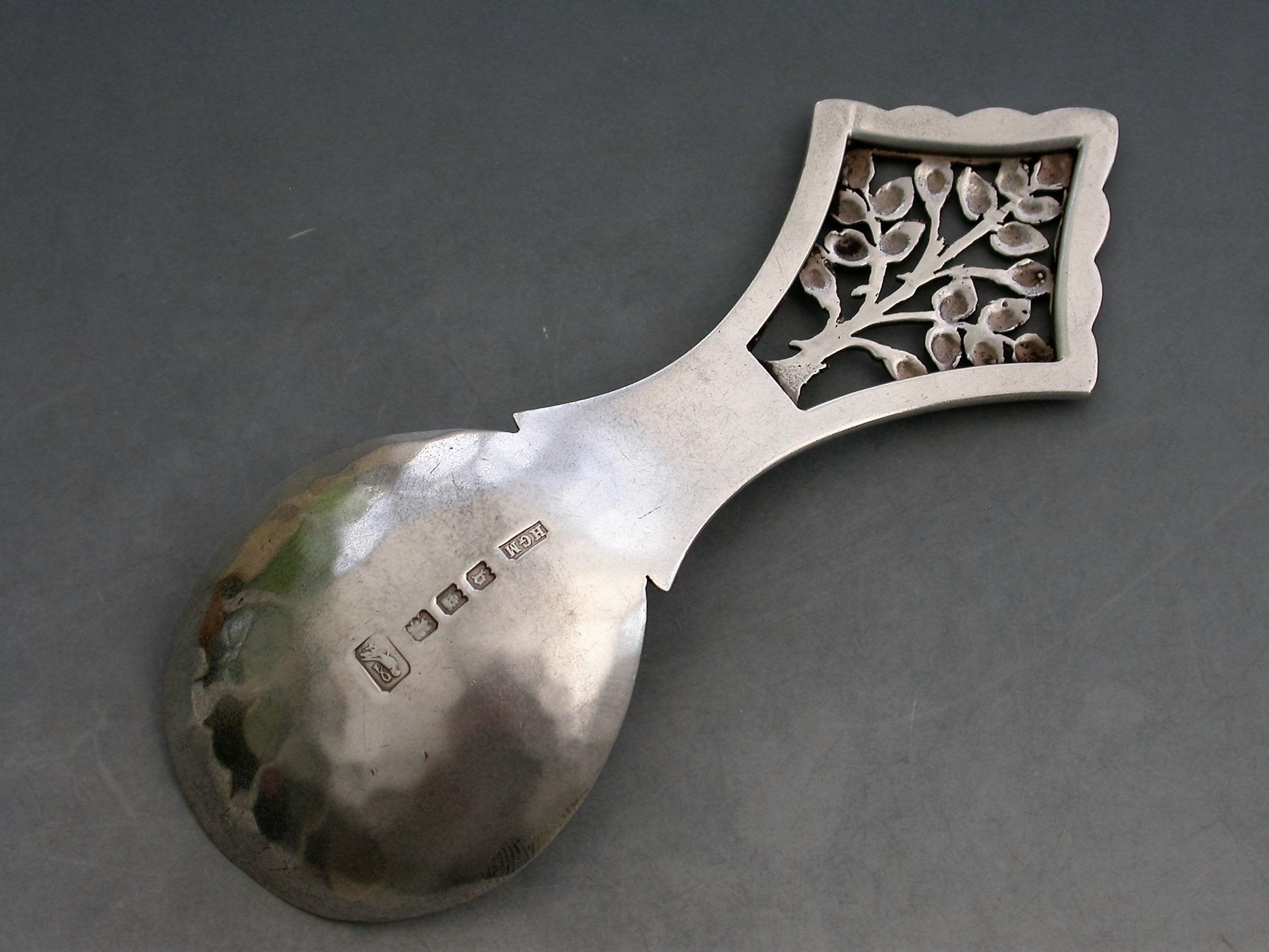 A rare early 20th century silver Caddy Spoon in the Arts & Crafts style with hammered oval bowl, the pierced diamond shaped handle depicting the “Tree of Life”.