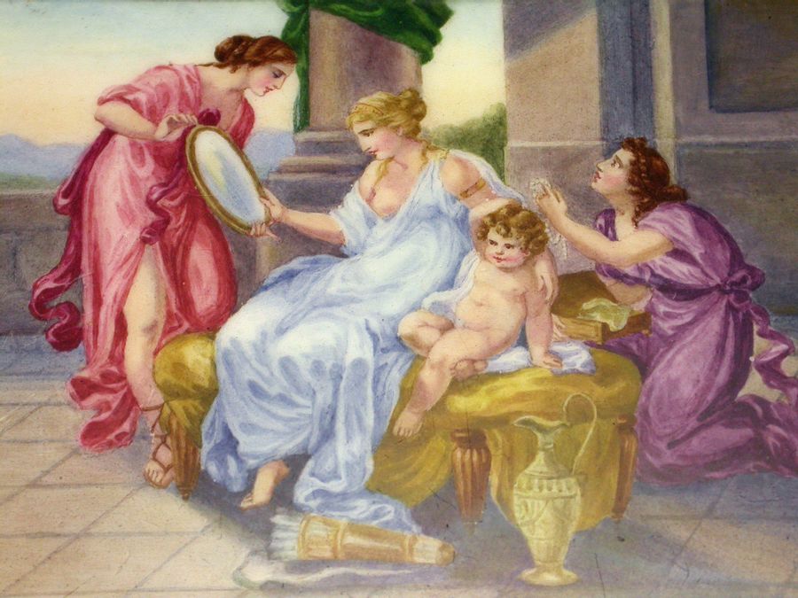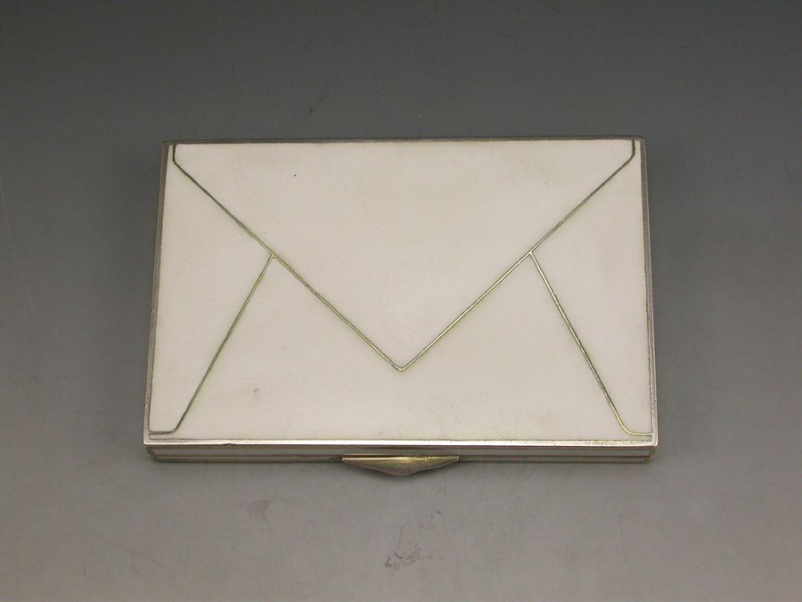 A very fine early 20th century Austrian silver and enamel Cigarette Case made in the form of an envelope with white enamel base and sides, the lid decorated with a classical scene depicting a lady with attendants and a baby, silver gilt interior.