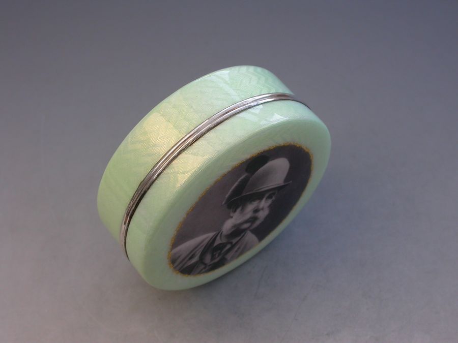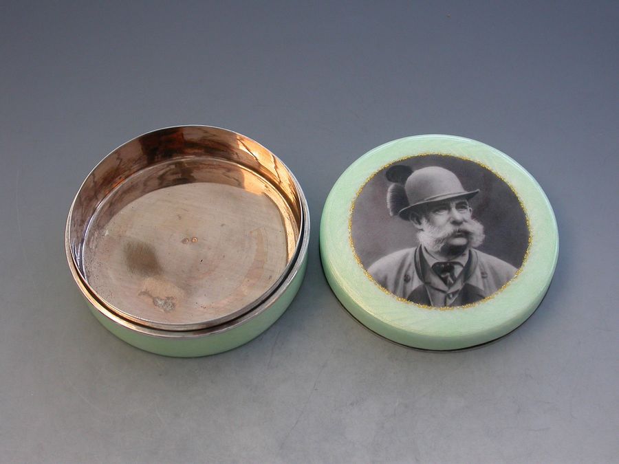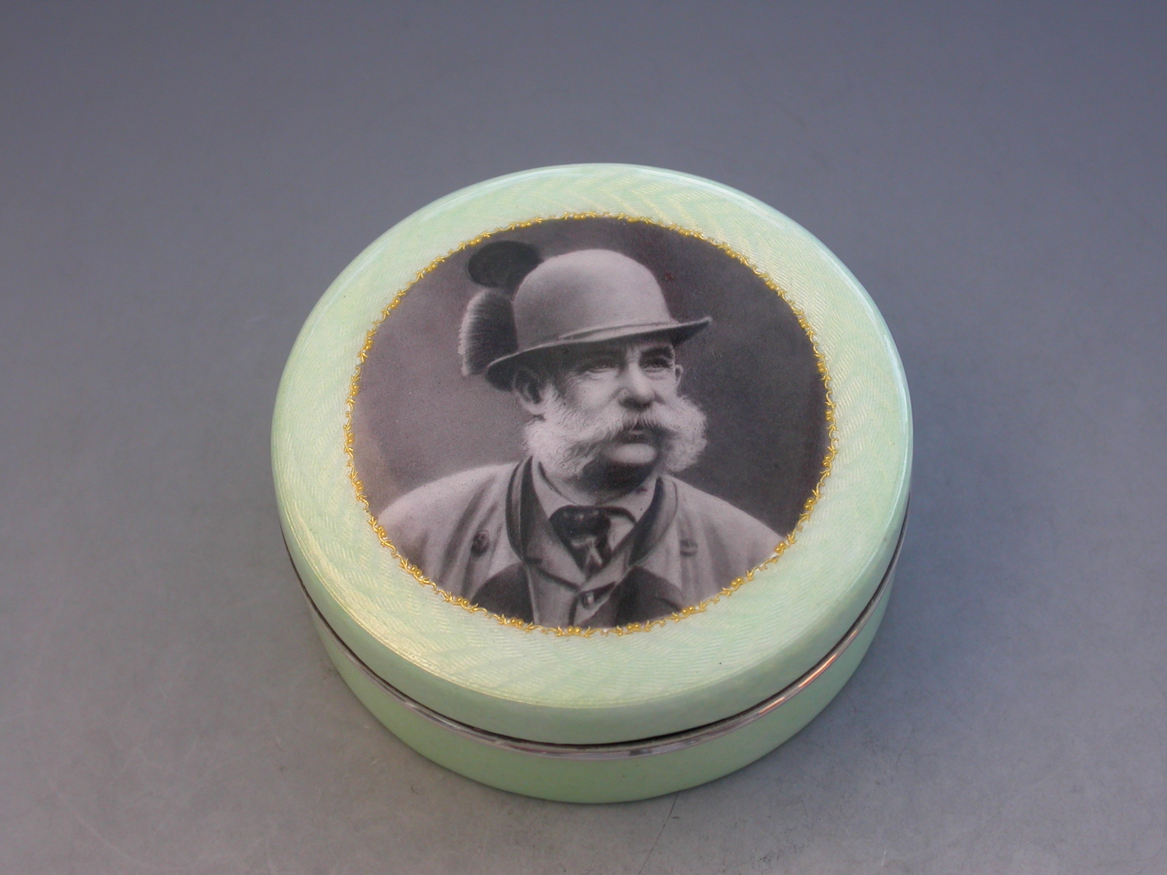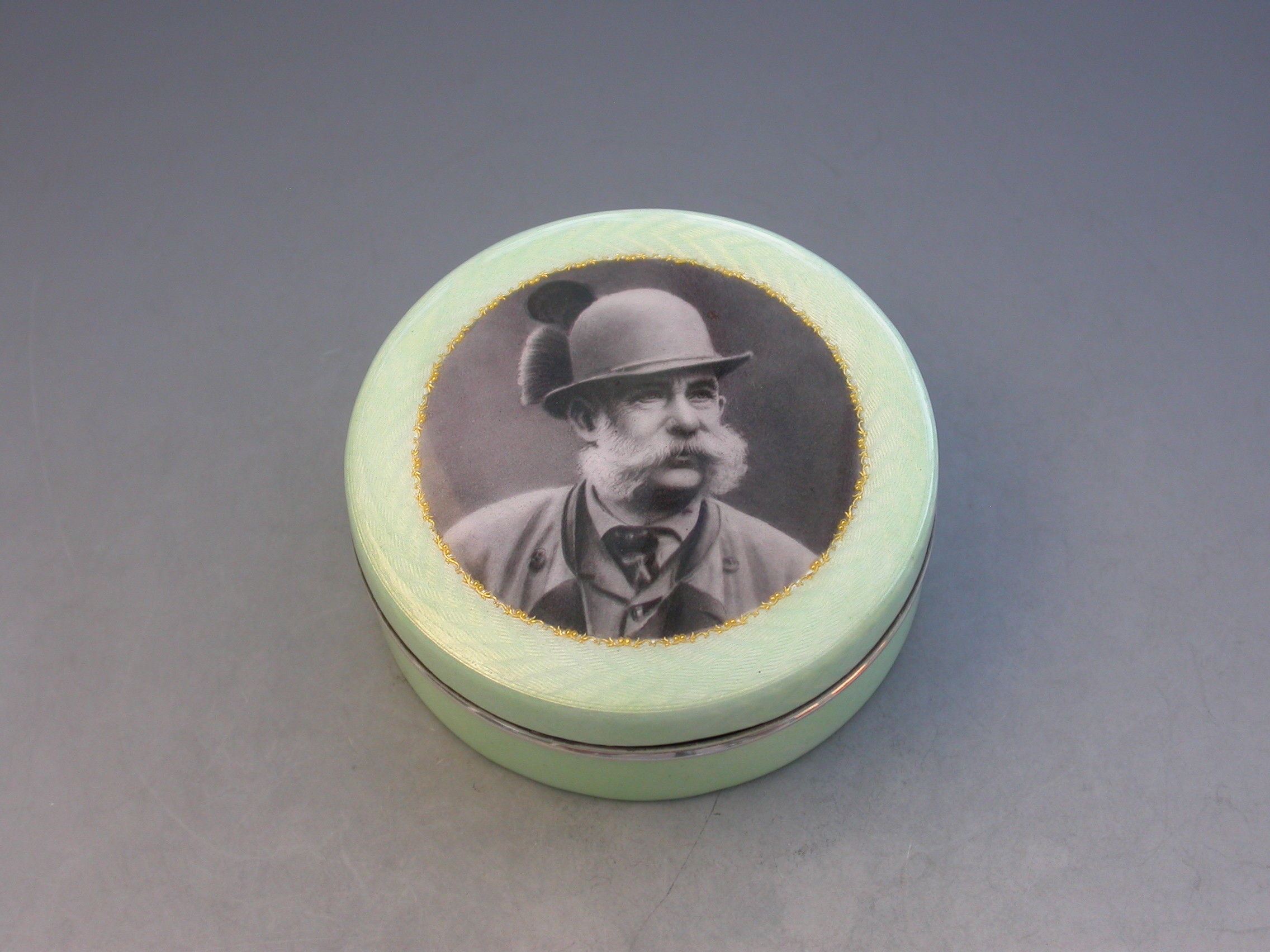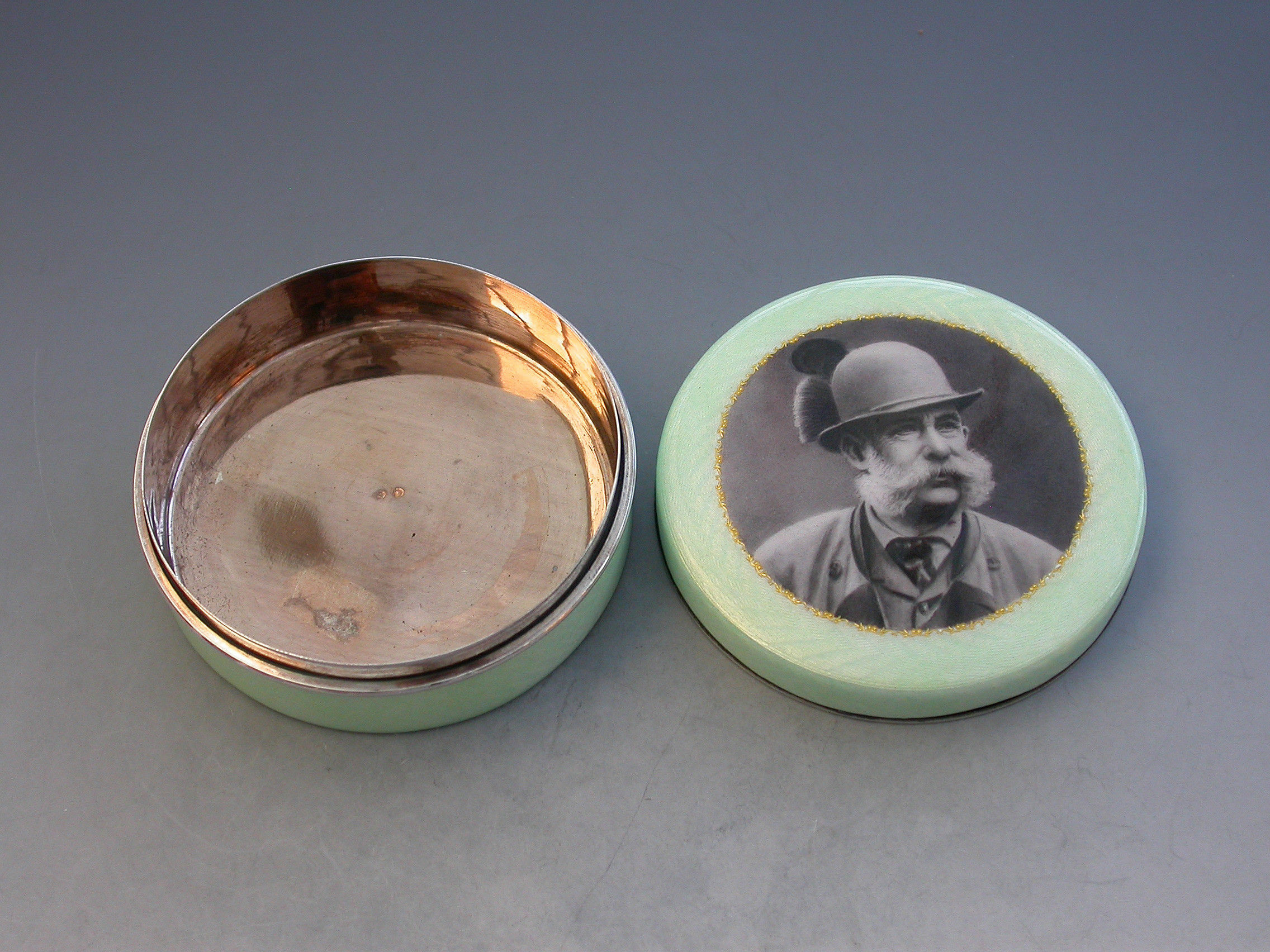 A fine quality early 20th century silver and mint green guilloche enamel circular box, the lid decorated with a monochrome enamel image of The Emperor Franz Joseph of Austria. Silver gilt interior.
