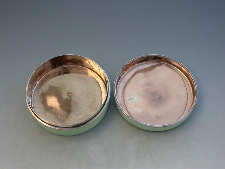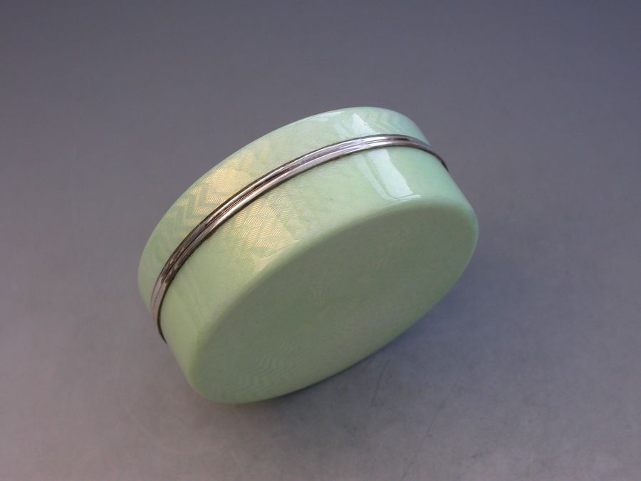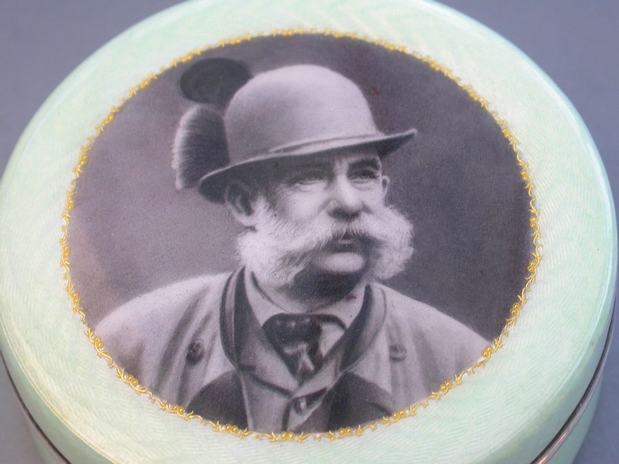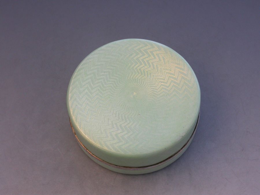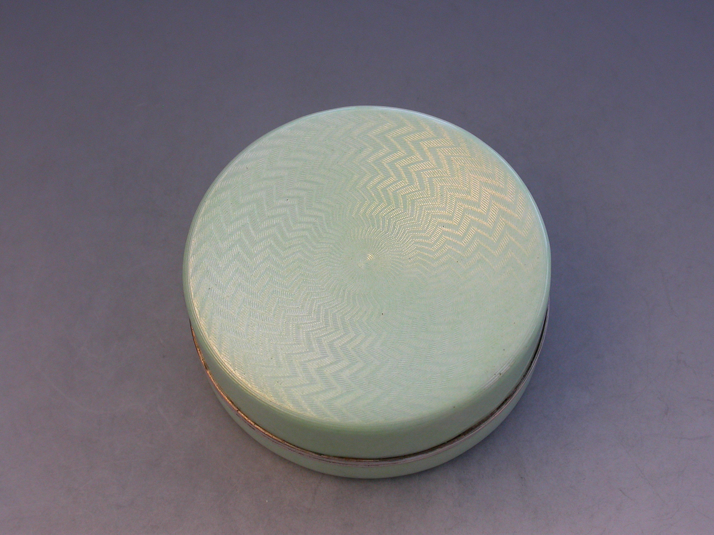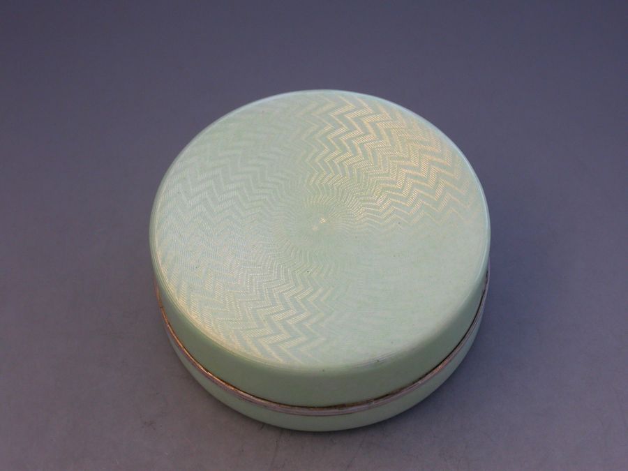 A fine quality early 20th century silver and mint green guilloche enamel circular box, the lid decorated with a monochrome enamel image of The Emperor Franz Joseph of Austria. Silver gilt interior.