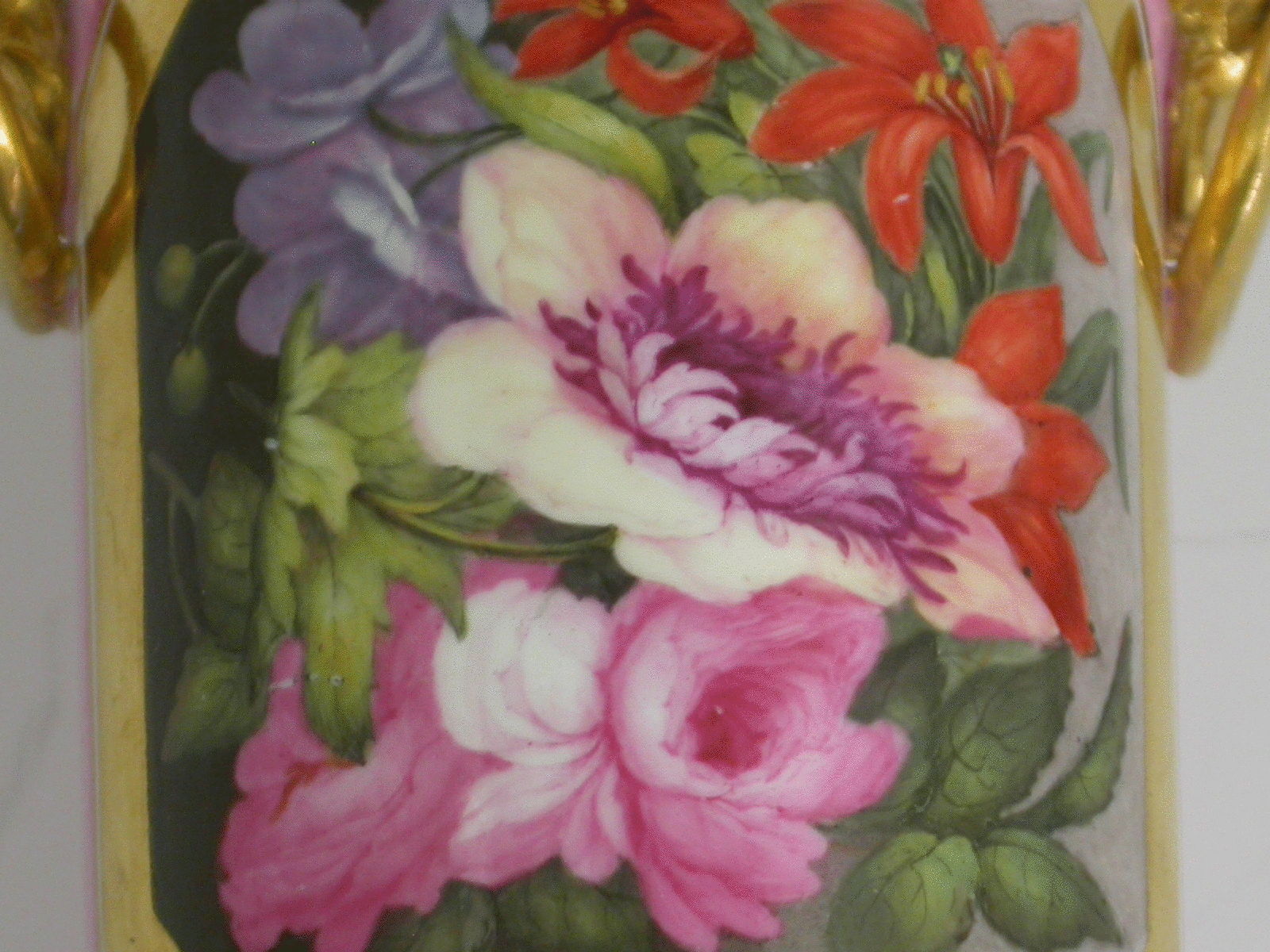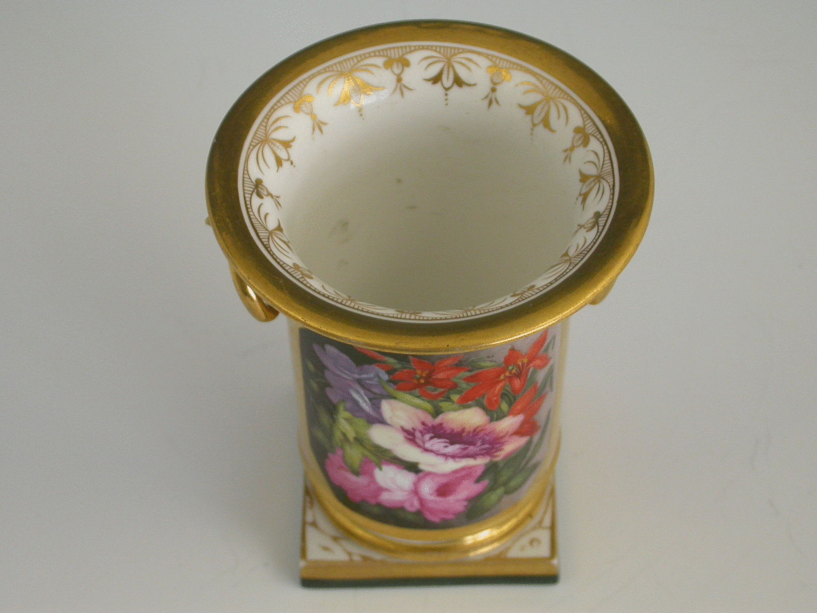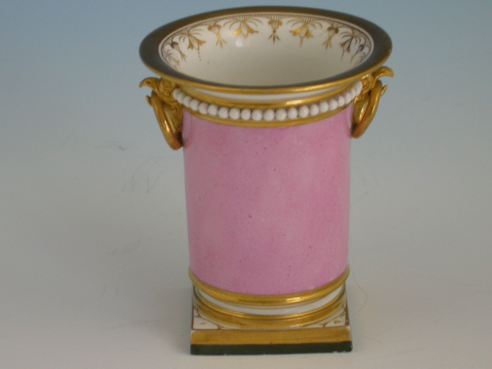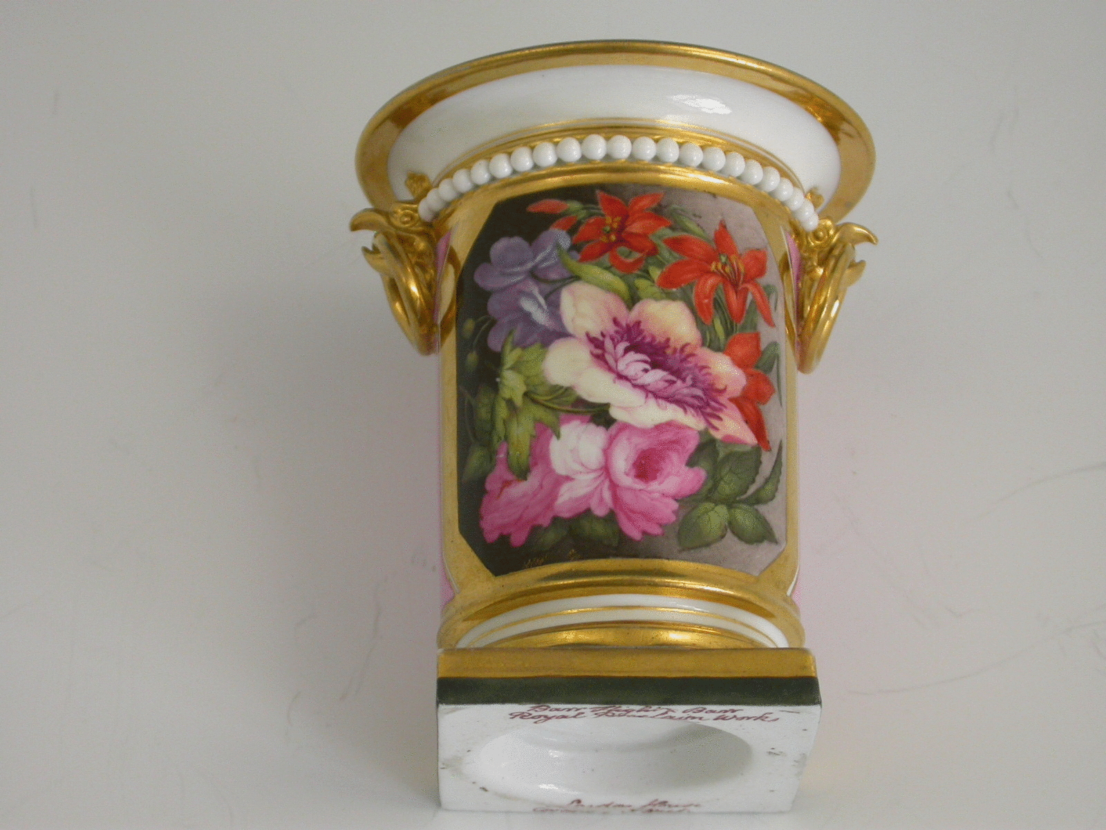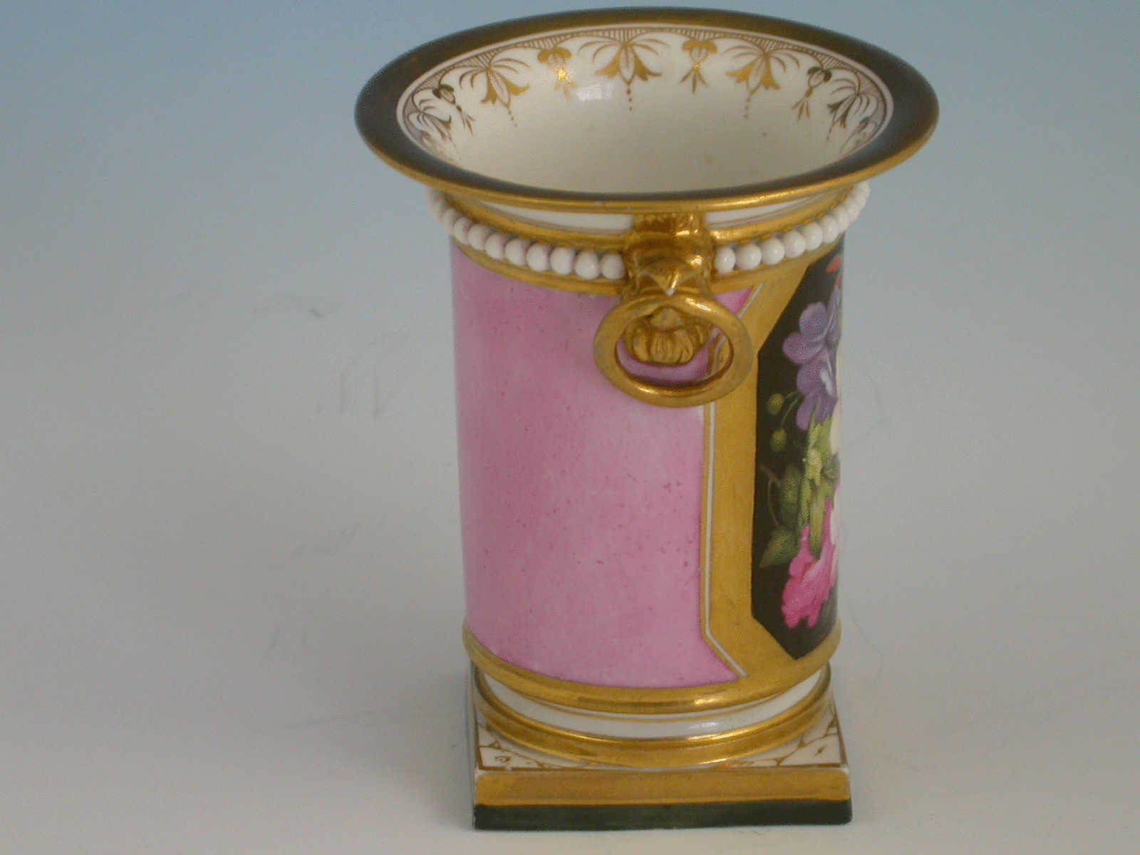 A fine Barr, Flight & Barr Worcester urn shaped Vase on square pedestal base with gilt rims, with a finely painted floral reserve possibly by Samuel Smith, on a pink ground.