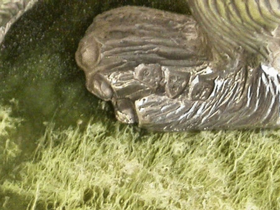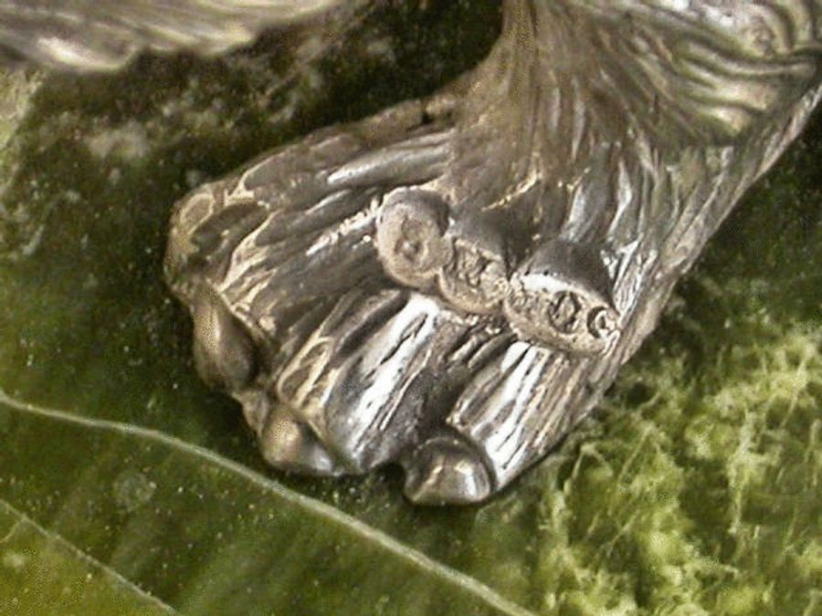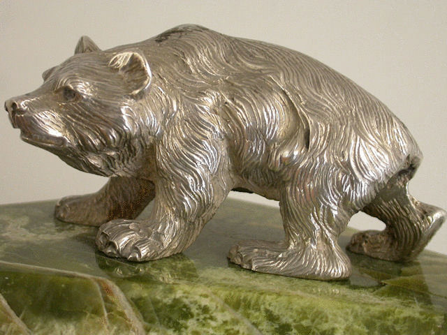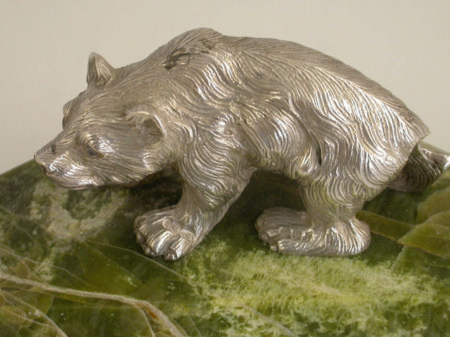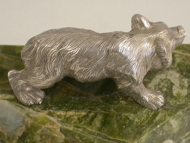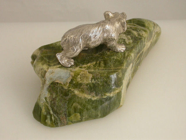 A very fine quality Edwardian cast silver model of a Bear standing on a shaped green Connemara marble base. Realistically modelled and well defined.