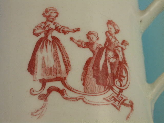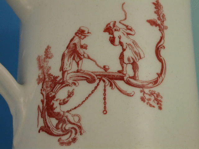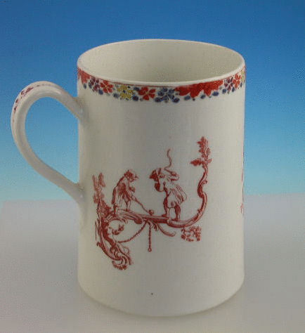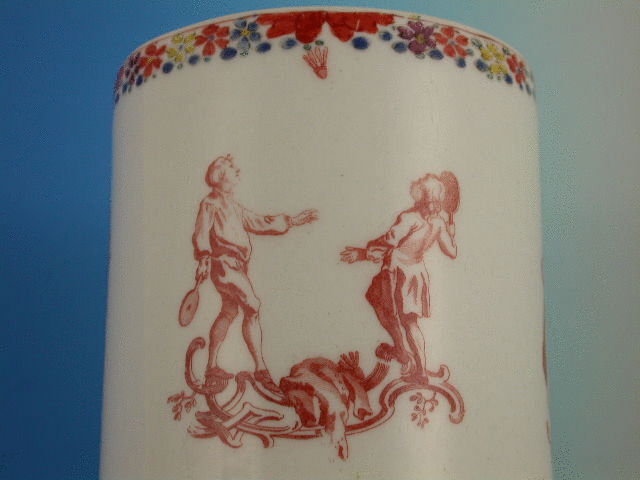 An extremely rare Bow cylindrical Mug with grooved strap handle, printed in iron red with Childrens Games including Blind Mans Buff, Battledore and Shuttlecock and Whip Top, after Gravelot, within a painted border consisting of a garland of flowers.