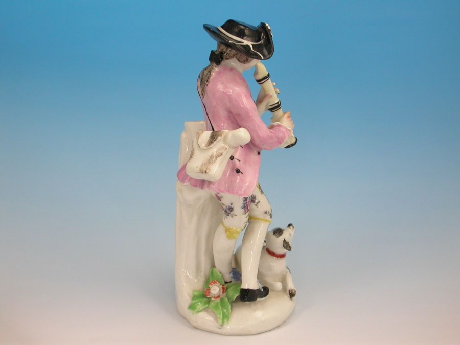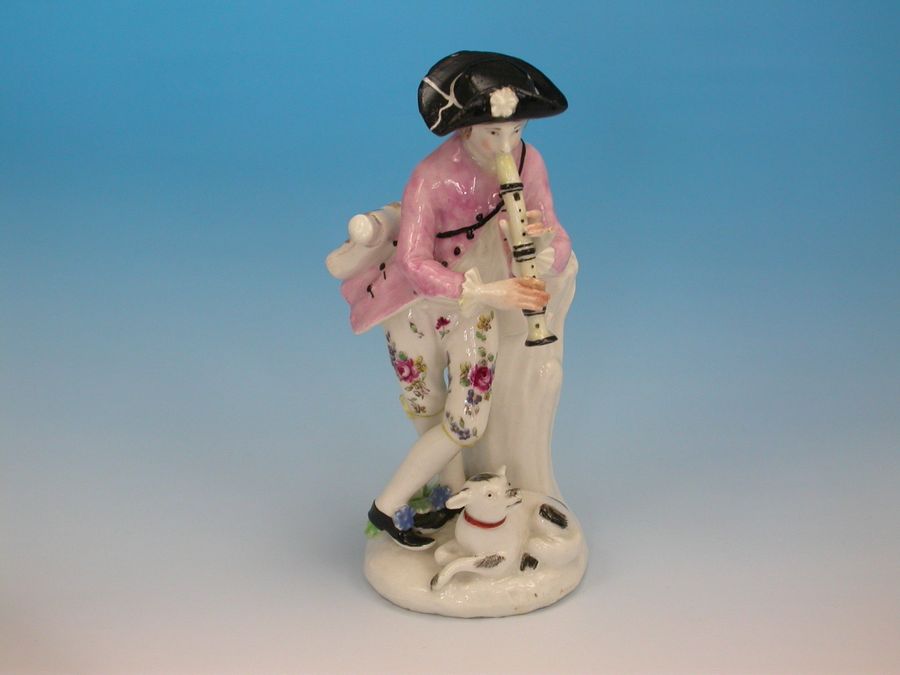 A fine Bow figure of a Shepherd Piper depicting a young Shepherd Boy standing on a scroll moulded base, playing a pipe with a lamb by his side.