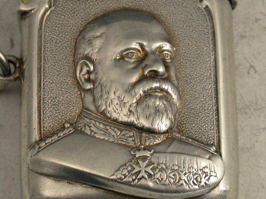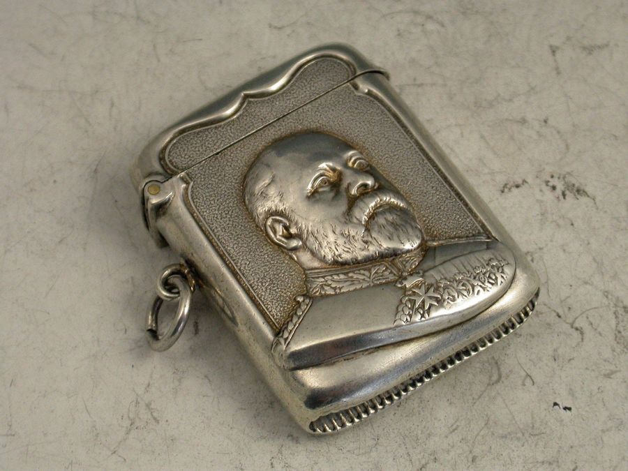 A good quality Edwardian silver Vesta Case, the cover with raised chased and engraved bust depicting King Edward VII, on a matt background. hinged flip top lid and gilt interior. Produced to coincide with his accession to the throne on 22nd January 1901.