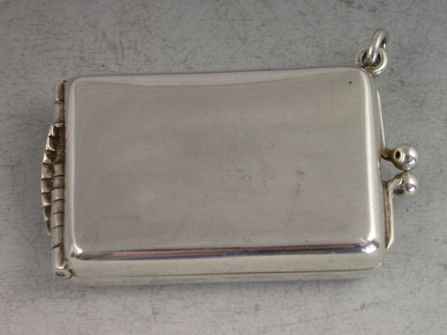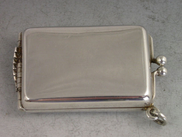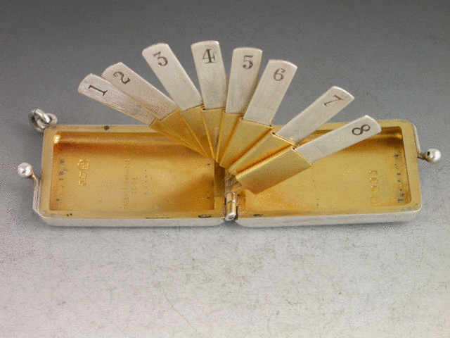 An early 20th century silver Butt Marker of plain rounded rectangular form with twin clasp closure and attached suspension ring, silver gilt interior, the ingenious multi-barrelled hinge opening to produce the 8 numbered steel pegs in a cascading fan pattern.