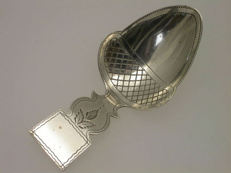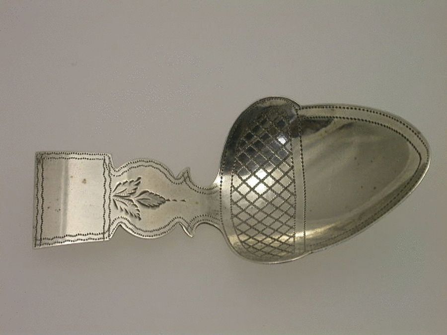 A very fine and rare George III silver Caddy Spoon, the bowl shaped and bright-cut engraved to simulate an acorn, the geometric handle also bright-cut engraved.