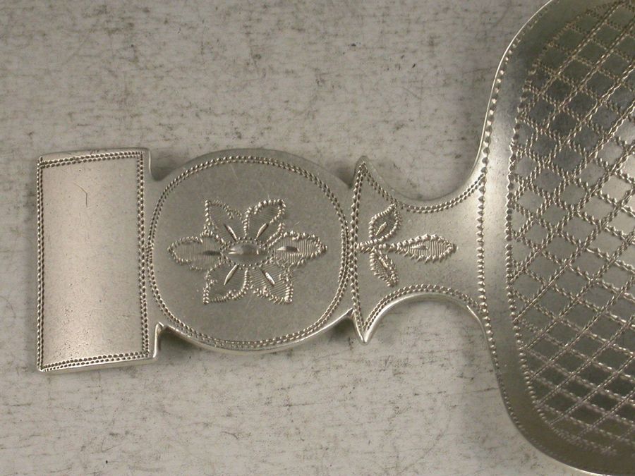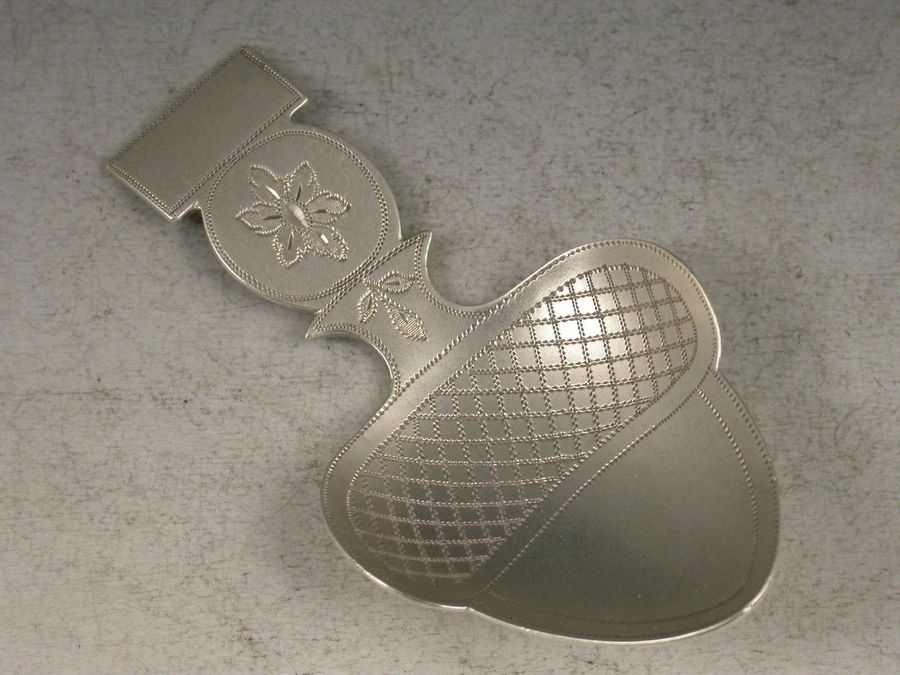 A very fine and rare George III silver Caddy Spoon, the bowl shaped and bright-cut engraved to simulate an acorn, the geometric handle also bright-cut engraved with a flower head.