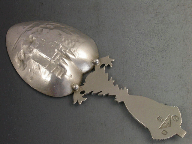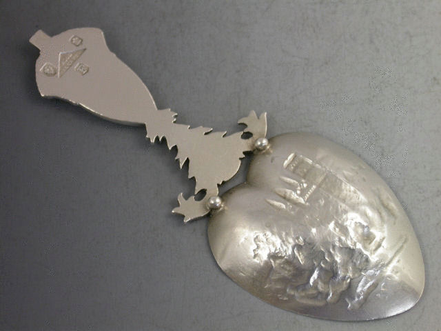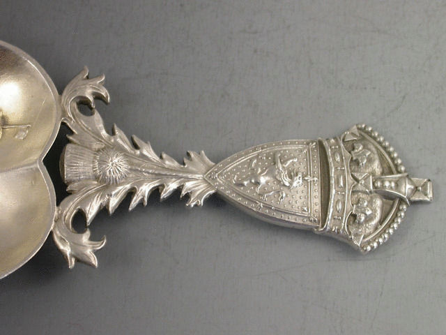 A rare early 20th century Scottish Provincial silver Caddy Spoon, the lightly gilded heart shaped bowl with chased and embossed view of BALMORAL CASTLE (the Royal Family’s Scottish home), the cast handle formed from the Scottish Thistle, the Lion rampant and the Union Crown.