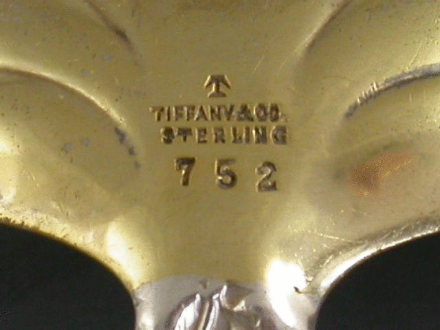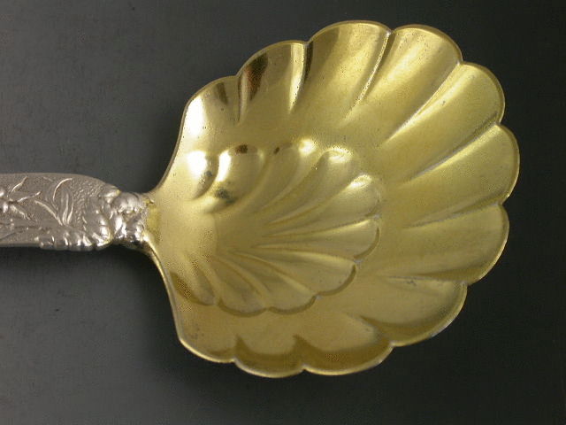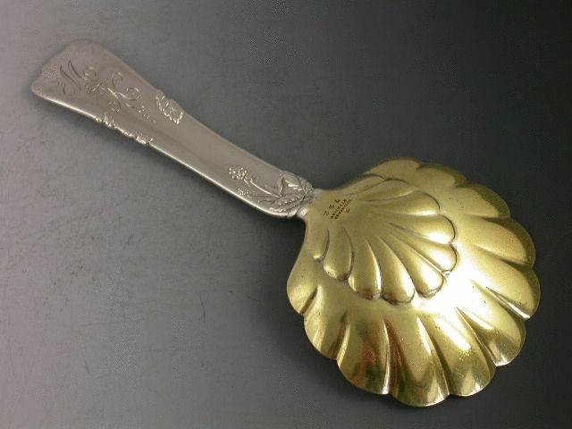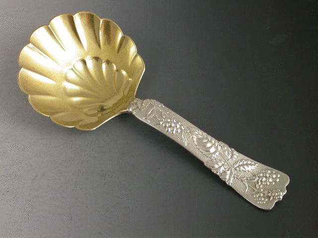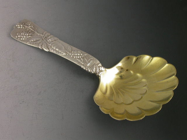 A good 19th century American silver Caddy or Bon Bon Spoon with gilded shell shaped bowl, the handle decorated with vine leaves and grapes on a matt back ground. Engraved with contemporary initials MK.