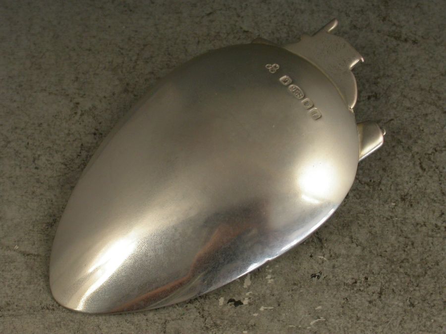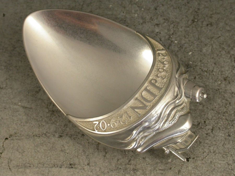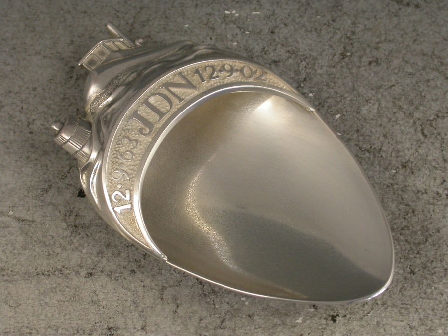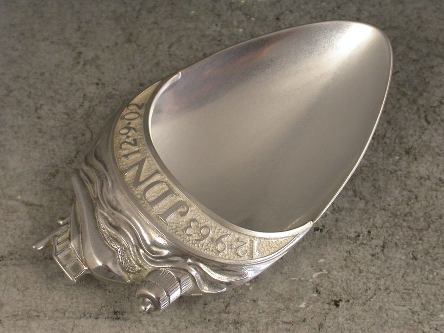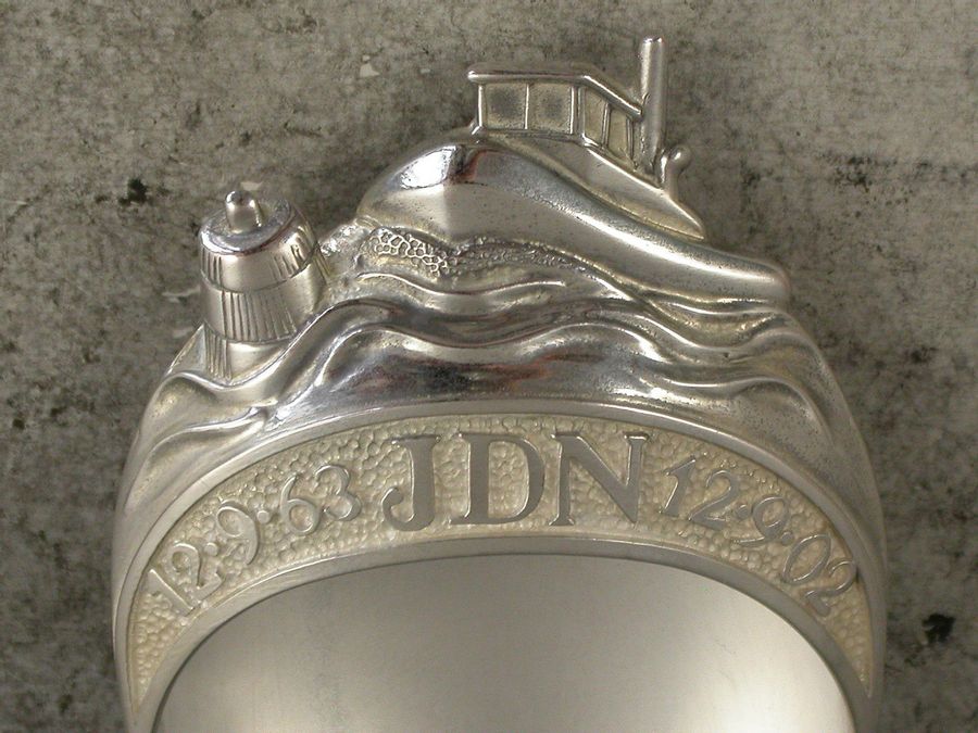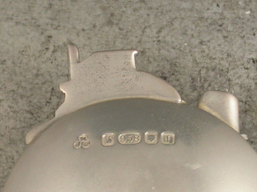 A fine quality contemporary Britannia Standard silver Caddy Spoon of tear drop or scoop shape, the handle depicting a tug approaching a bouy on a rolling sea, applied with the dates and initials : 12.9.63 JDN 12.9.02. Made to commemorate the late John D. Norie, founder member of the Society of Caddy Spoon Collectors. A limited edition of 48.