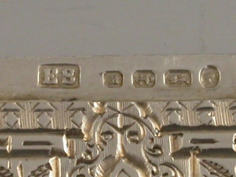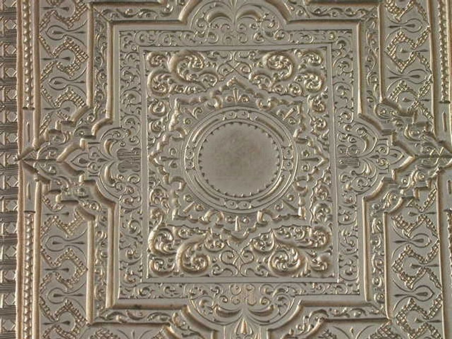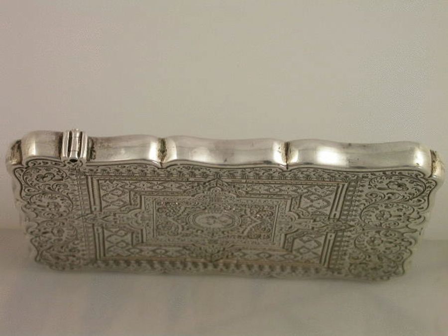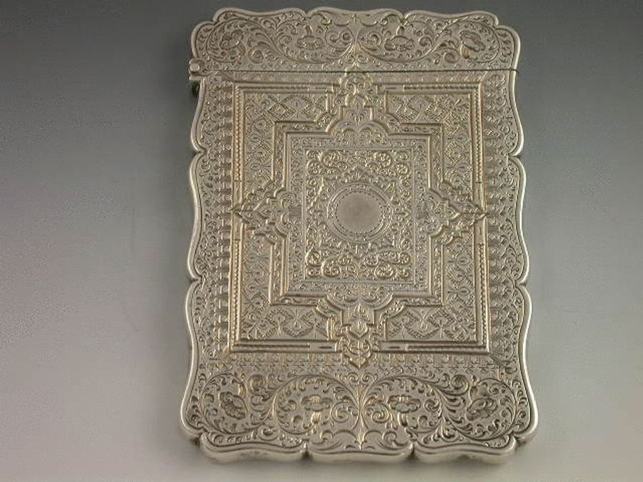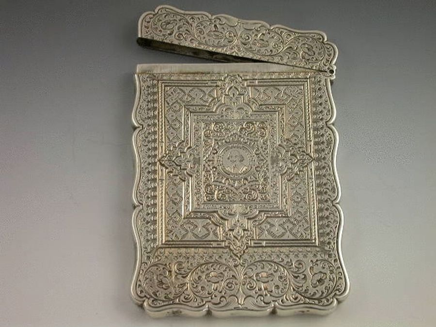 A good Victorian silver Card Case of shaped rectangular form, all over bright-cut engraved with geometric and foliate scroll patterns, a small central circular cartouche to the front engraved with a bust of William Shakespeare.