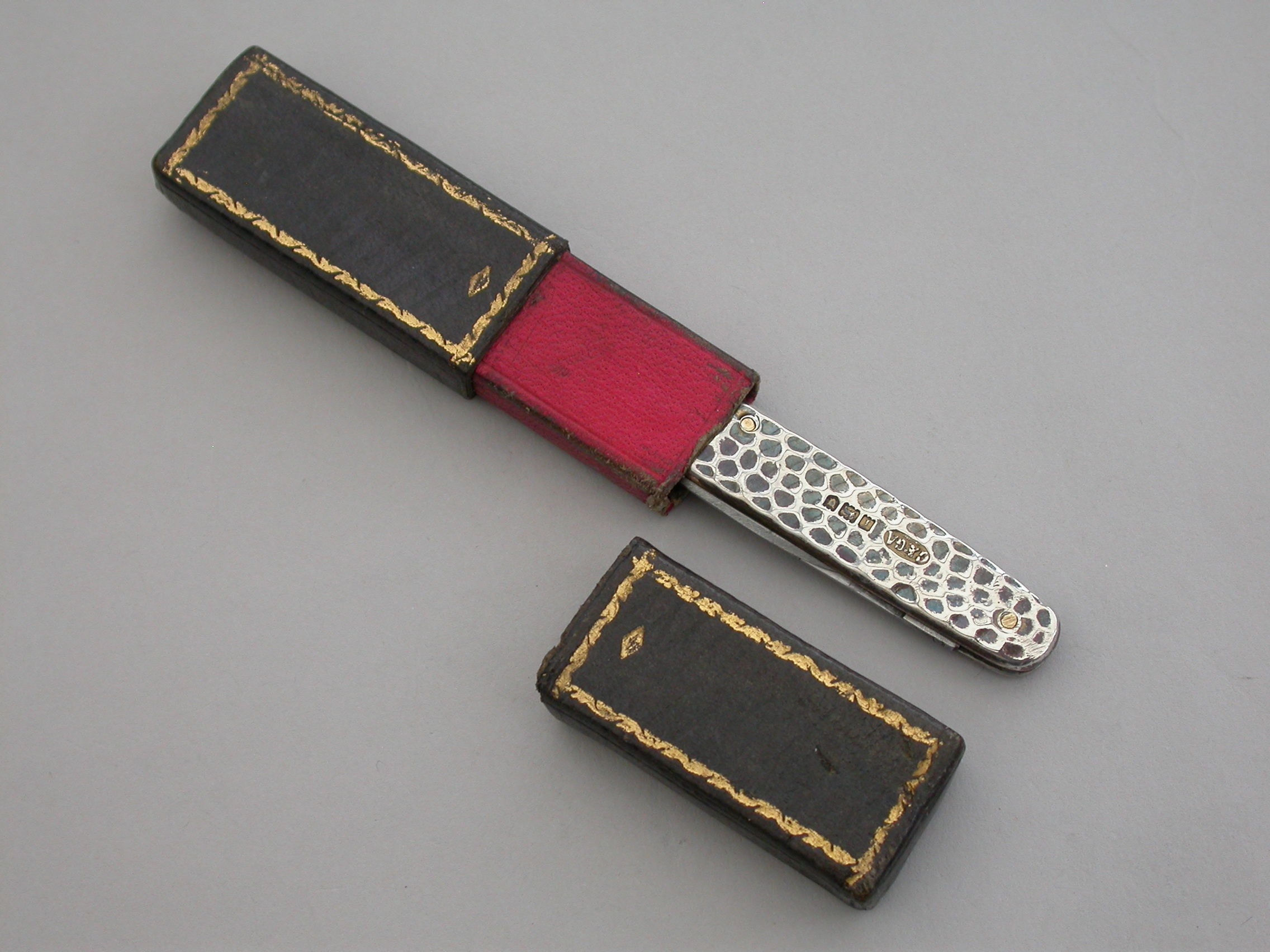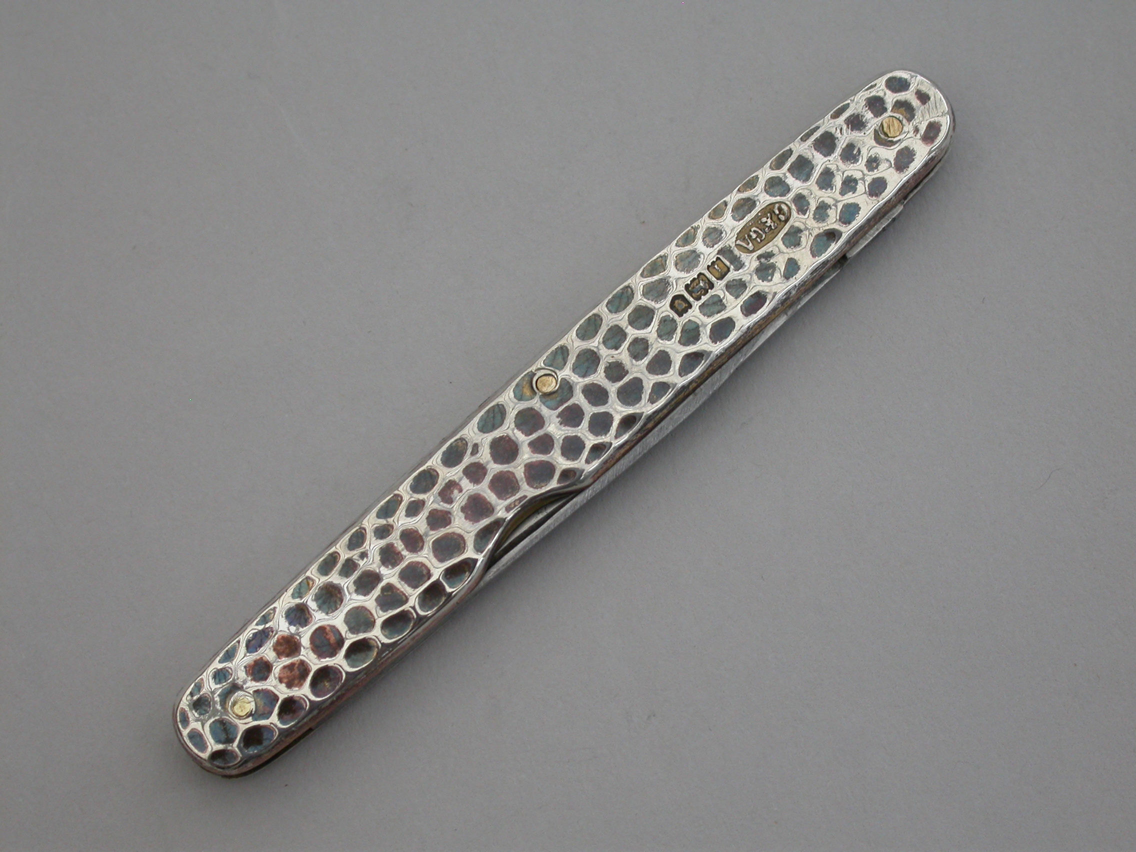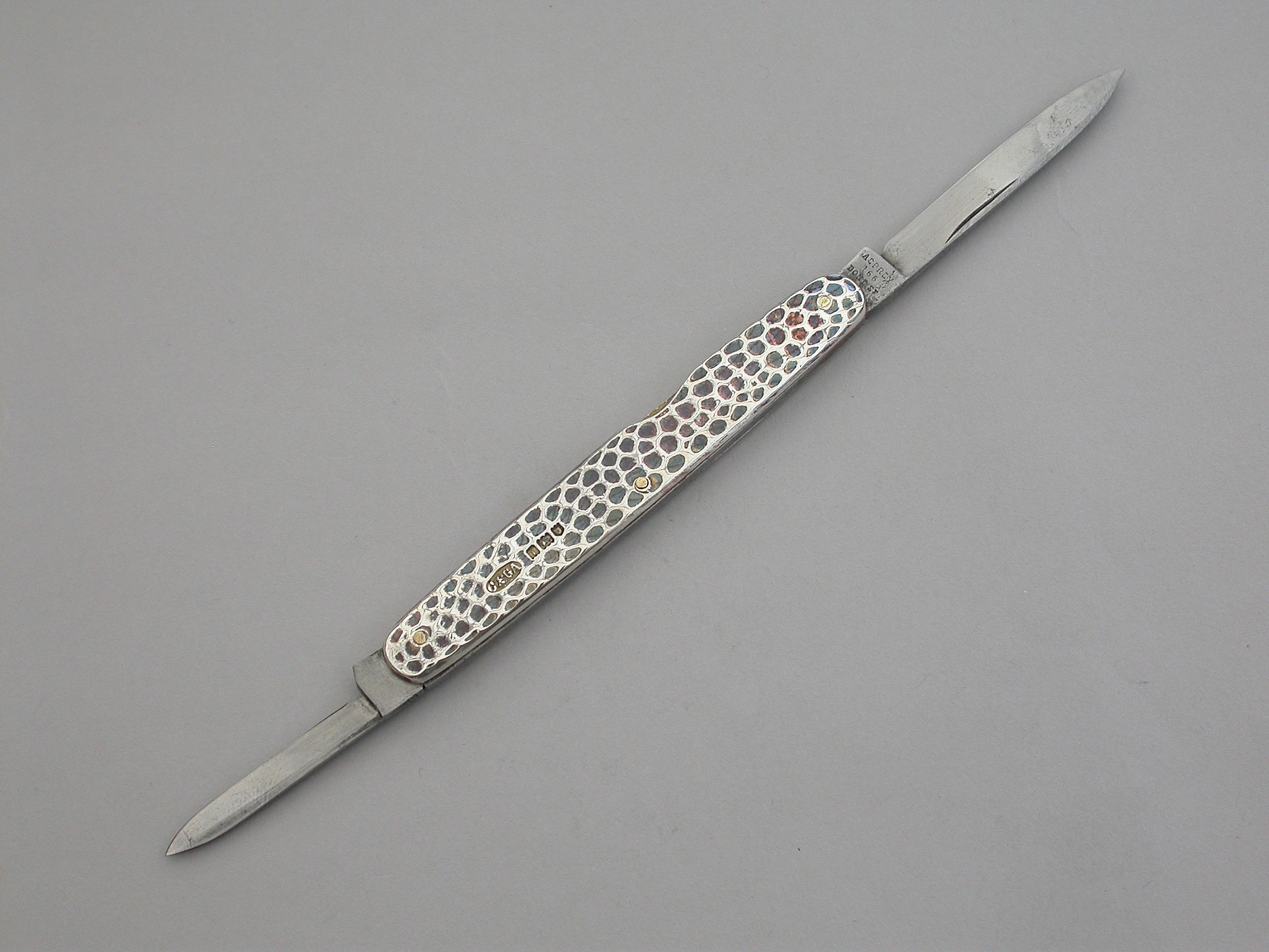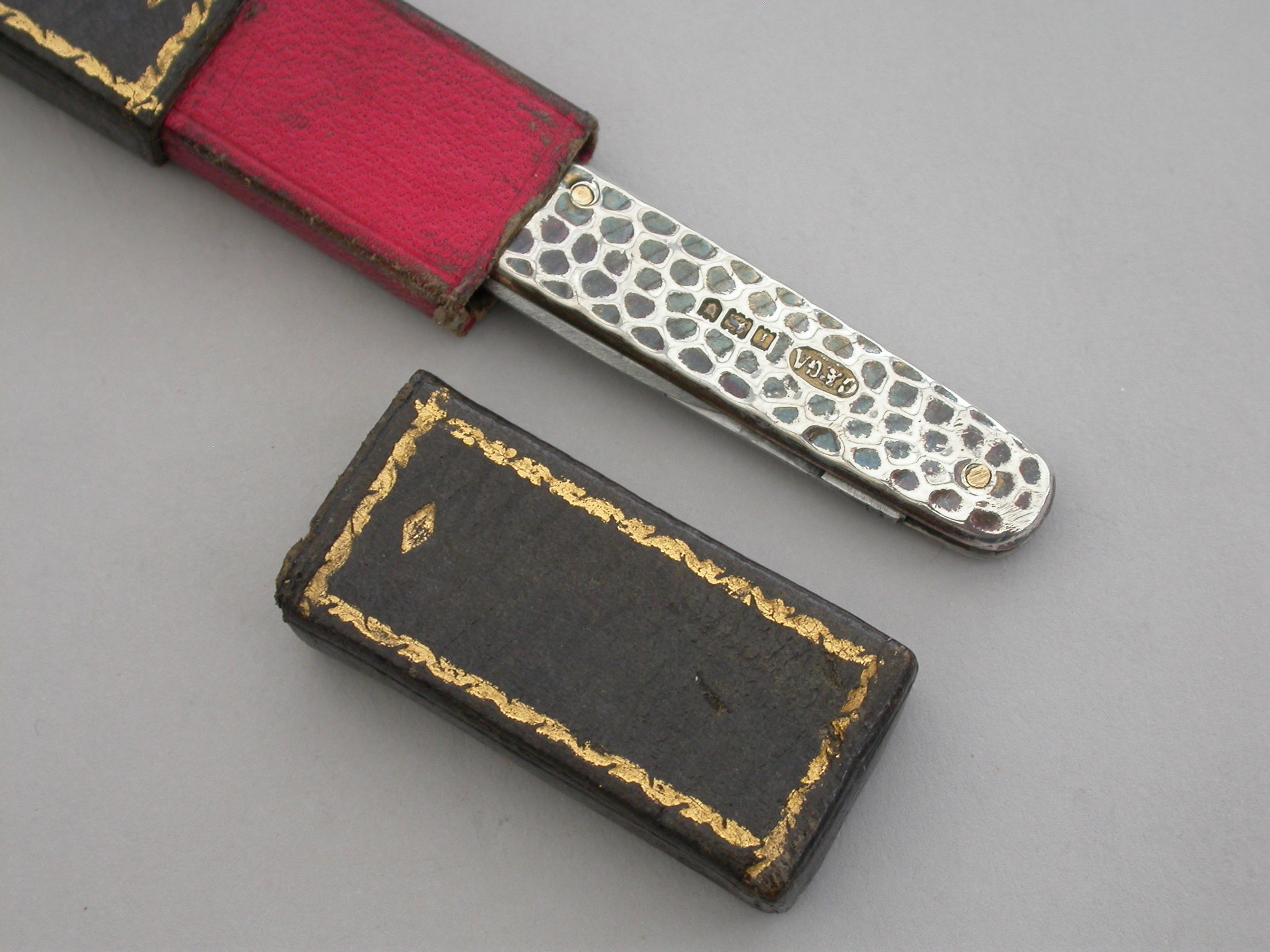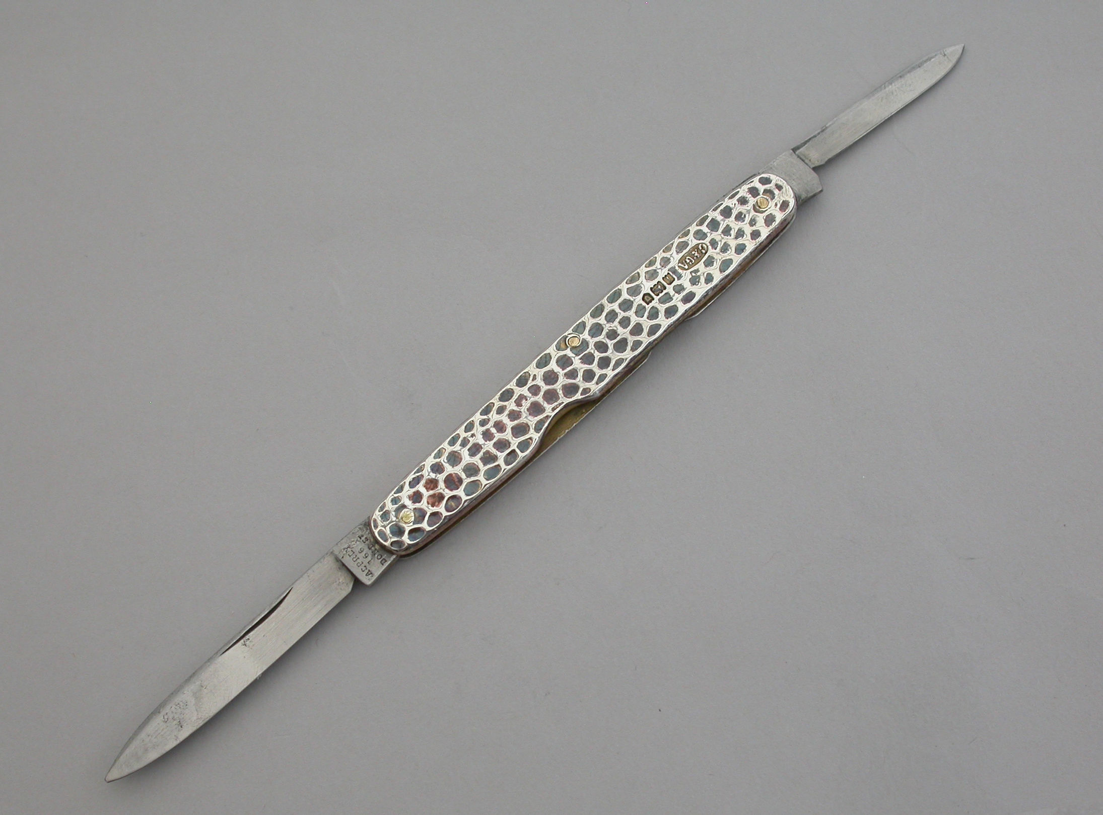 A good quality Edwardian silver Pen Knife with two folding steel blades, the silver side plates with spot hammered decoration filled with enamel. Complete with associated Morocco leather case.