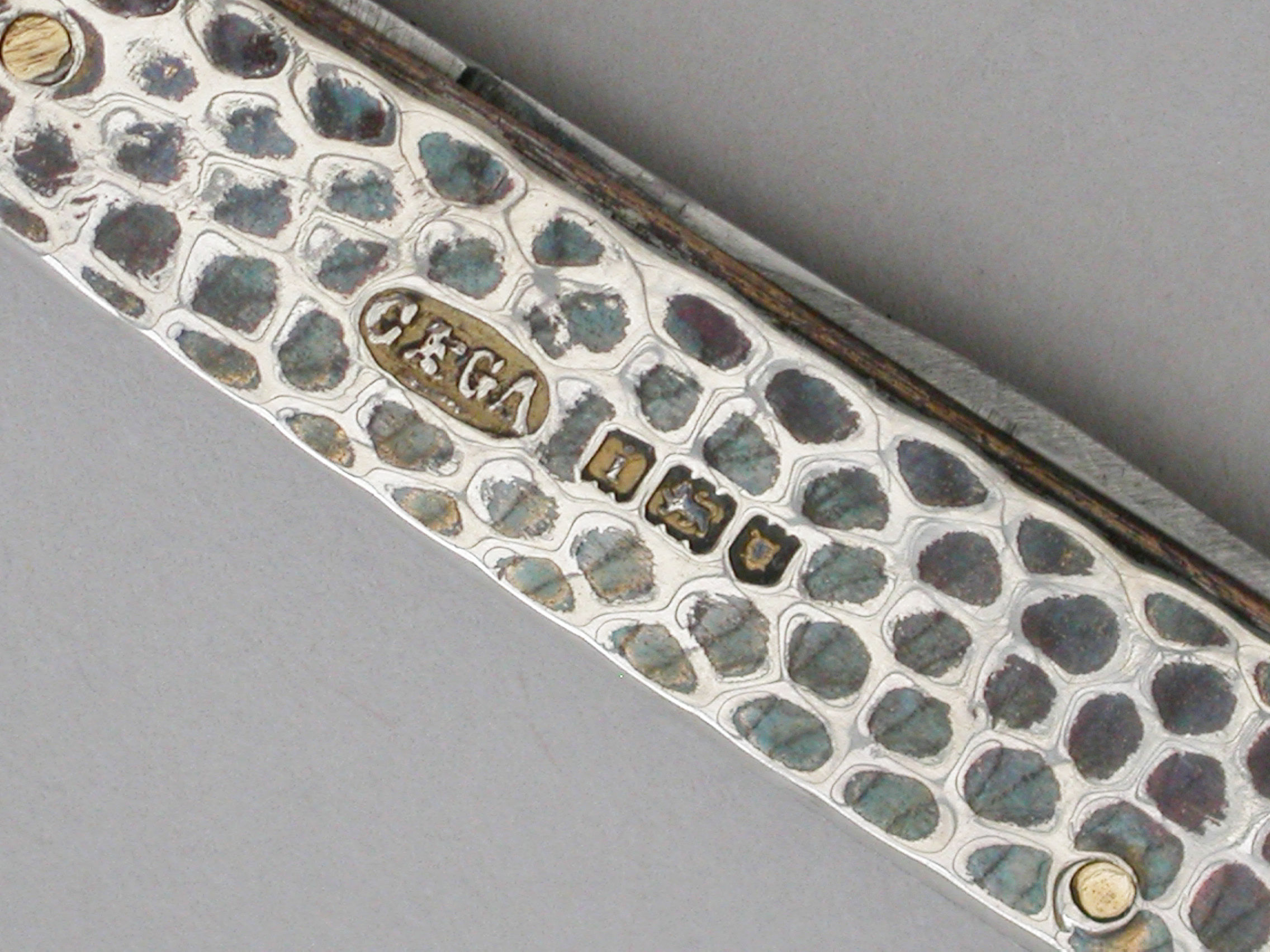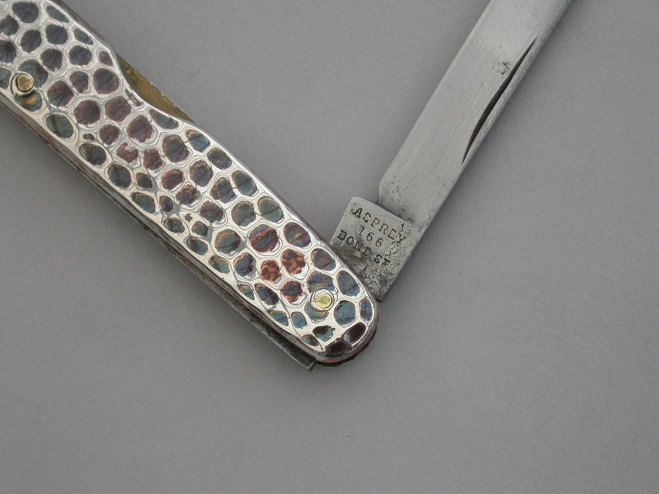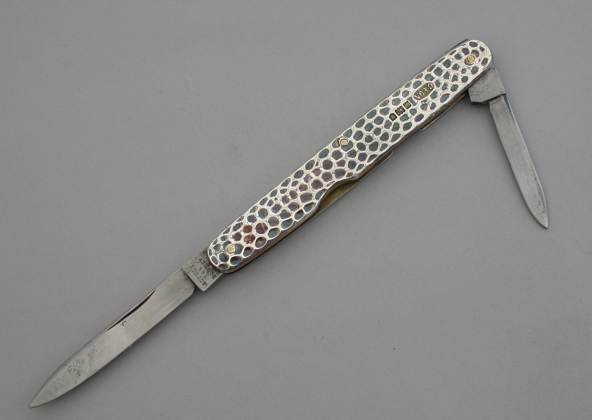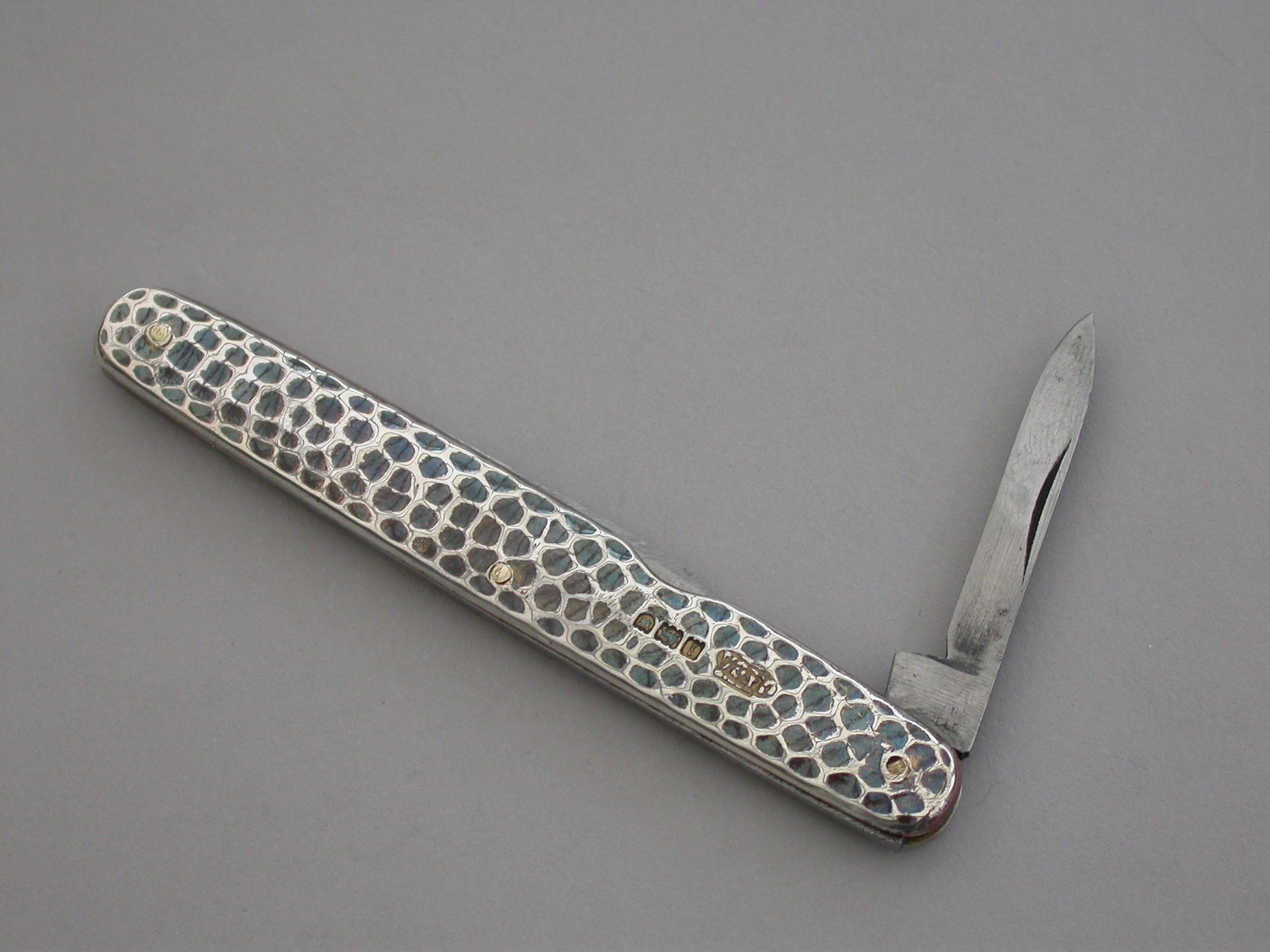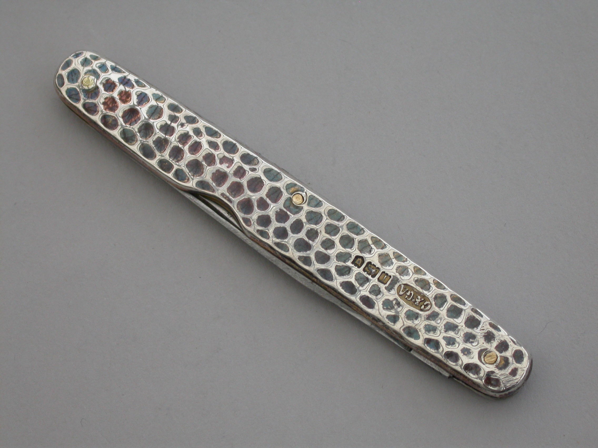 A good quality Edwardian silver Pen Knife with two folding steel blades, the silver side plates with spot hammered decoration filled with enamel. Complete with associated Morocco leather case.