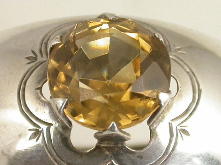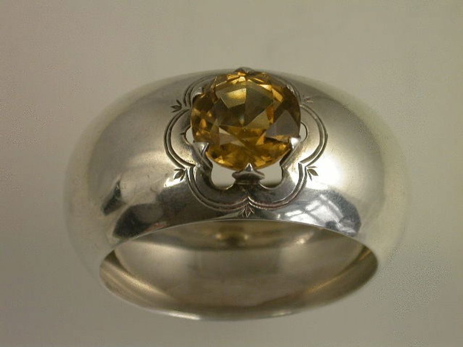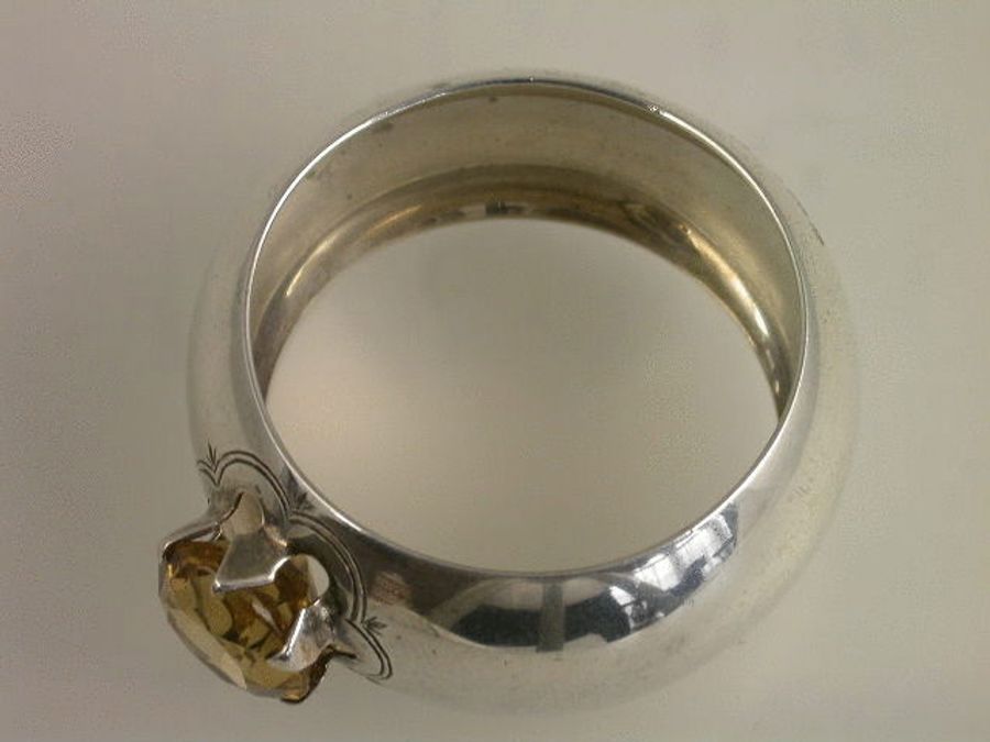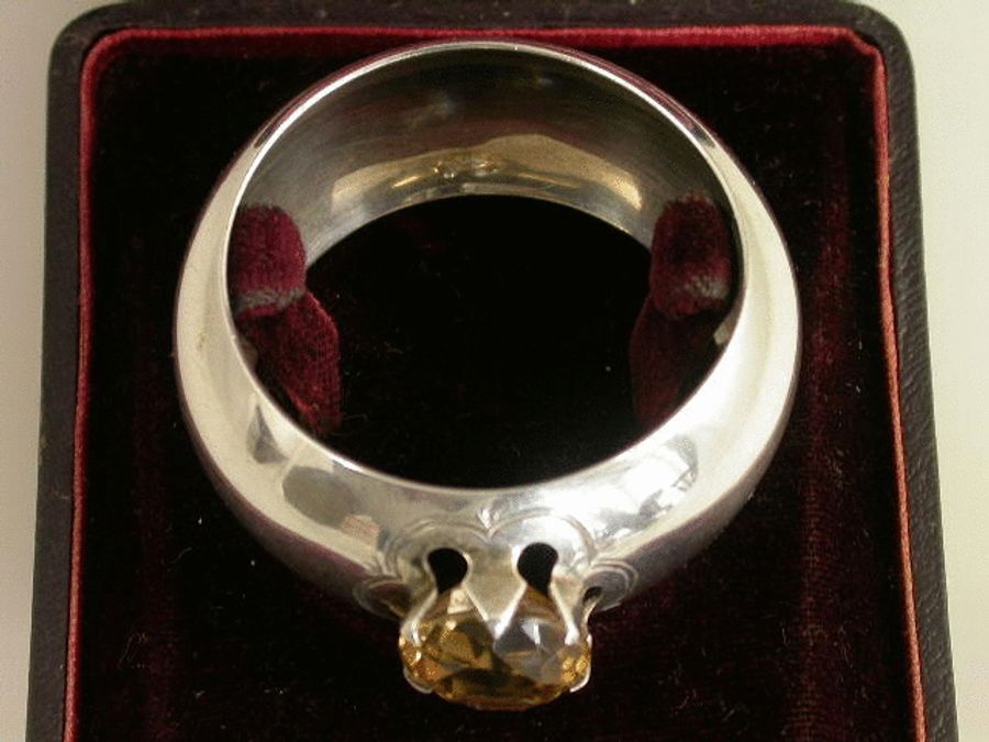 An Edwardian silver Napkin Ring of shaped circular form mounted with a large faceted Cairngorm or yellow citrine stone. Complete with original silk and velvet lined leather case.