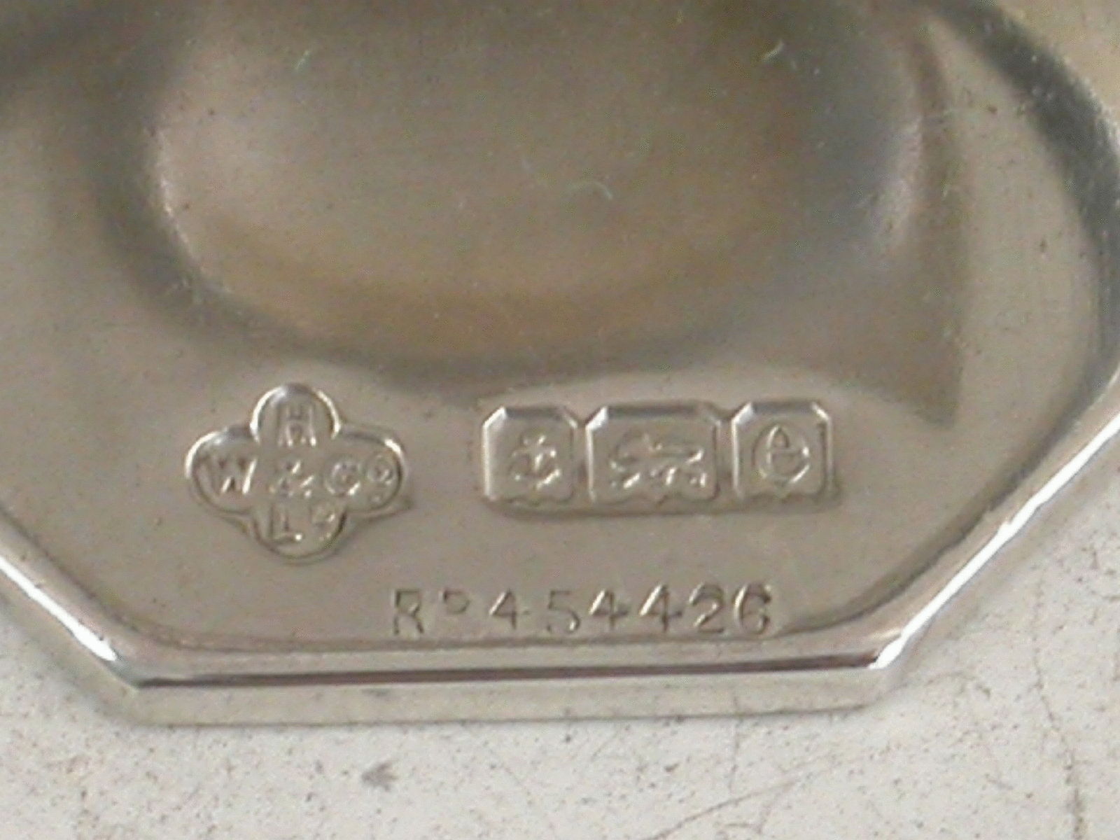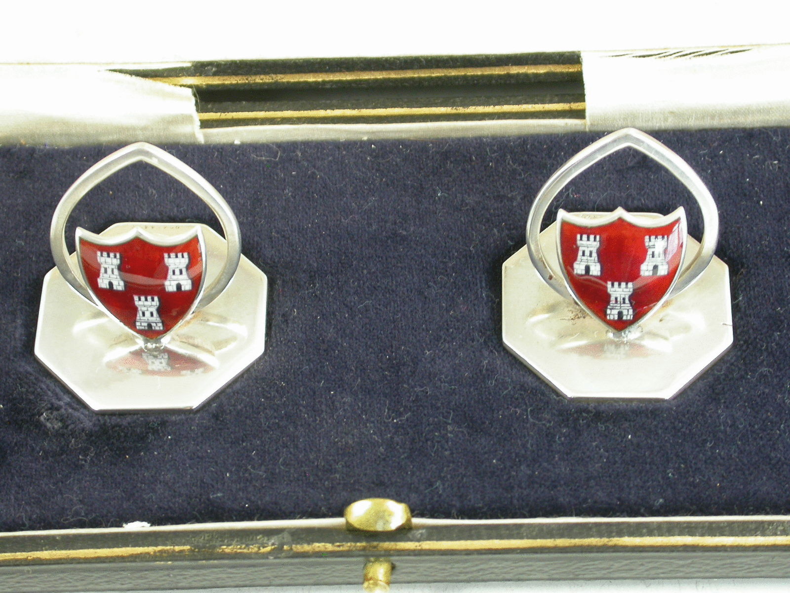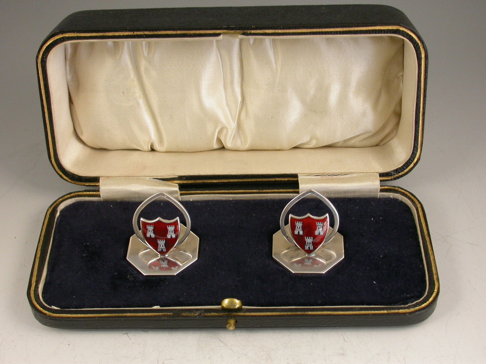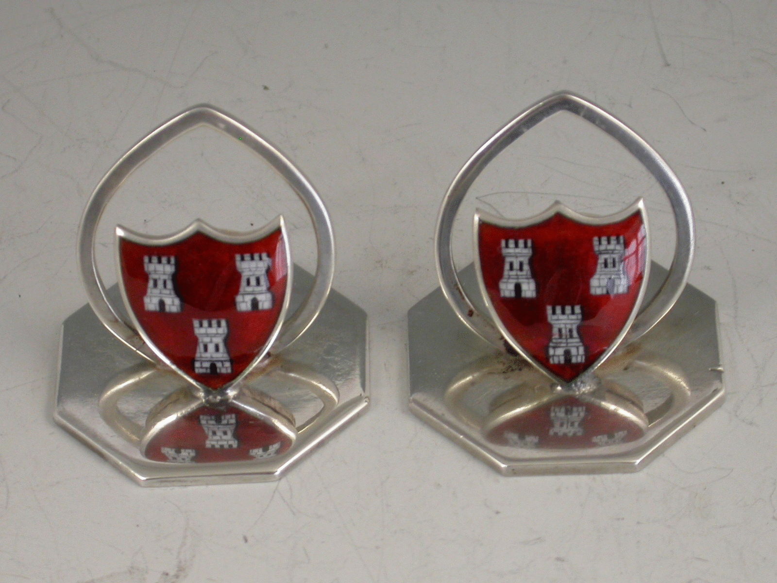 A good cased pair of Edwardian silver and enamel Menu Holders, the shield shaped plaques enamelled with the Newcastle City Arms: Gules three Castles triple towered Argent.