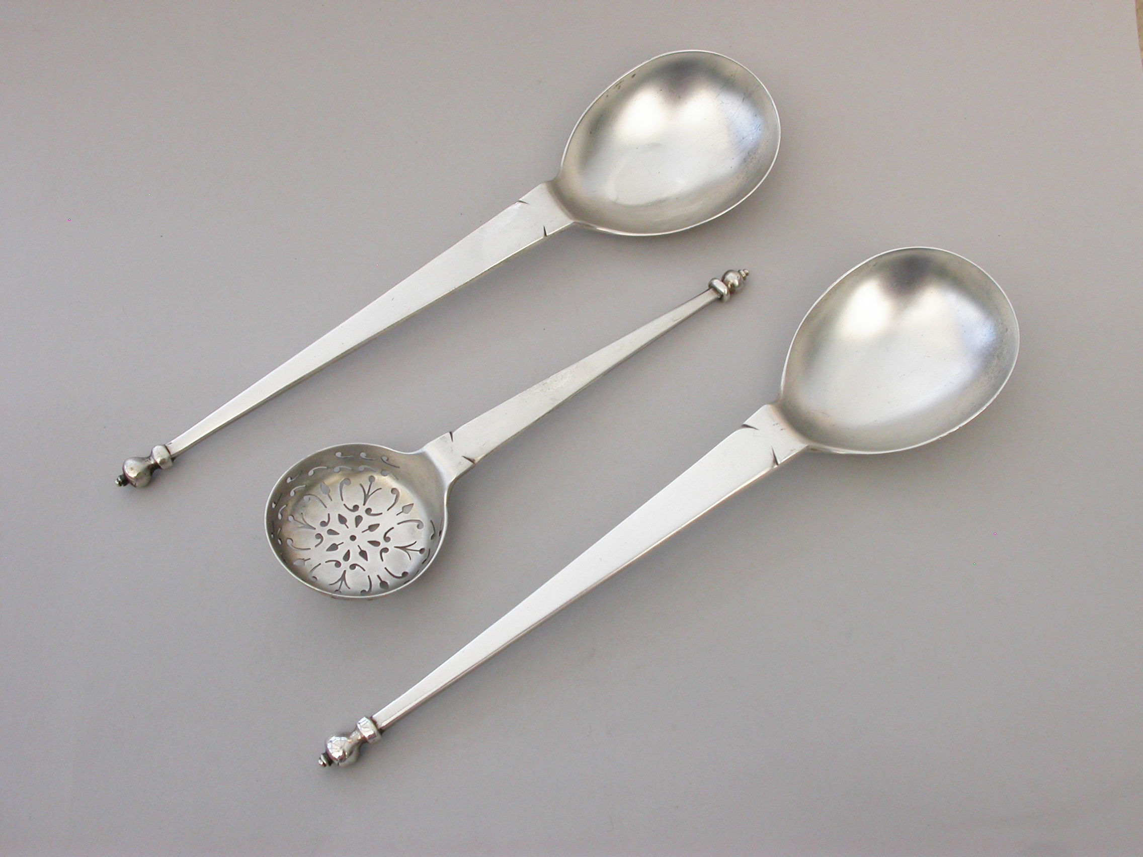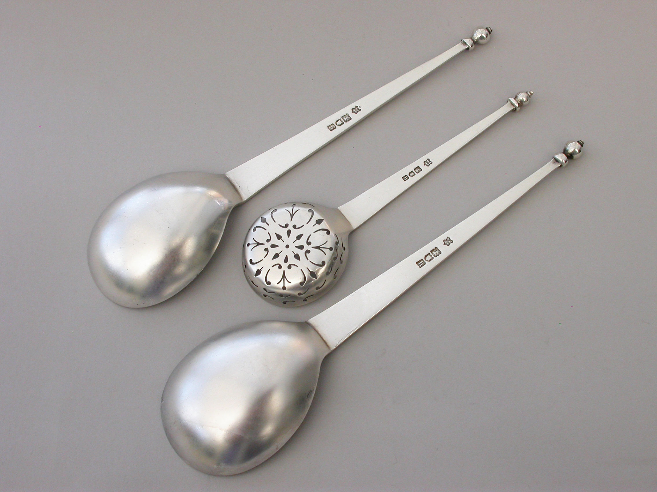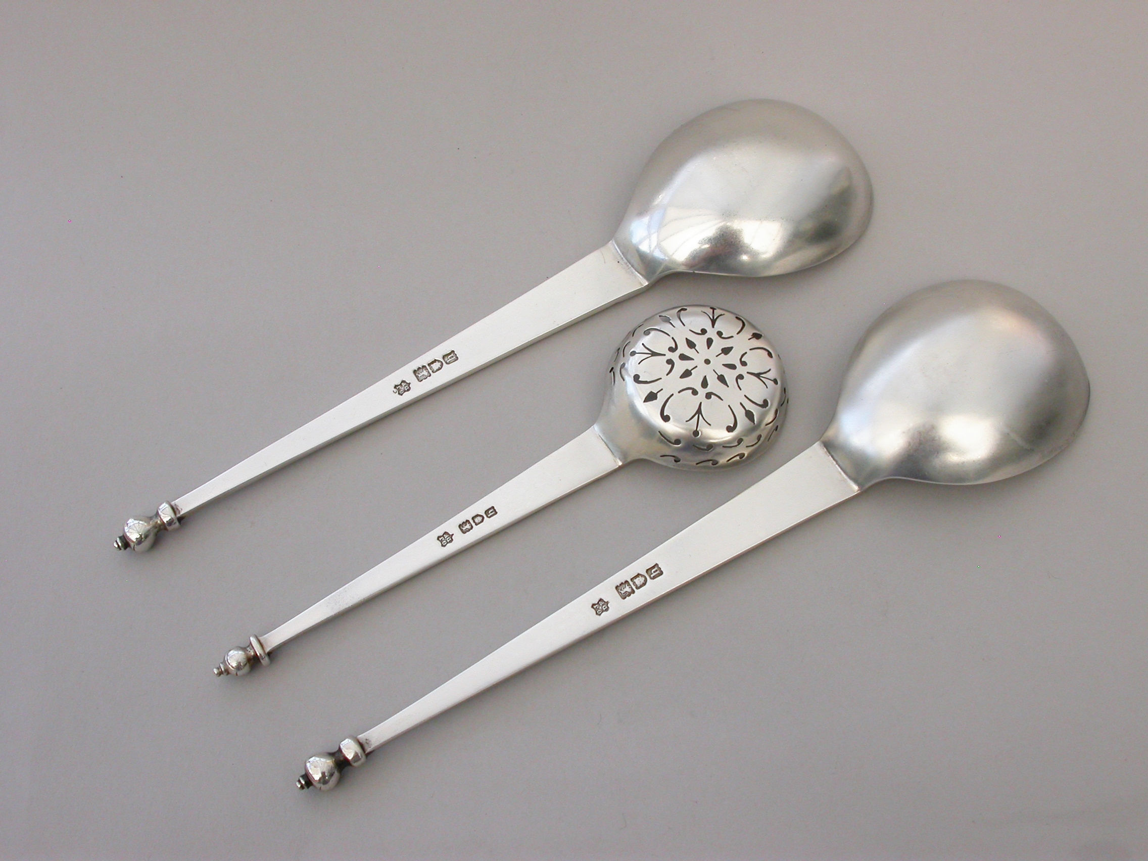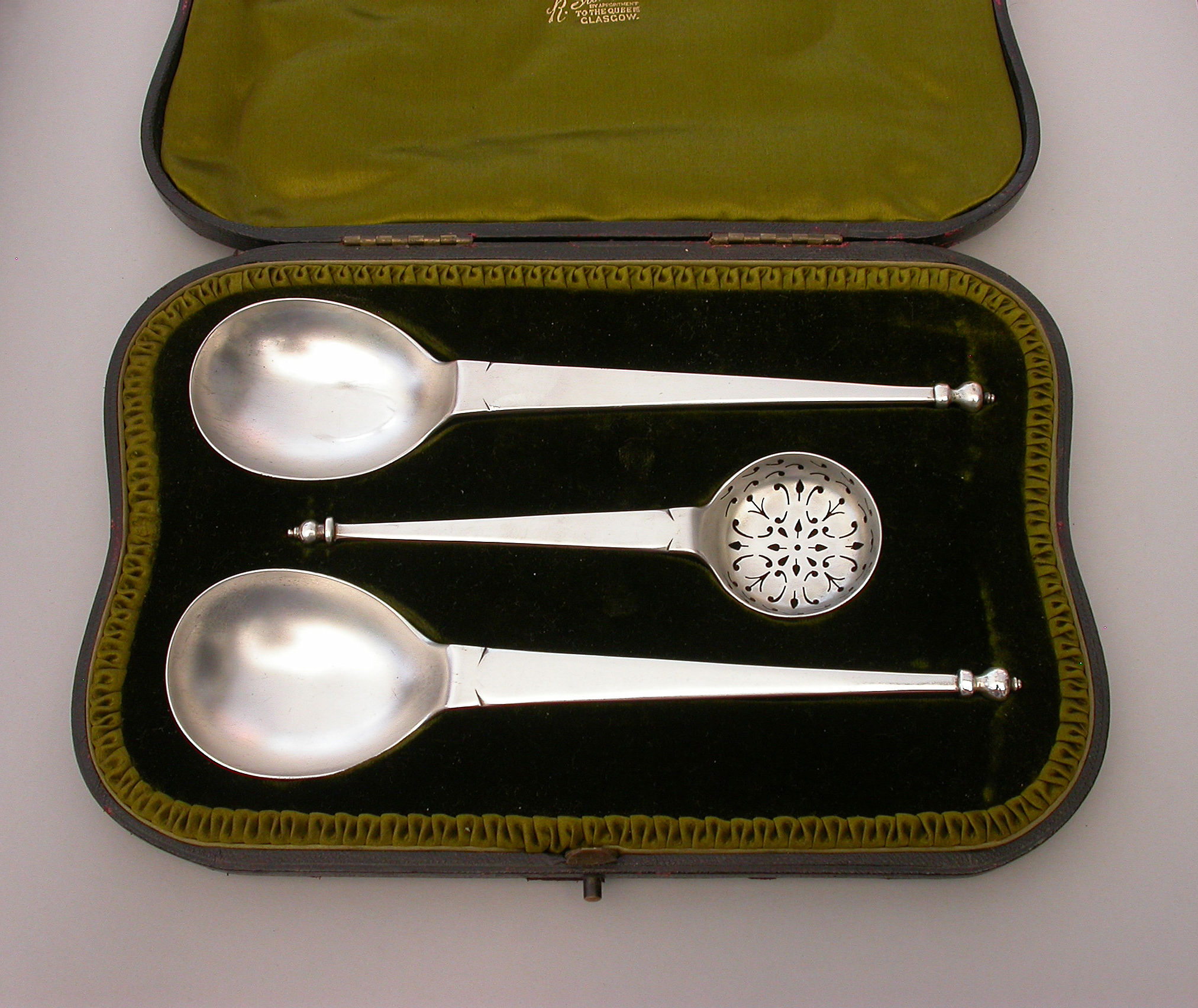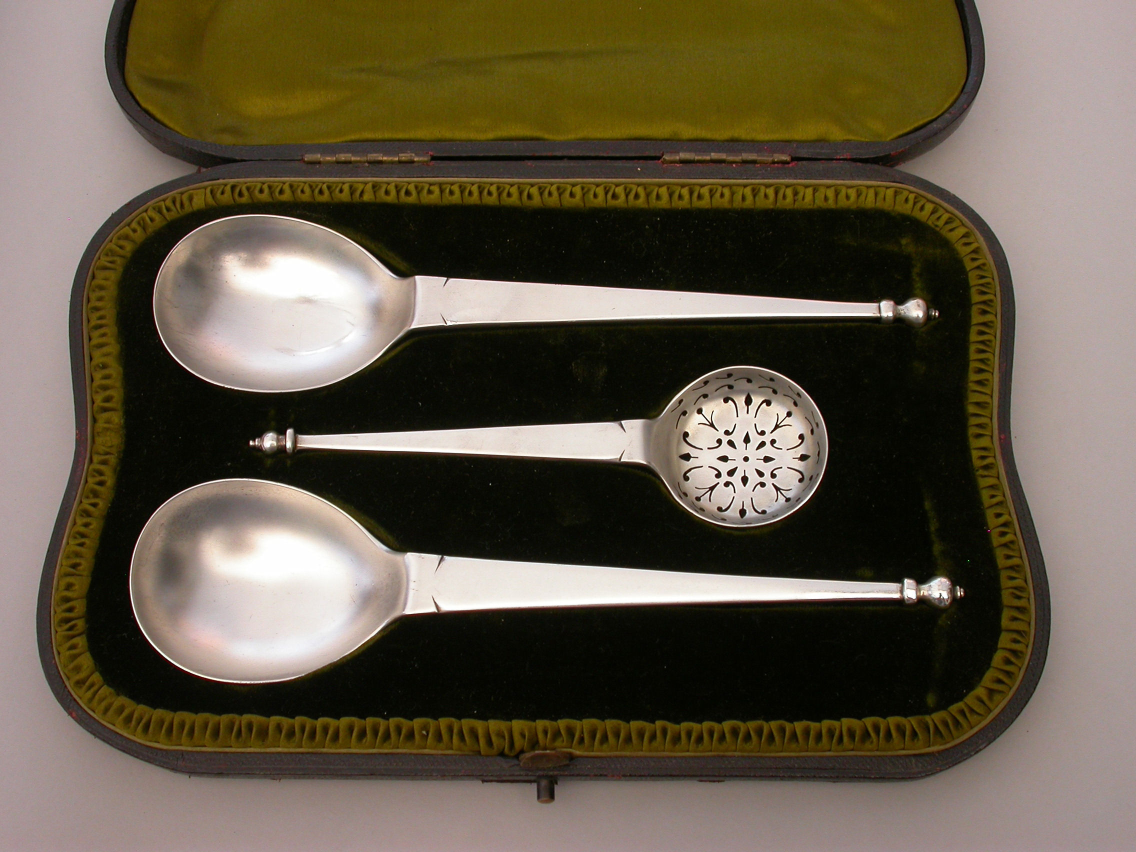 An early 20th century cased pair of Arts & Crafts style Fruit Serving Spoons and a Sugar Sifter, of stylish classical form with tapering handles and baluster shaped finials. Complete with original silk and velvet lined Morocco leather retailers case, for R Stewart of Glasgow.
