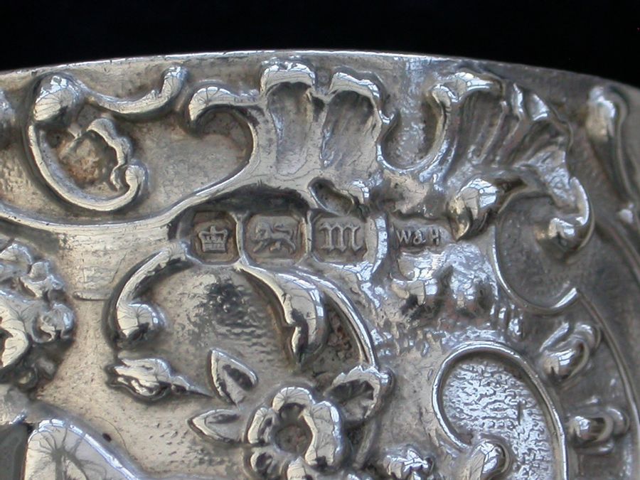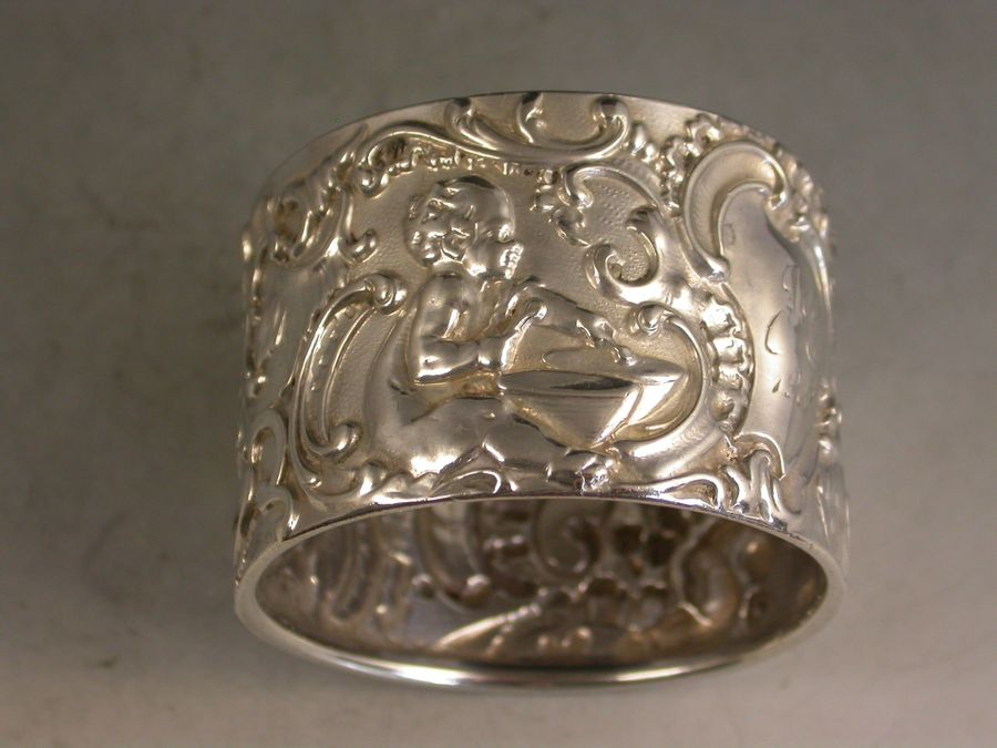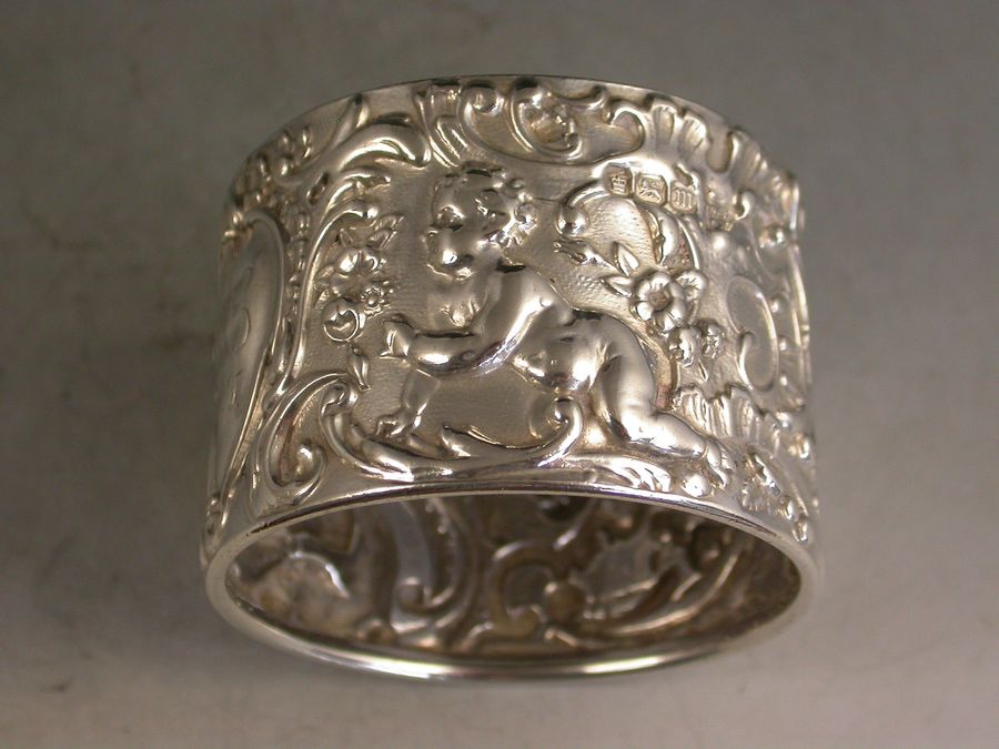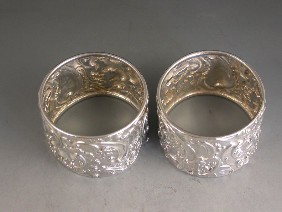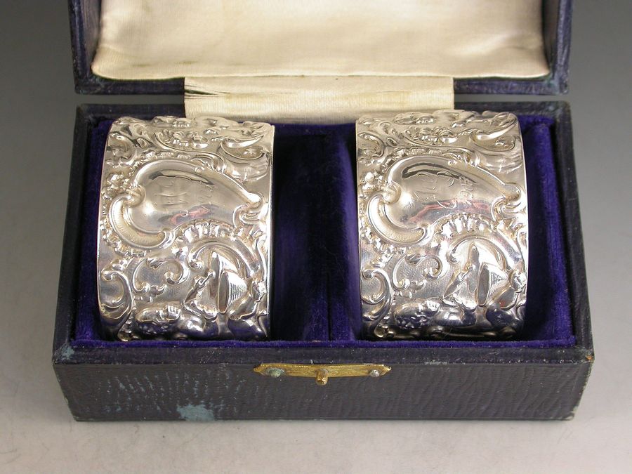A good cased pair of Edwardian silver Napkin rings with chased and embossed foliate scroll decoration including Cherubs playing musical instruments. The shaped cartouches engraved with initials and dated 1905.