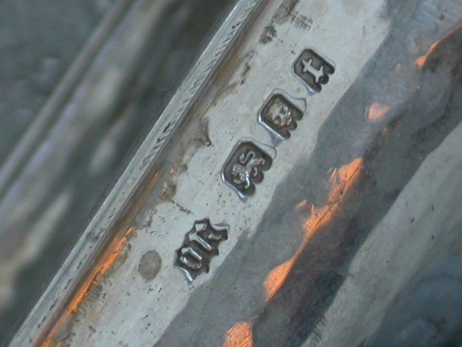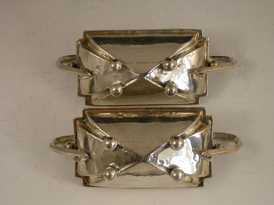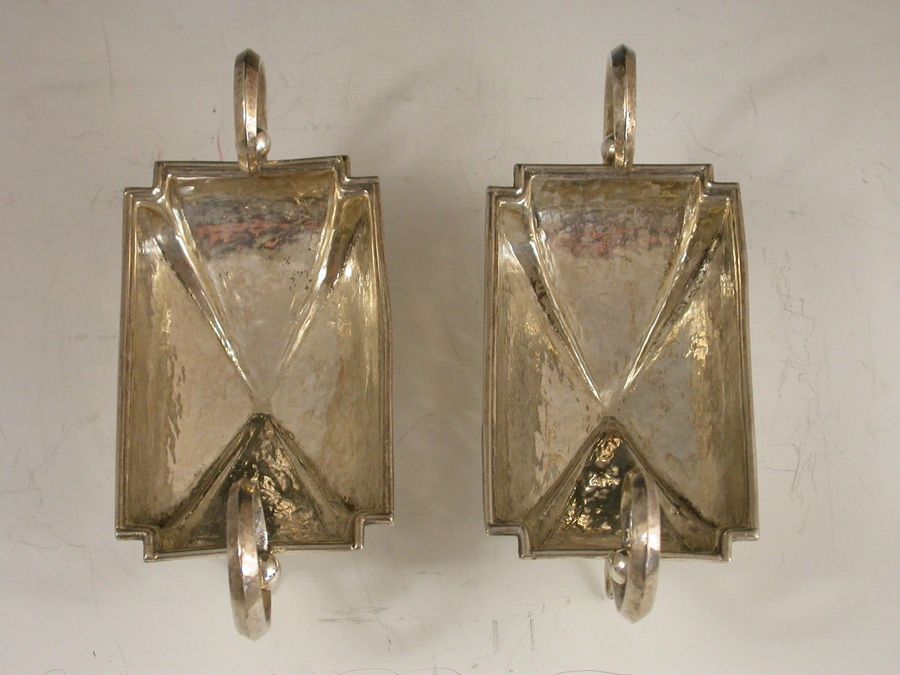 A good pair of cased George V hammered silver Salts made in the Arts & Crafts style, of shaped rectangular form with scrolled handles and four ball feet. Complete with original silk and velvet lined fitted wooden case with silver plated clasps.