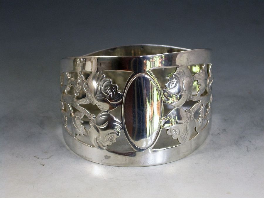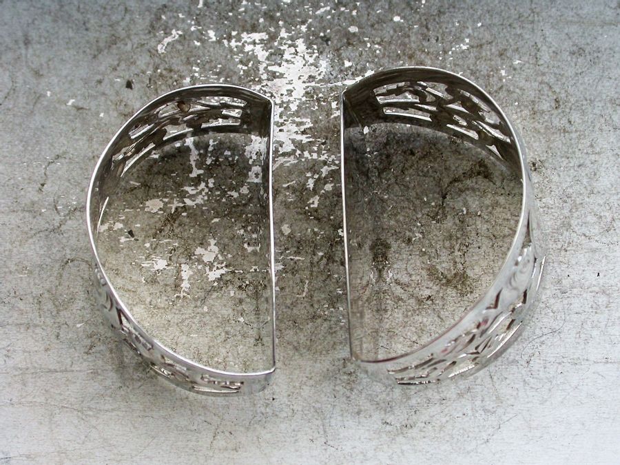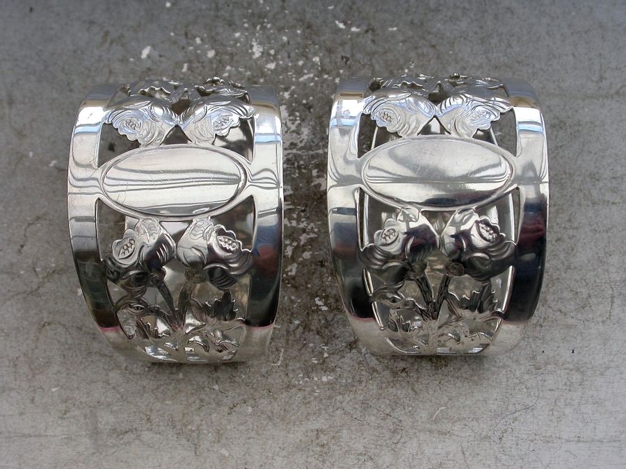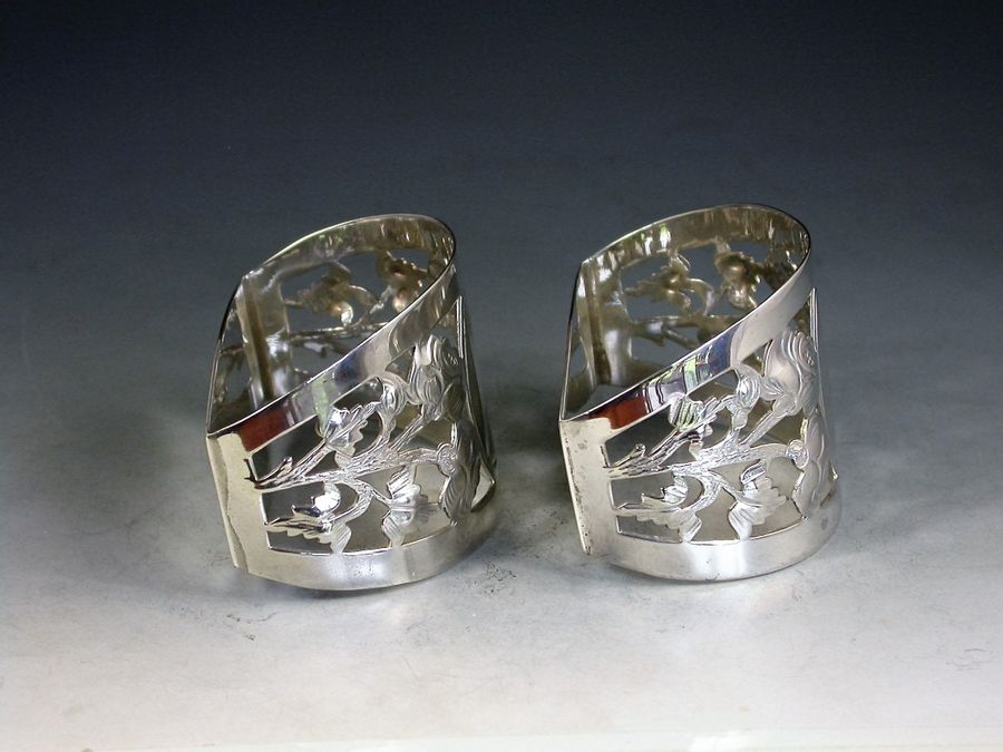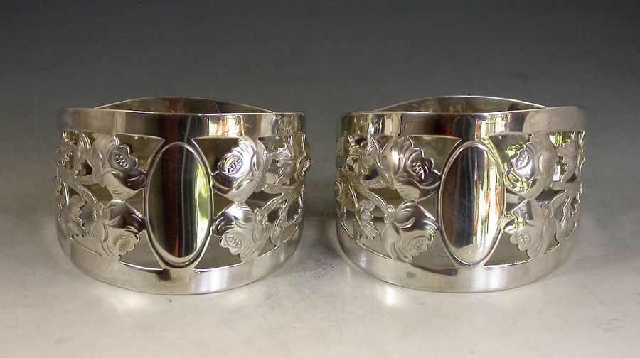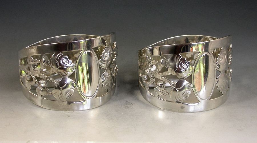 Cased Pair George V Pierced Silver Napkin Rings - English Roses