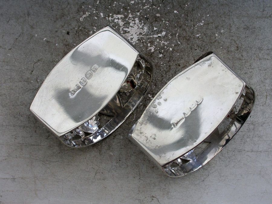 A good cased pair of George V silver Napkin Rings of stirrup shape with vacant oval cartouches, the sides pierced with roses (The National floral emblem of England).