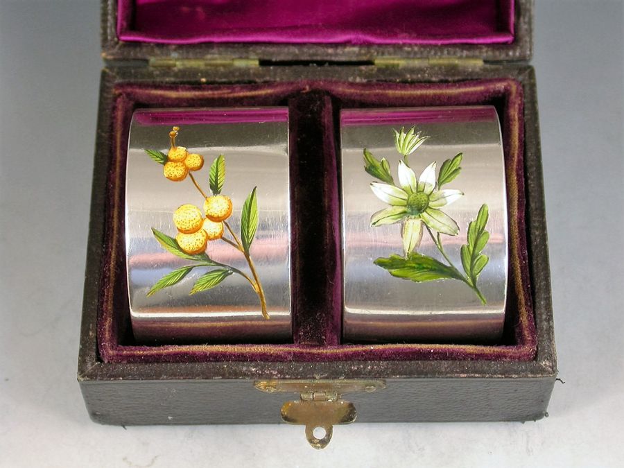 Cased Pair George V Silver & Enamel Flowers Napkin Rings