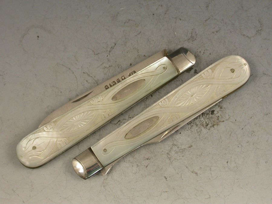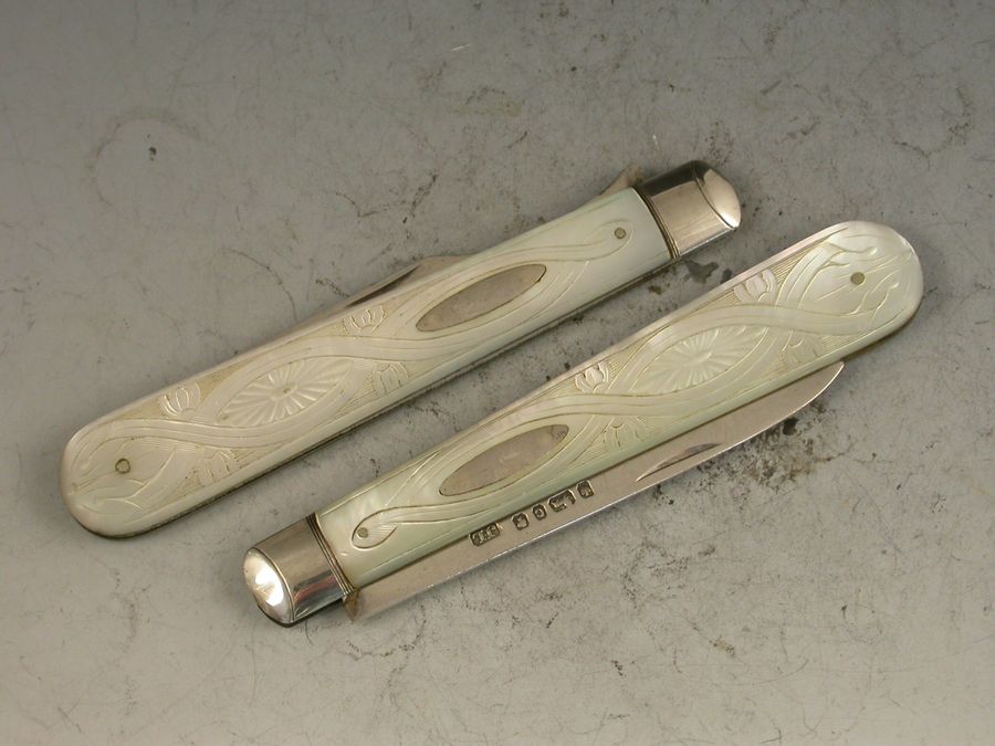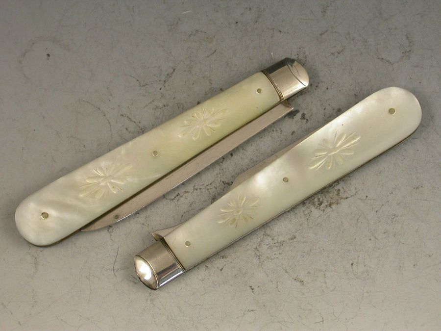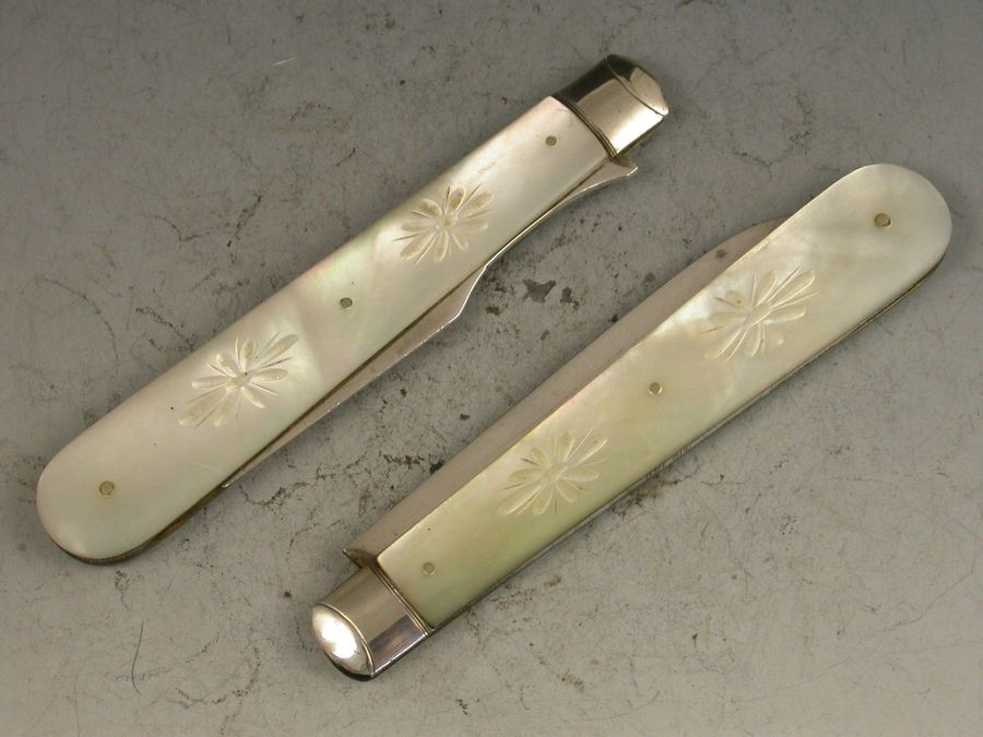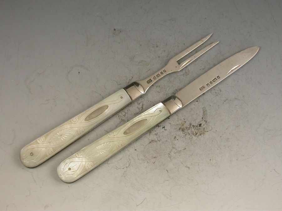 A good cased pair of Victorian silver and mother of pearl folding Fruit Knife and Fork, the mother of pearl handles engraved with strap work and foliate decoration.