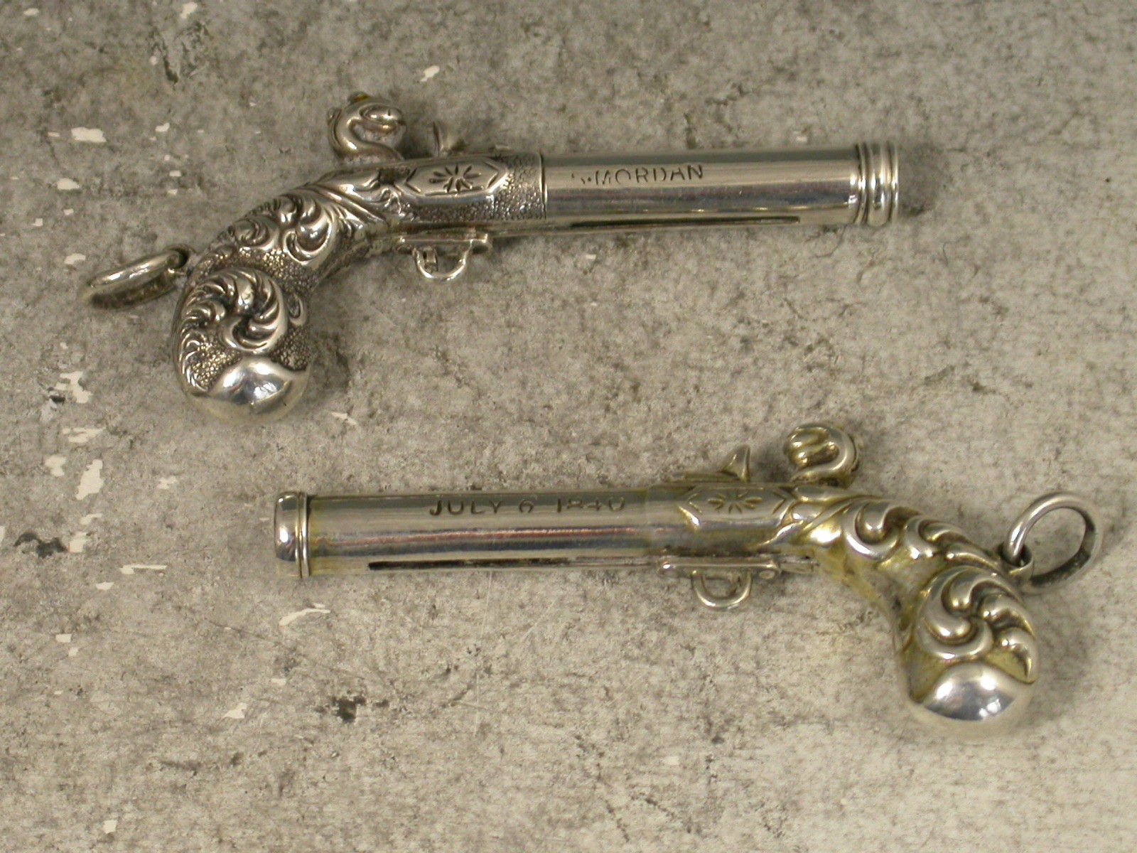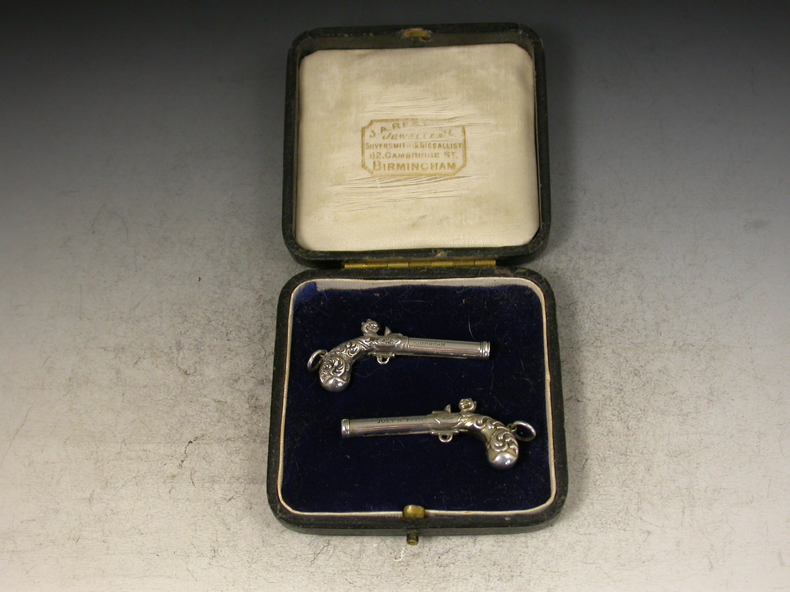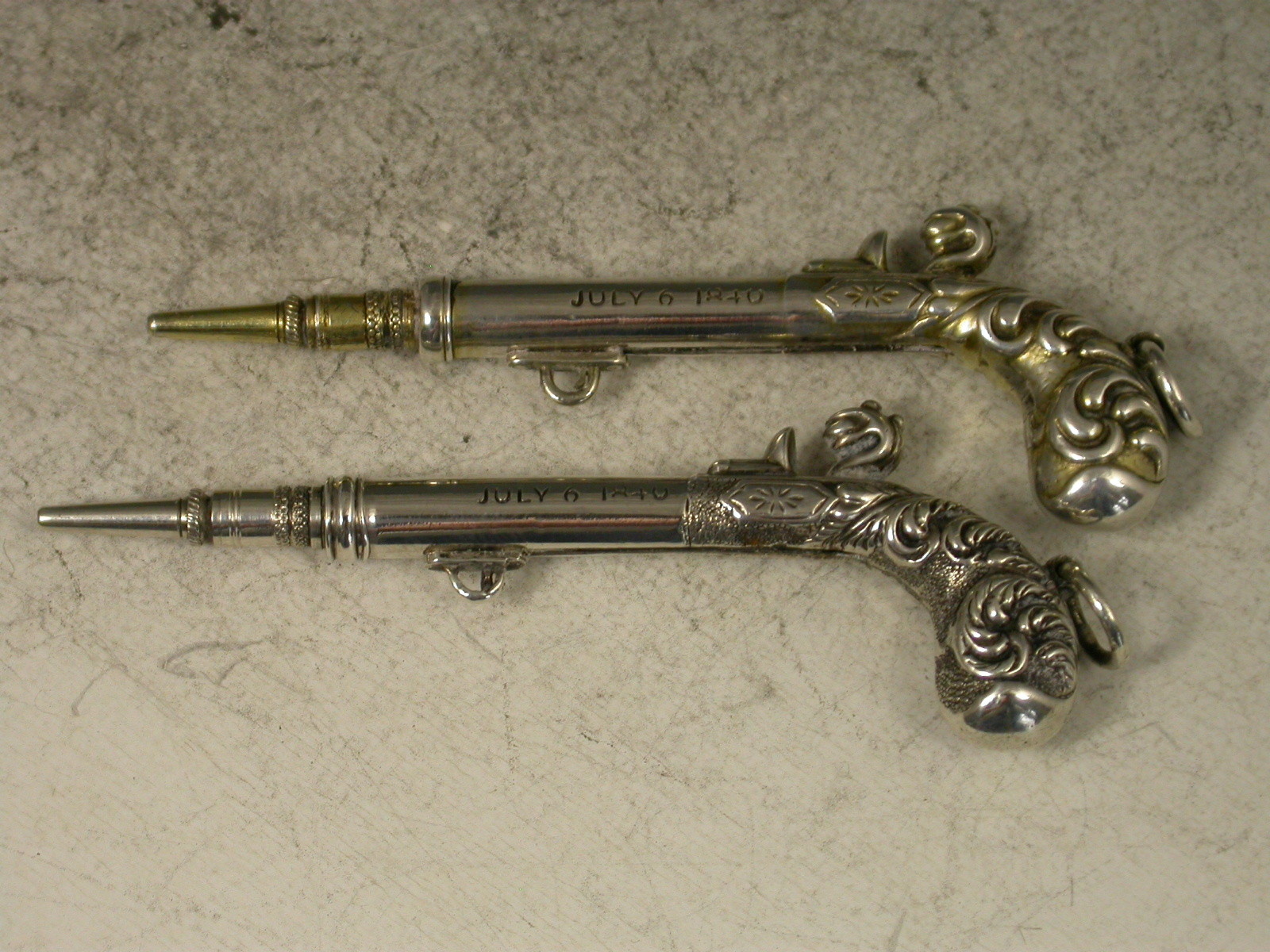 A fine and rare pair of Victorian novelty silver Propelling Pencils made in the form of Percussion Dueling Pistols, the trigger guards sliding to extend the pencil. Attached suspension rings. Complete with associated silk and velvet lined leather case. One pistol is gilded to differentiate.