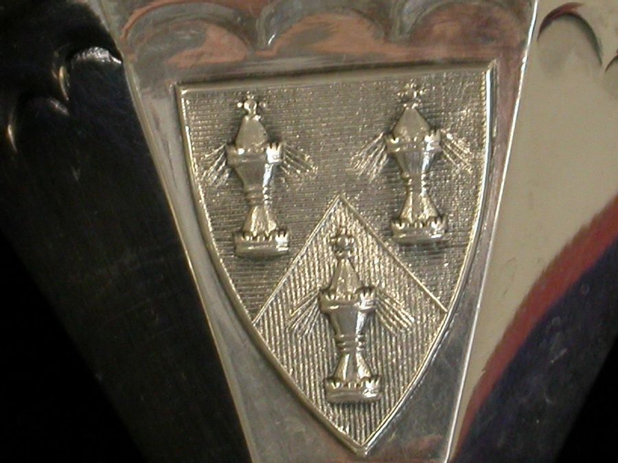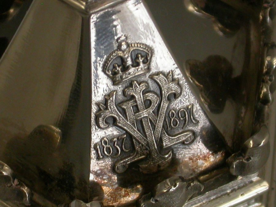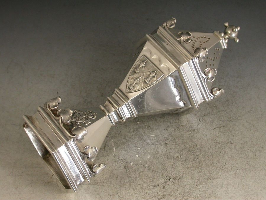 A fine quality cased pair of Victorian silver Master Salts / Peppers made in the form of the Salters' Livery Company Master Salt with their applied Coat of Arms, the bases also applied with the cypher of Queen Victoria and dated 1837-1897 (made to commemorate the Jubilee in 1897), silver gilt interiors.