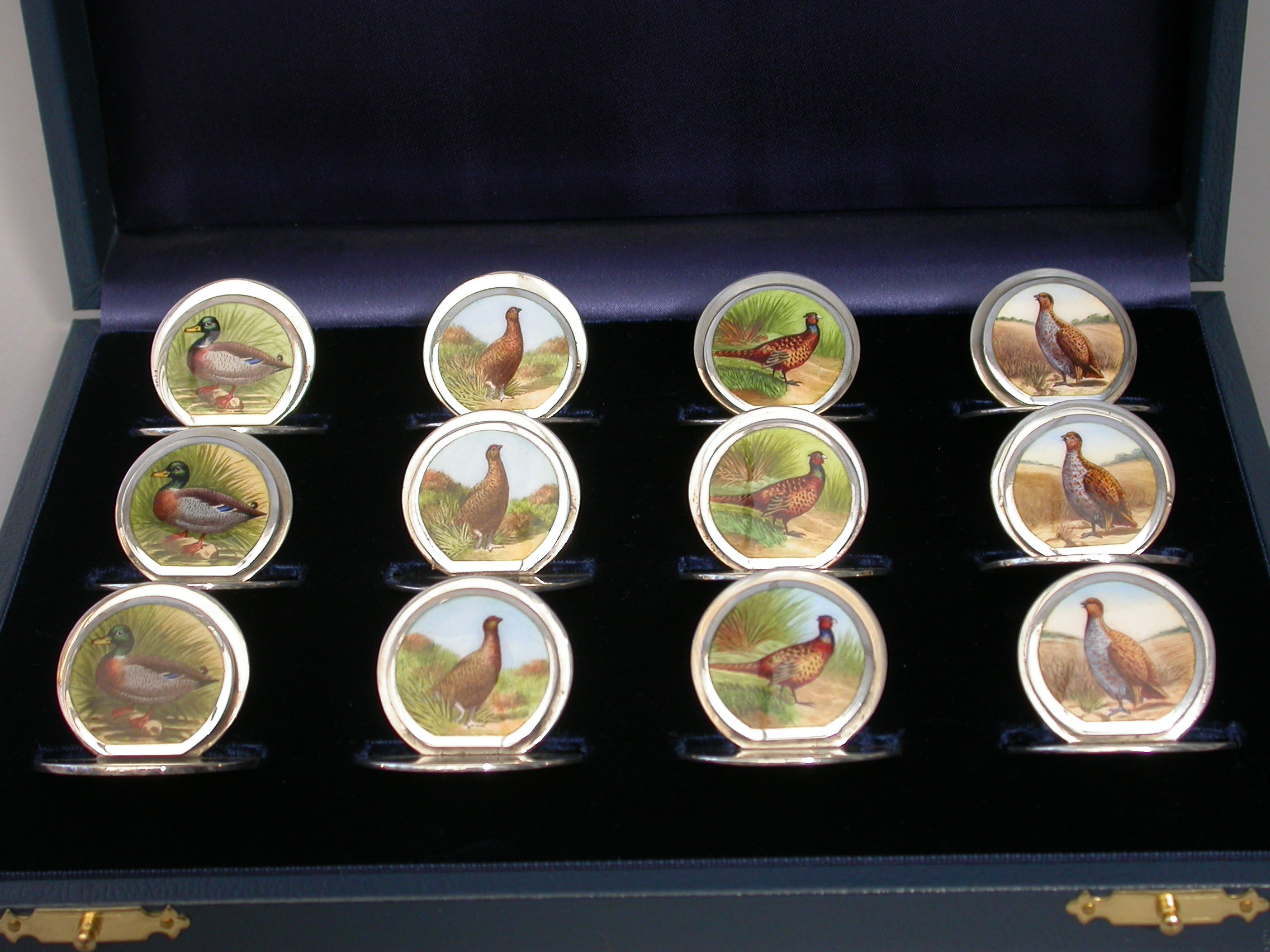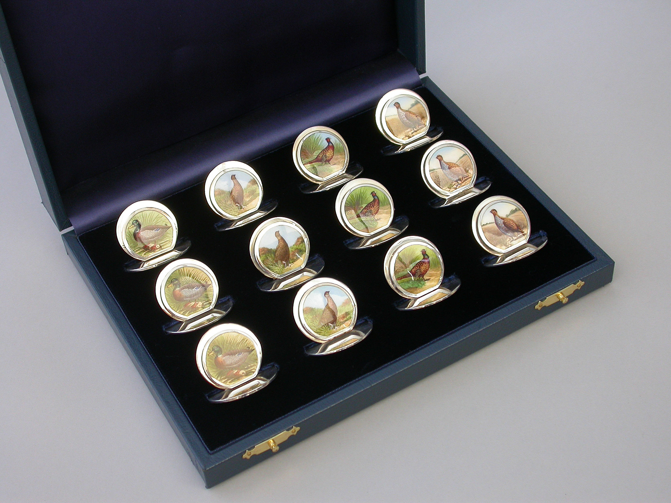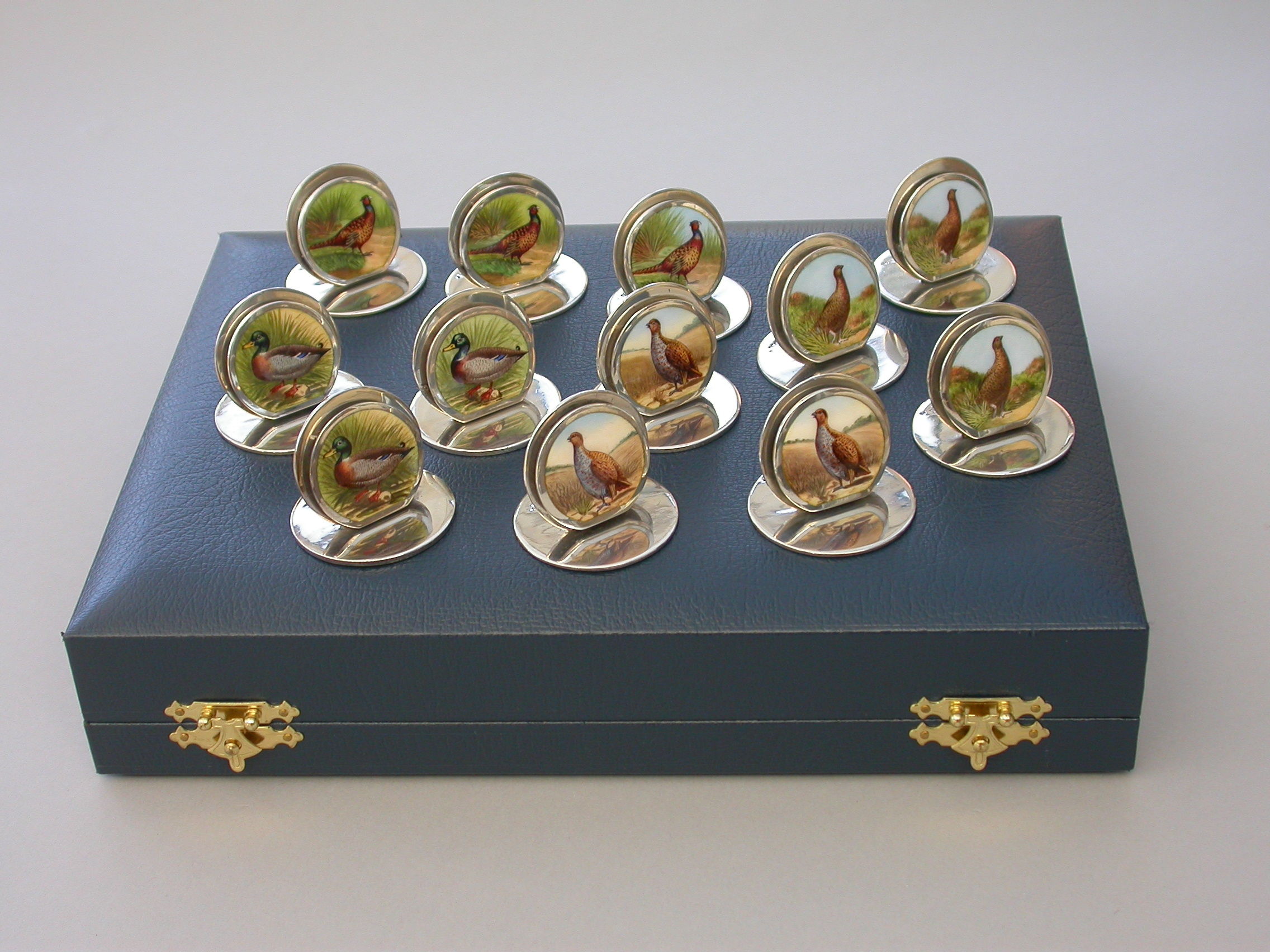 A superb composed set of 12 cased Edwardian silver and enamel Game Bird Menu Holders, of sprung double-disc form on flat circular bases. The faces finely enameled with portraits of Cock Pheasants, Drake Mallard, English Partridge and Red Grouse. All in landscape scenes.