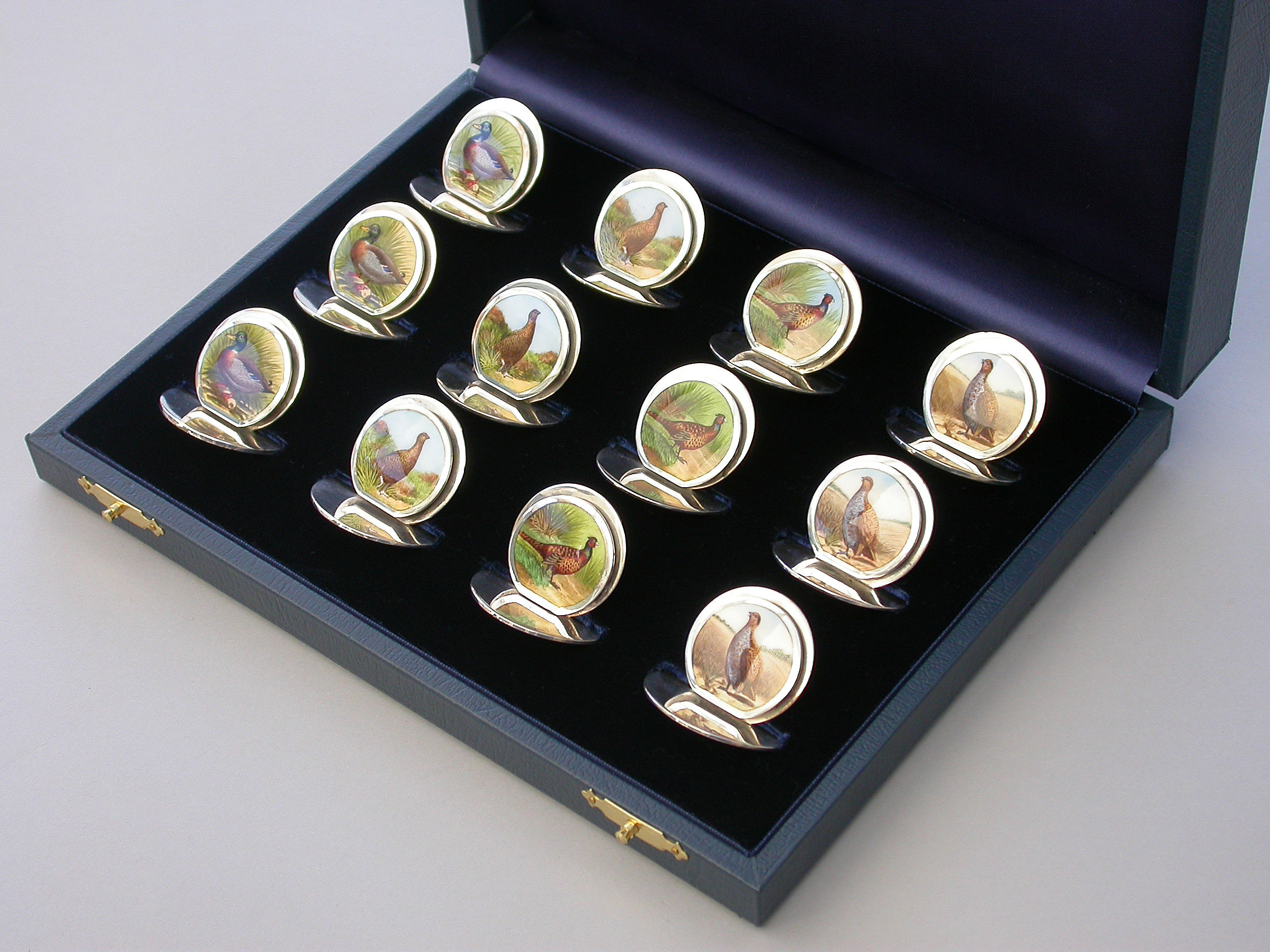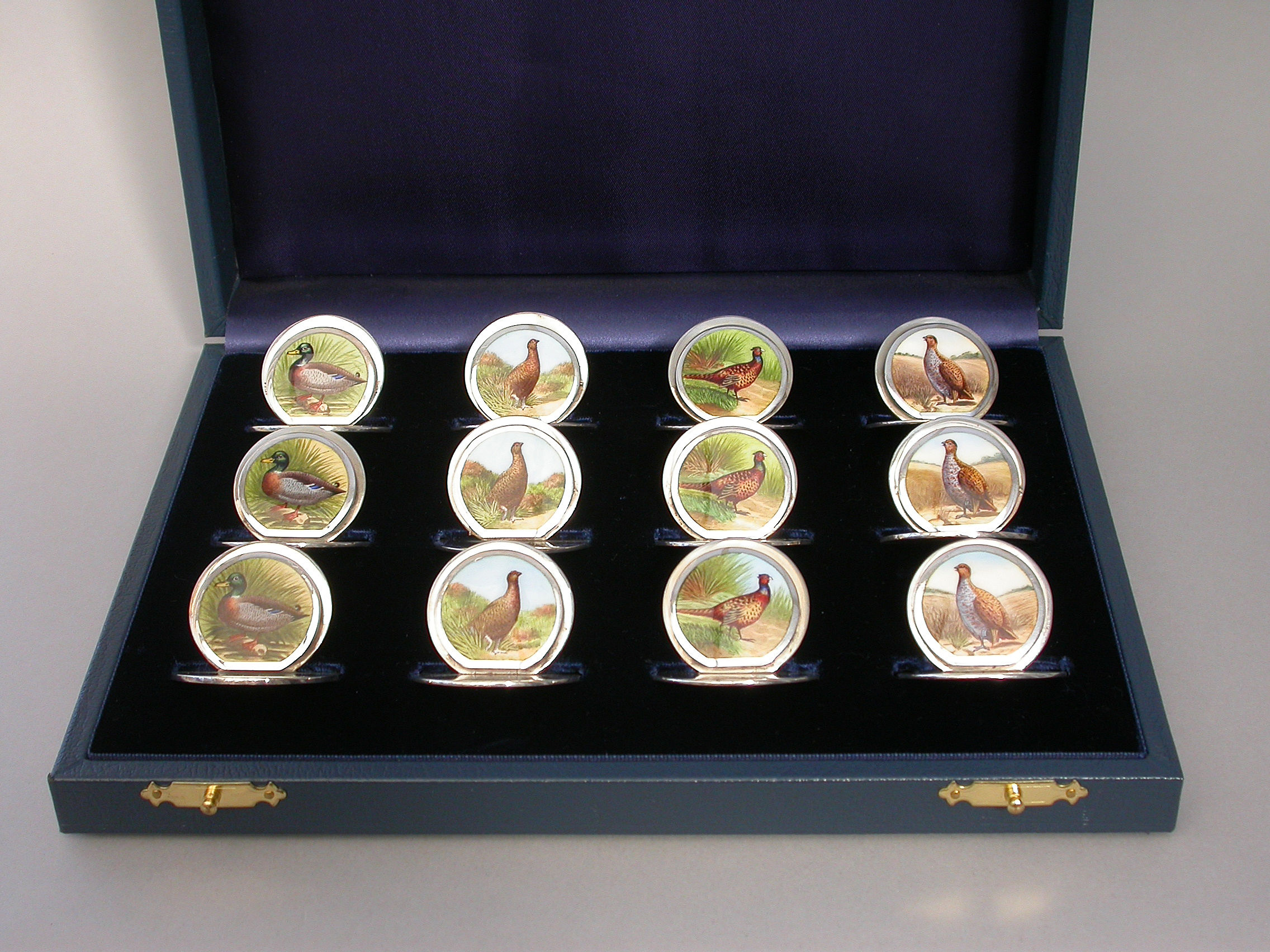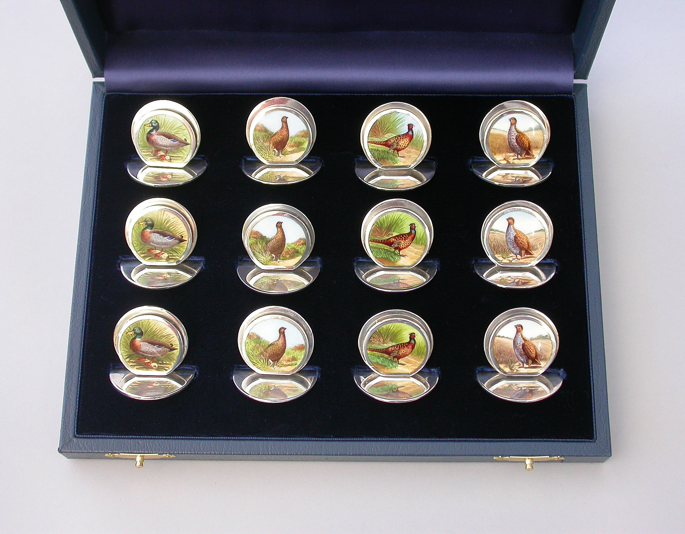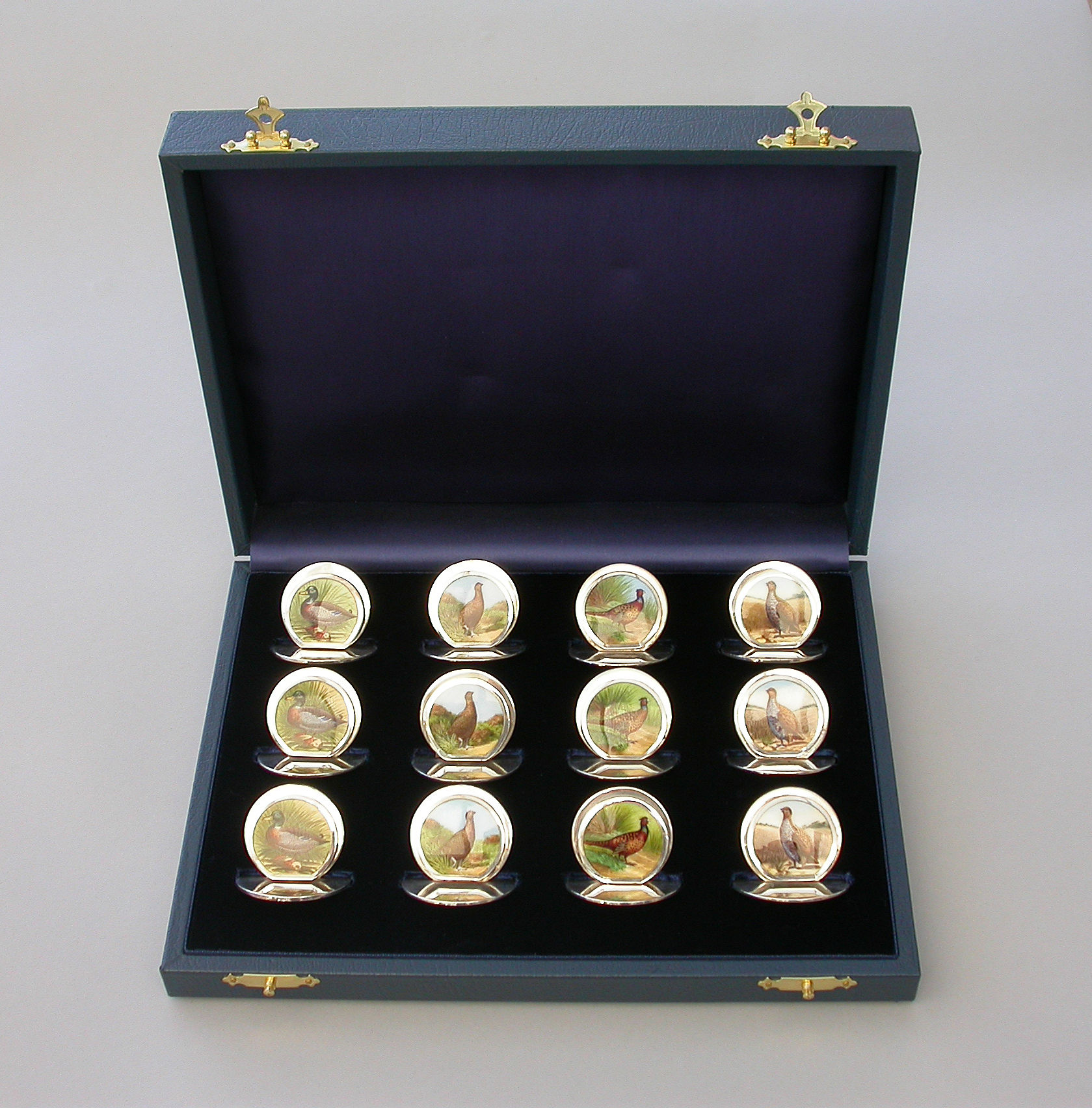A superb composed set of 12 cased Edwardian silver and enamel Game Bird Menu Holders, of sprung double-disc form on flat circular bases. The faces finely enameled with portraits of Cock Pheasants, Drake Mallard, English Partridge and Red Grouse. All in landscape scenes.