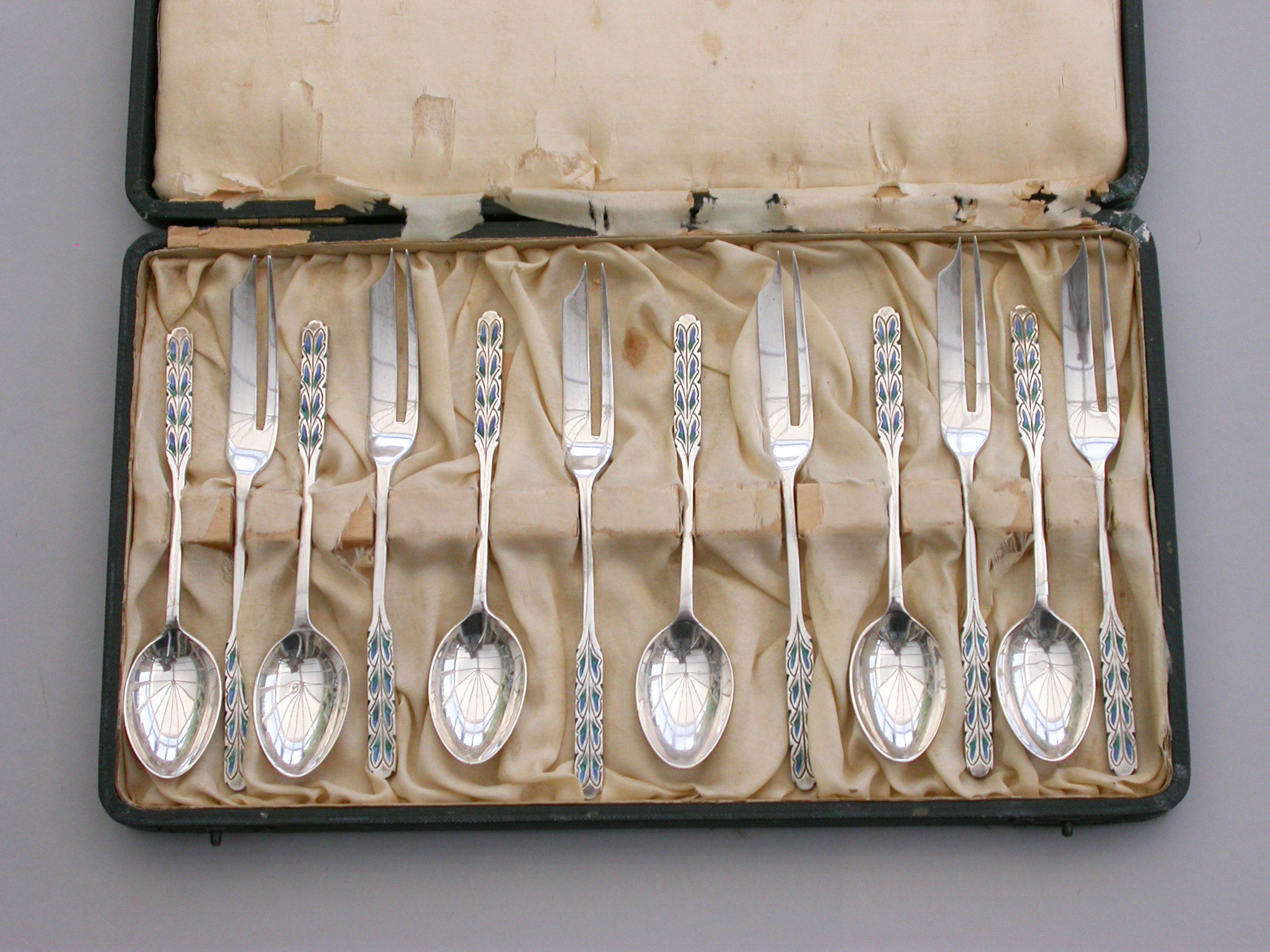 Cased Set 12 Silver & Enamel Pastry Spoons & Forks