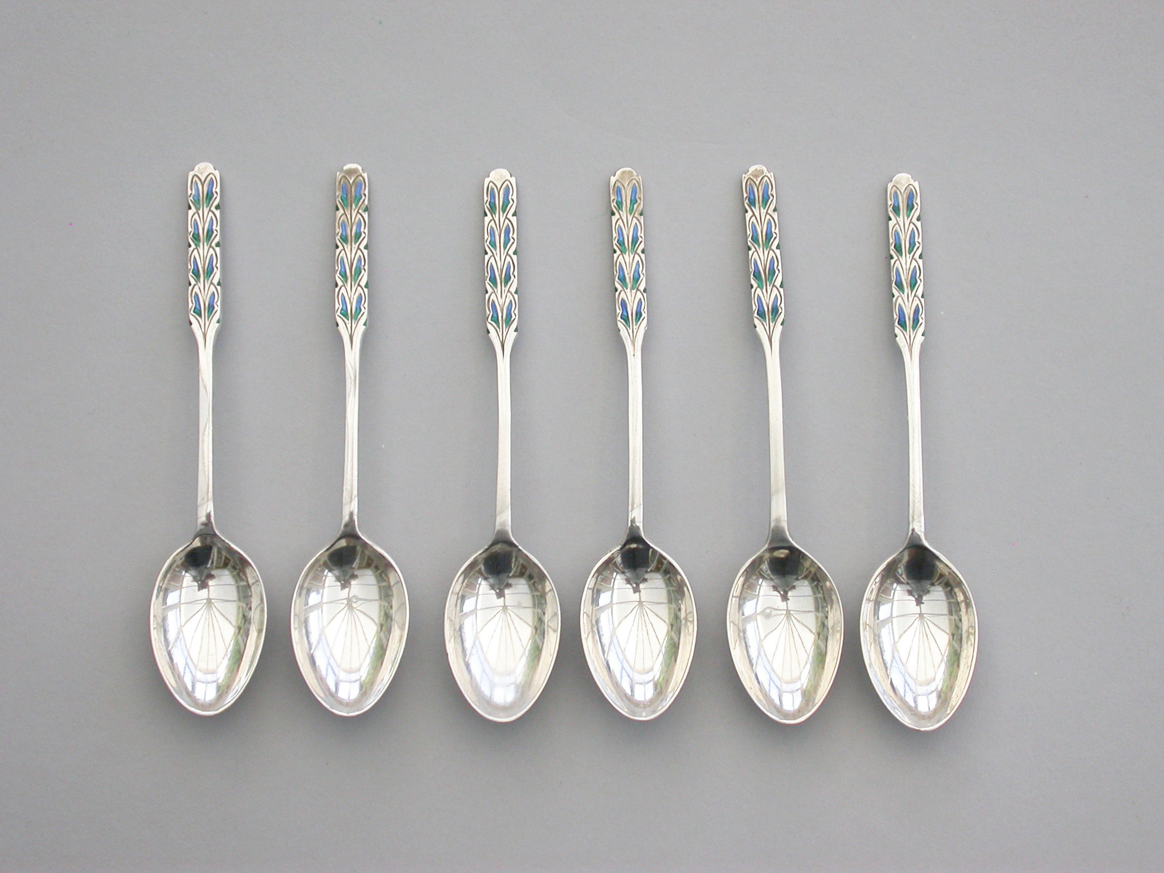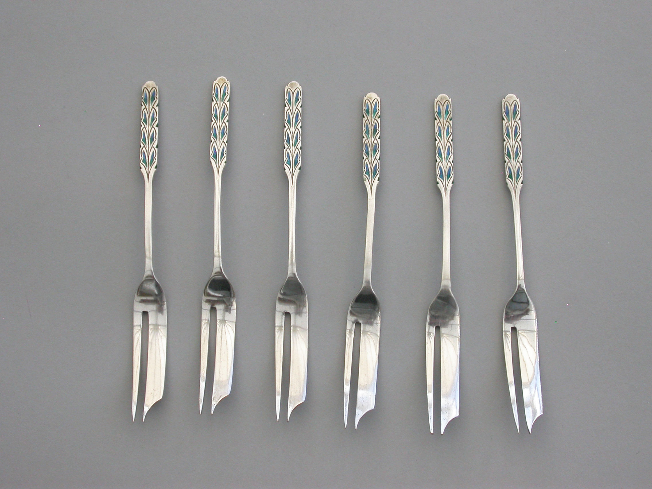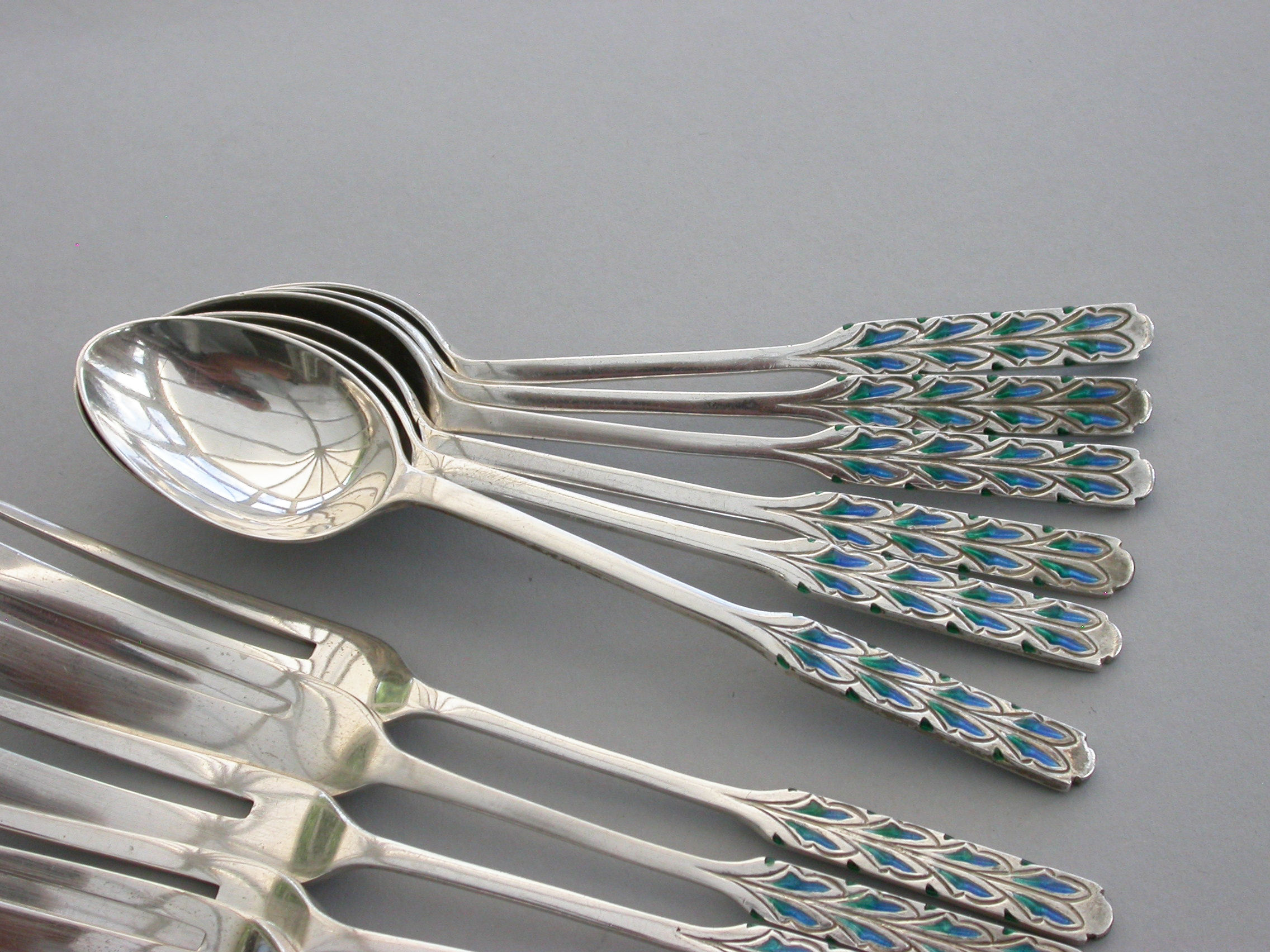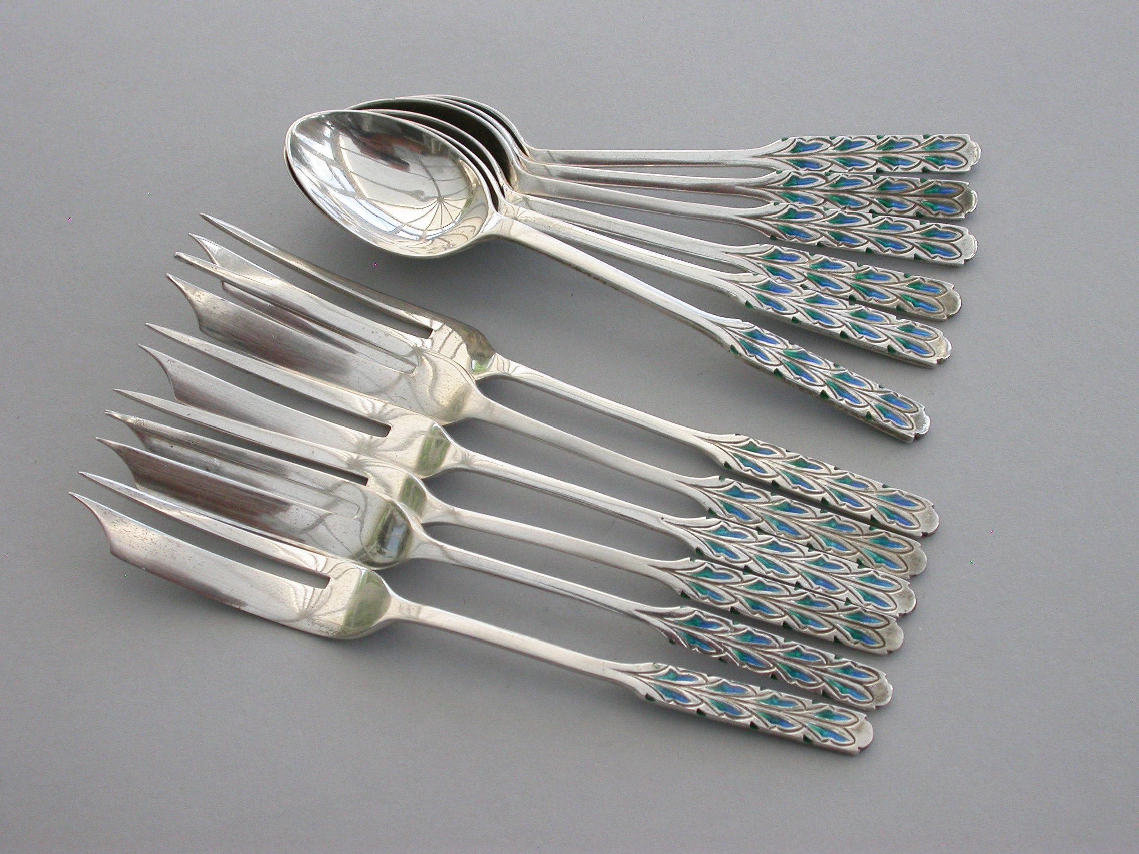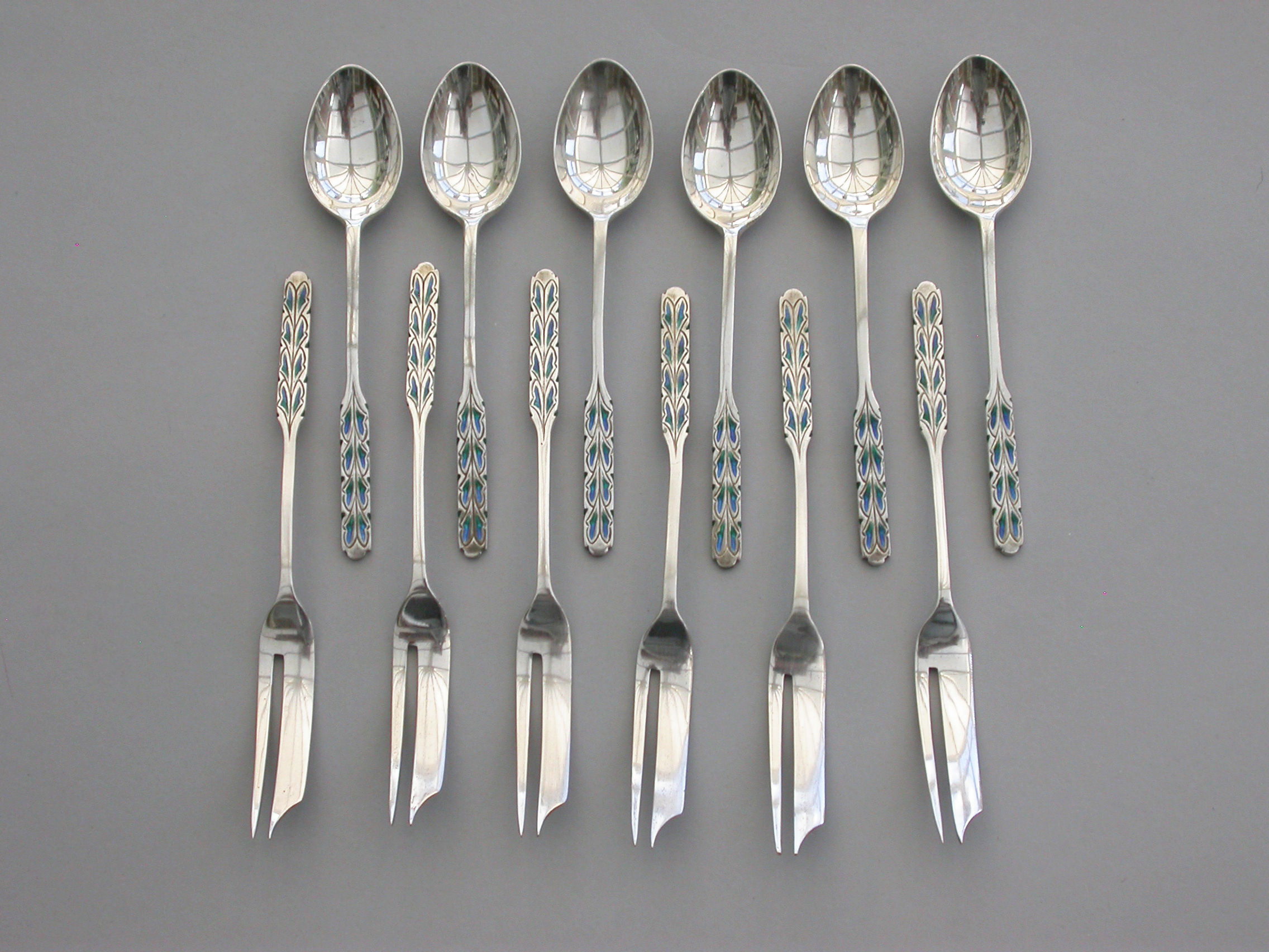 A good cased set of twelve silver and enamel Pastry Spoons and Forks, the handles decorated with a stylised fern pattern in blue and green enamels. Complete with original Liberty retailers case.
