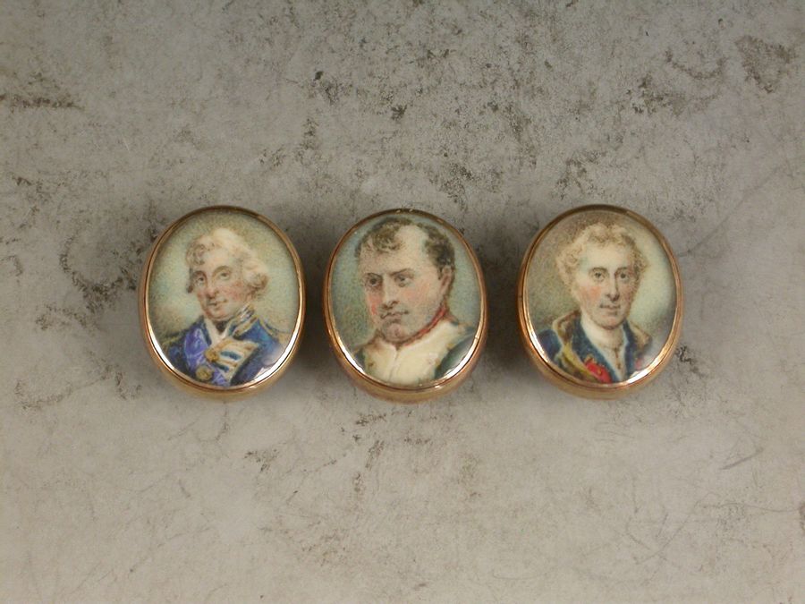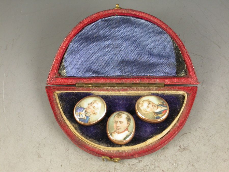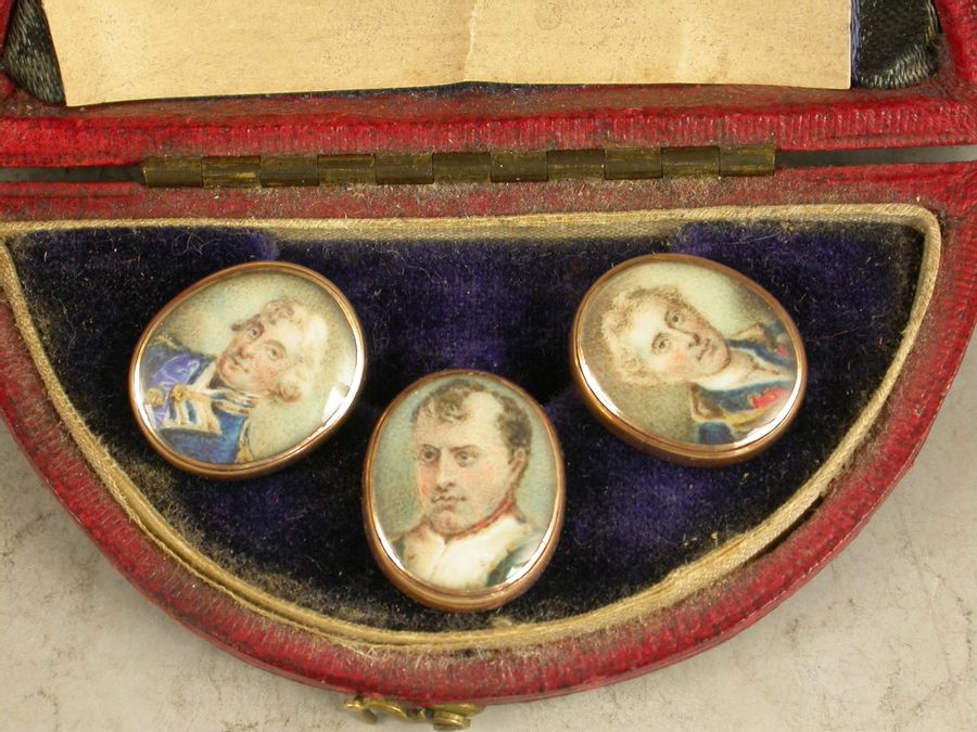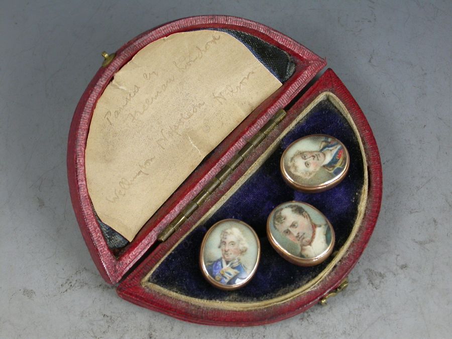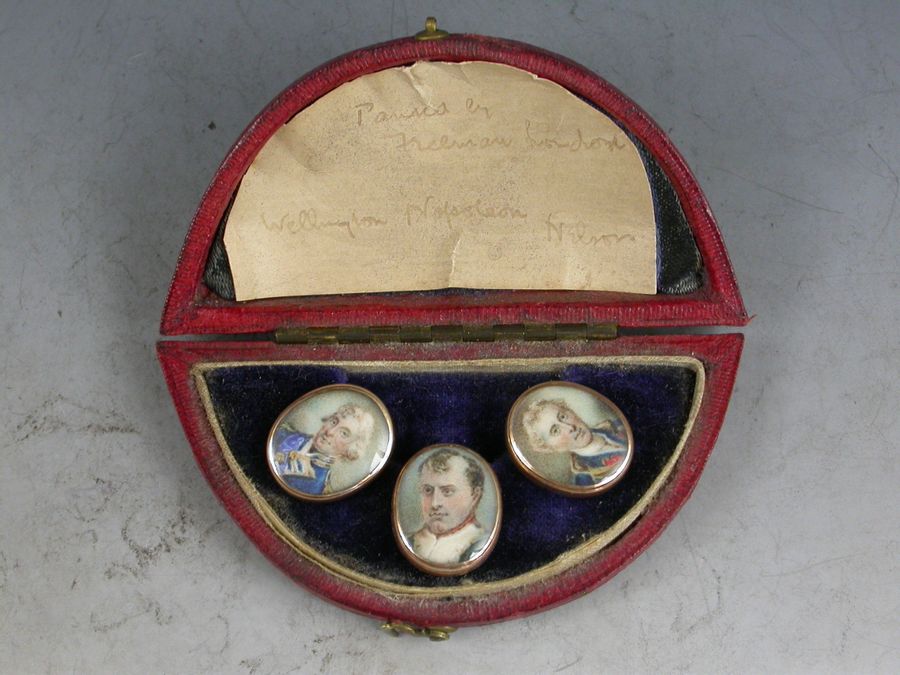 An fine cased set of three early 19th century gold Studs, each one inset with a miniature watercolour painting under glass, depicting Wellington, Napoleon and Nelson. Complete with original fitted silk and velvet lined Morocco red leather case, a slip of paper in the lid describing the studs as; ""Painted by Freeman, London"", probably referring to Samuel Freeman, Engraver of London c1805.