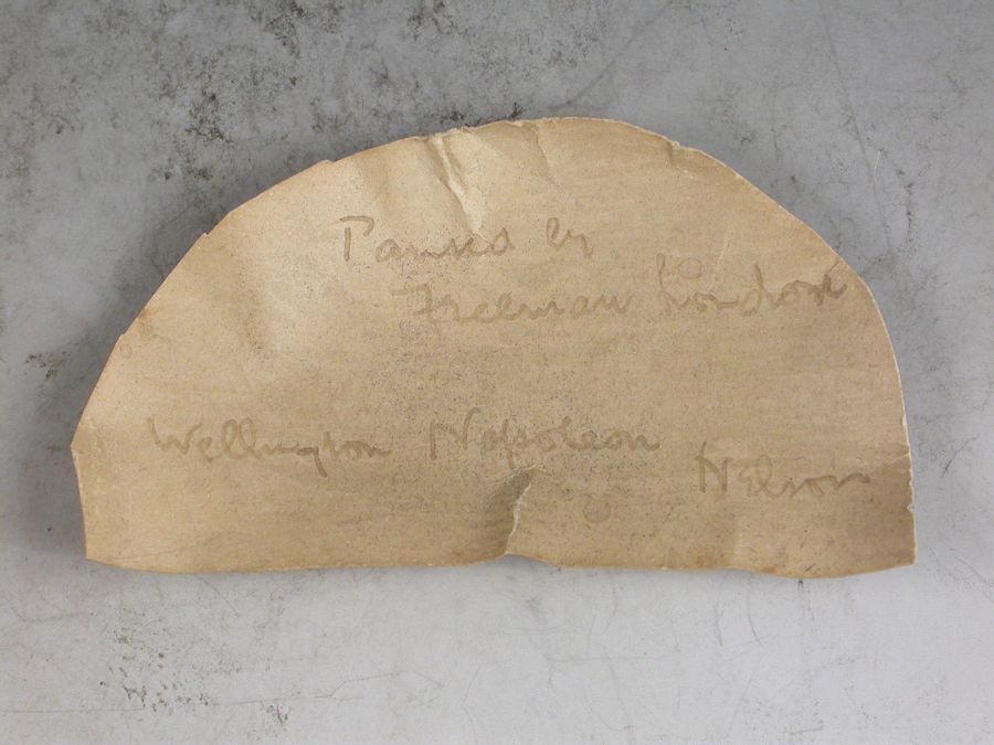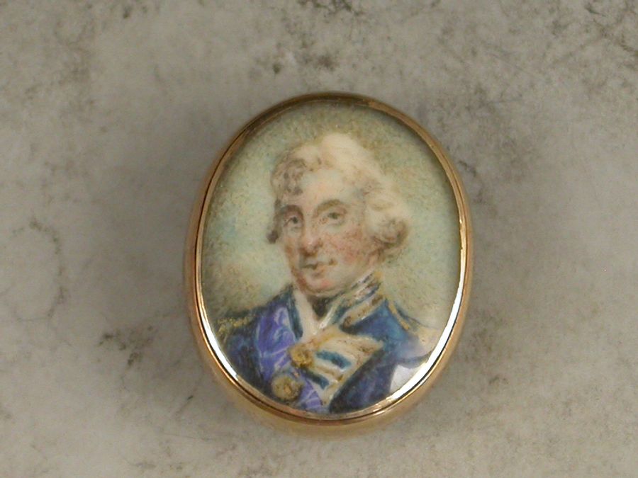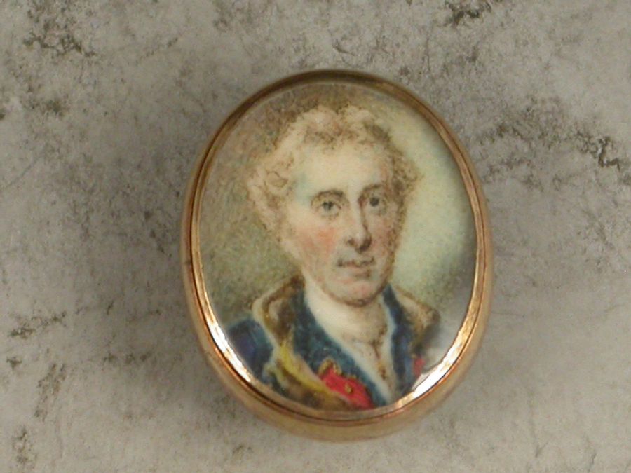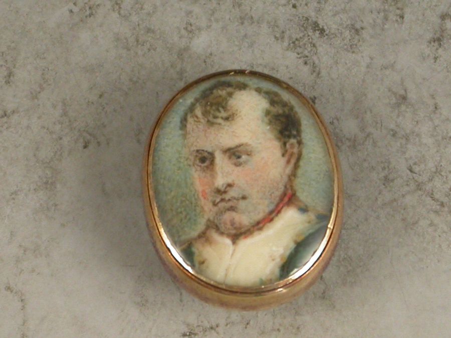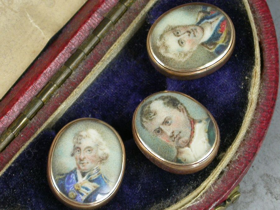 An fine cased set of three early 19th century gold Studs, each one inset with a miniature watercolour painting under glass, depicting Wellington, Napoleon and Nelson. Complete with original fitted silk and velvet lined Morocco red leather case, a slip of paper in the lid describing the studs as; ""Painted by Freeman, London"", probably referring to Samuel Freeman, Engraver of London c1805.