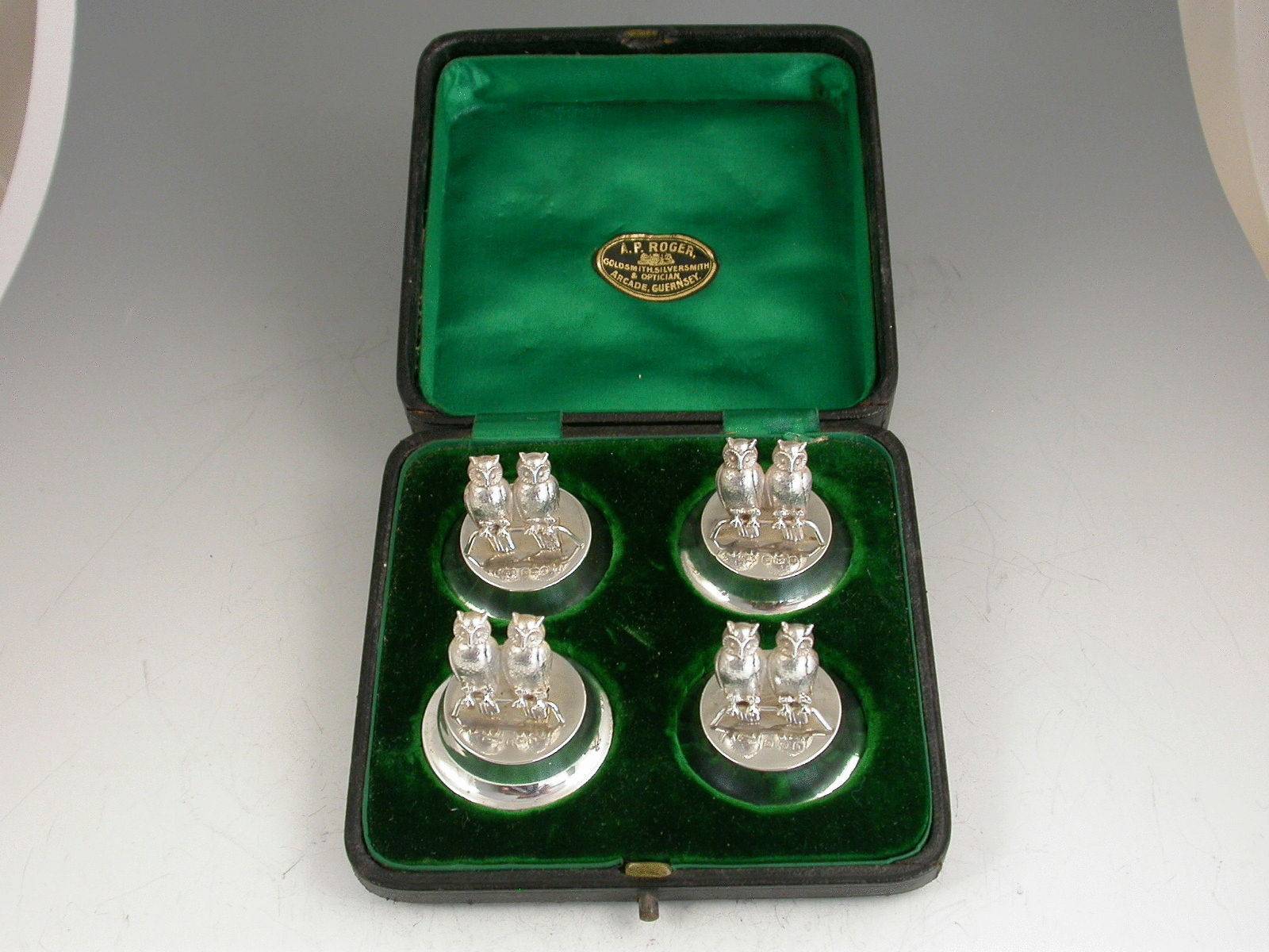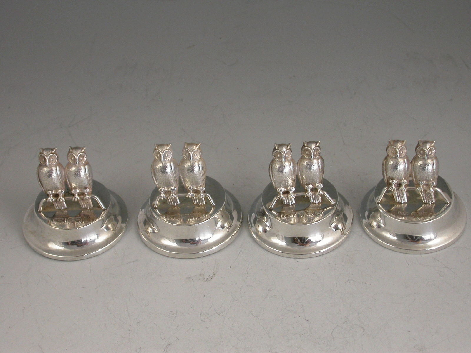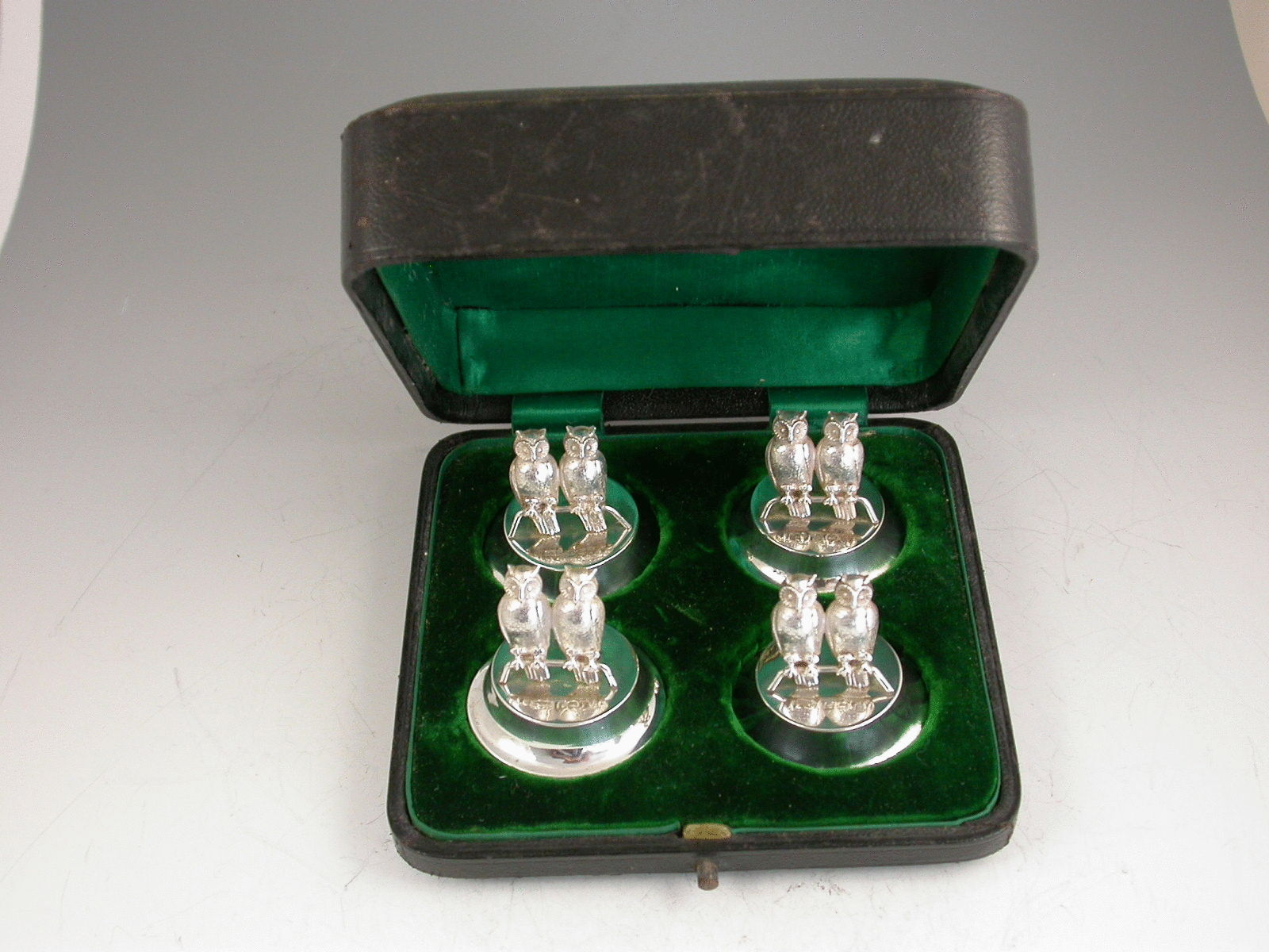 A good set of four Edwardian silver Menu holders modelled as a pair of owls sitting on a perch, on filled circular pedestal bases. Complete with original green silk and velvet lined leather case.