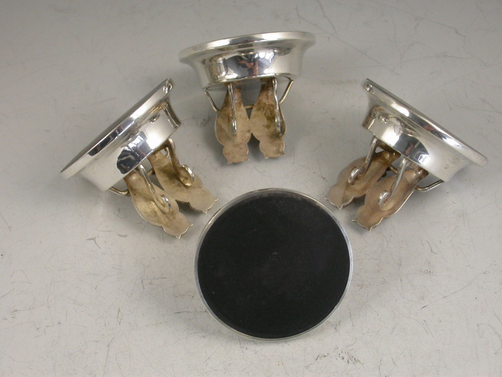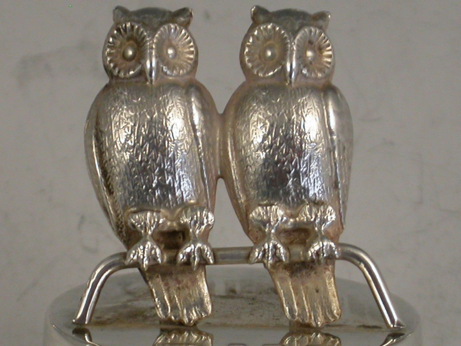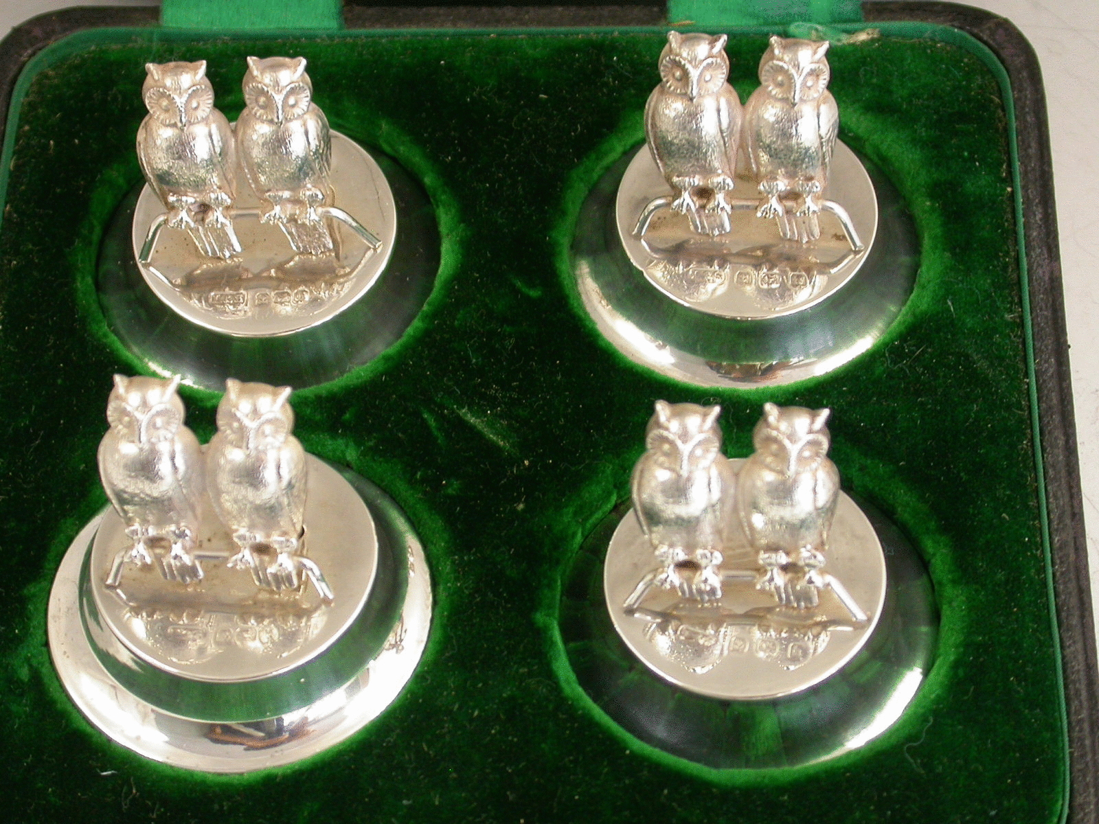 A good set of four Edwardian silver Menu holders modelled as a pair of owls sitting on a perch, on filled circular pedestal bases. Complete with original green silk and velvet lined leather case.