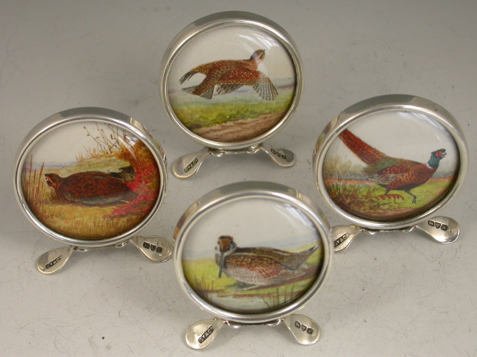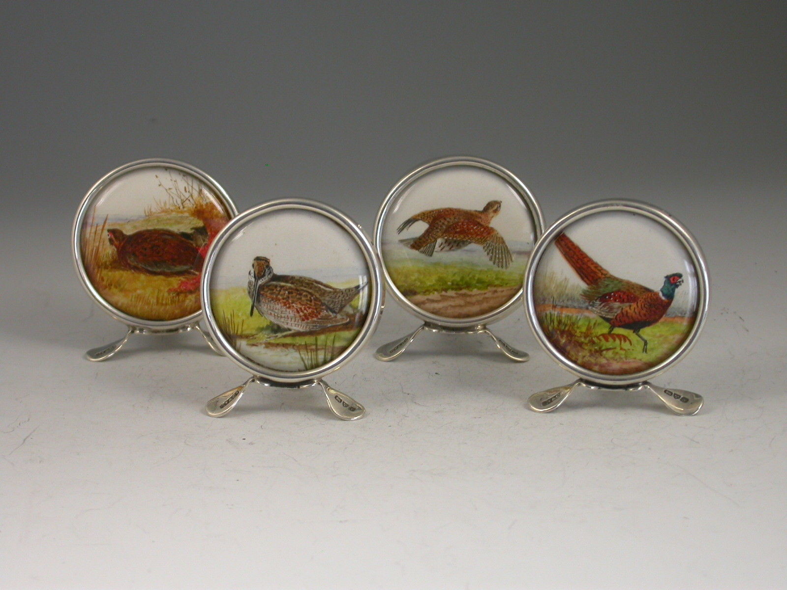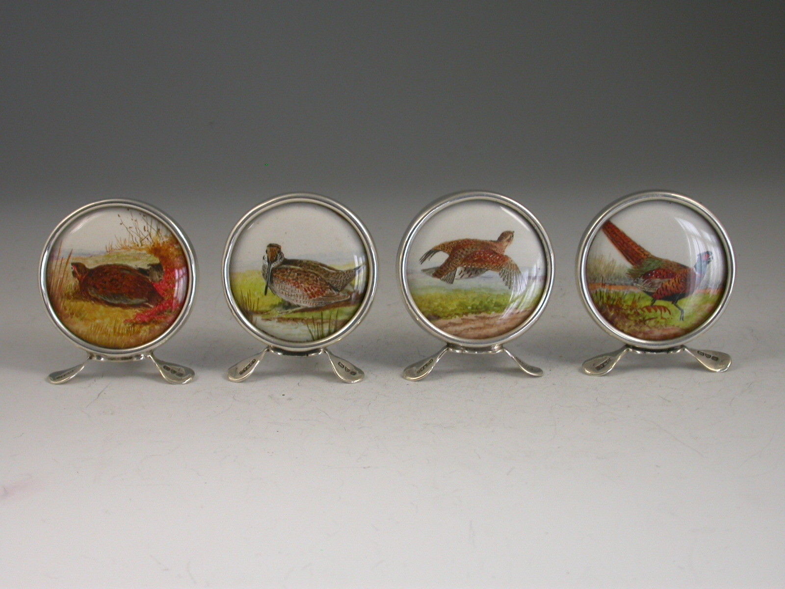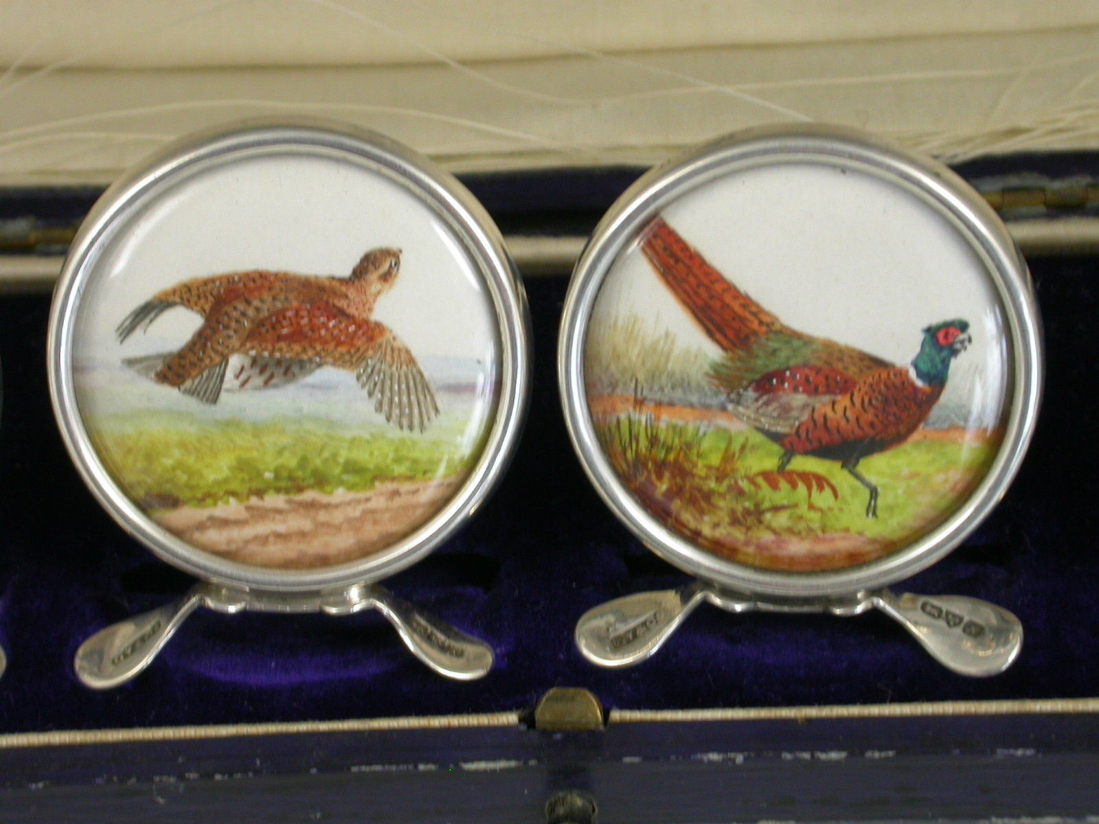 A cased set of four Edwardian silver Menu Holders of circular form standing on three splayed feet, each inset with a painted enamel disc depicting various game birds. A Cock Pheasant, a Woodcock, an English Partridge and a Grouse.